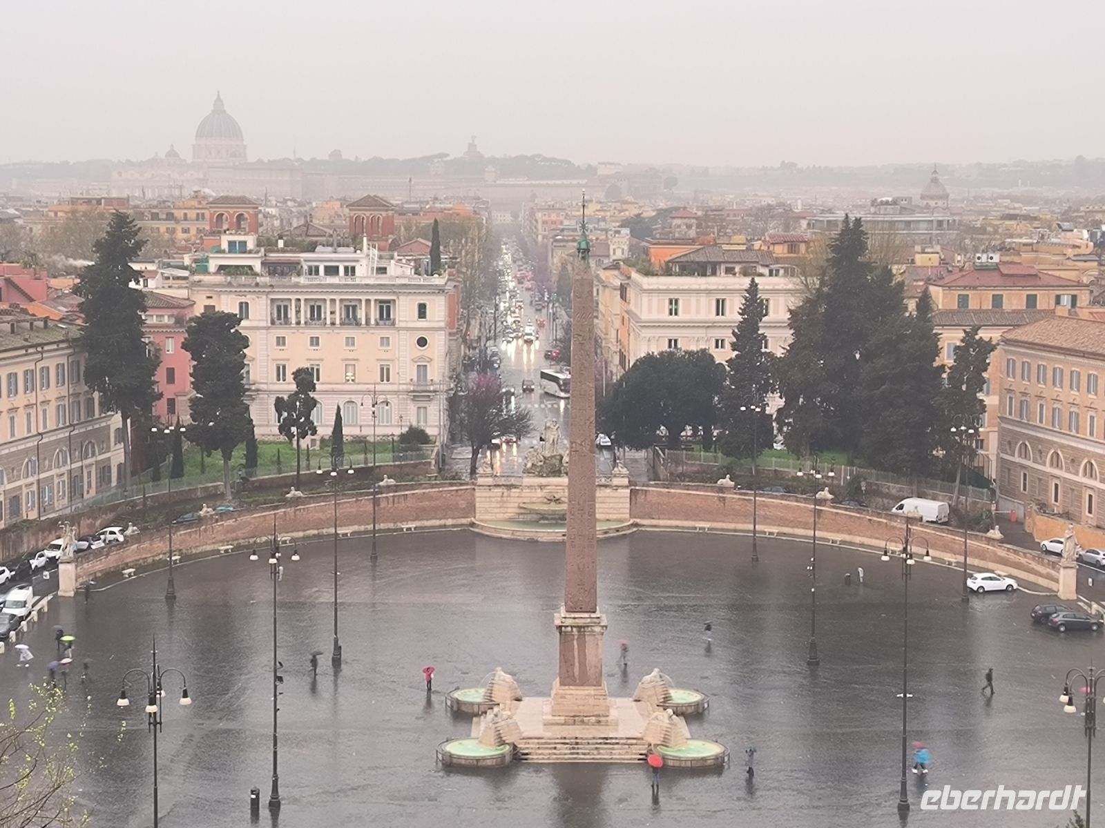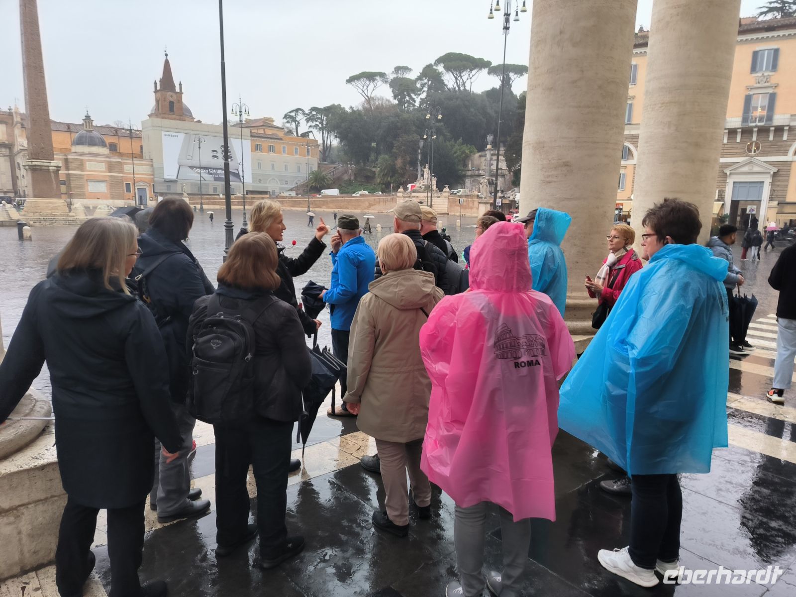 Heute gibt es ein Geburtstagskind, er bekommt ein Ständchen von der Gruppe und darf sich auf einen schönen Tag freuen. Leider regnet es in Strömen und so bestellen wir mehrere Taxis, die uns zur Piazza del Popolo bringen, wo wir Sylvia treffen. Geschäftstüchtige Händler verkaufen Schirme und Capes, so dass wir dem Regen trotzen können.