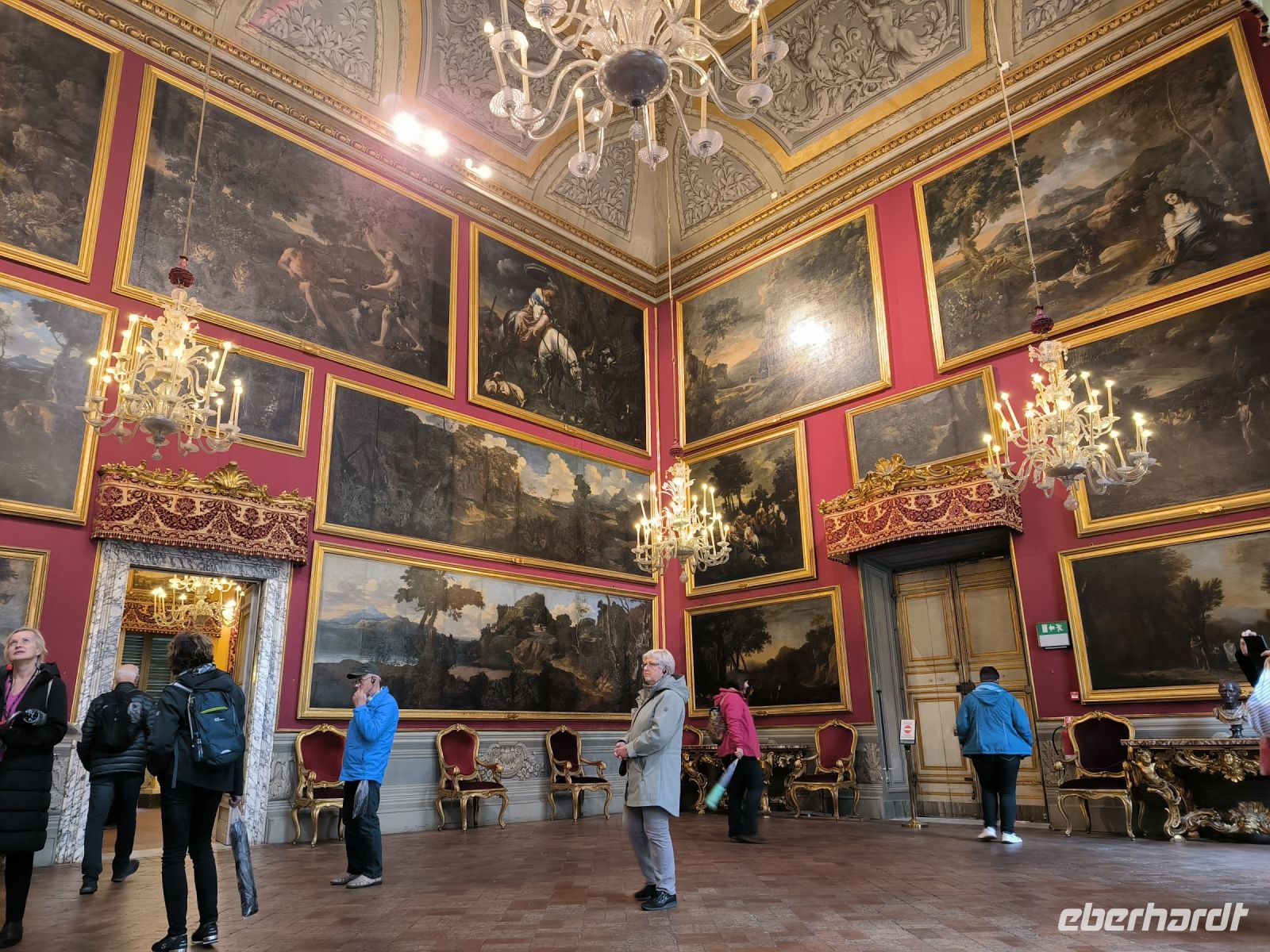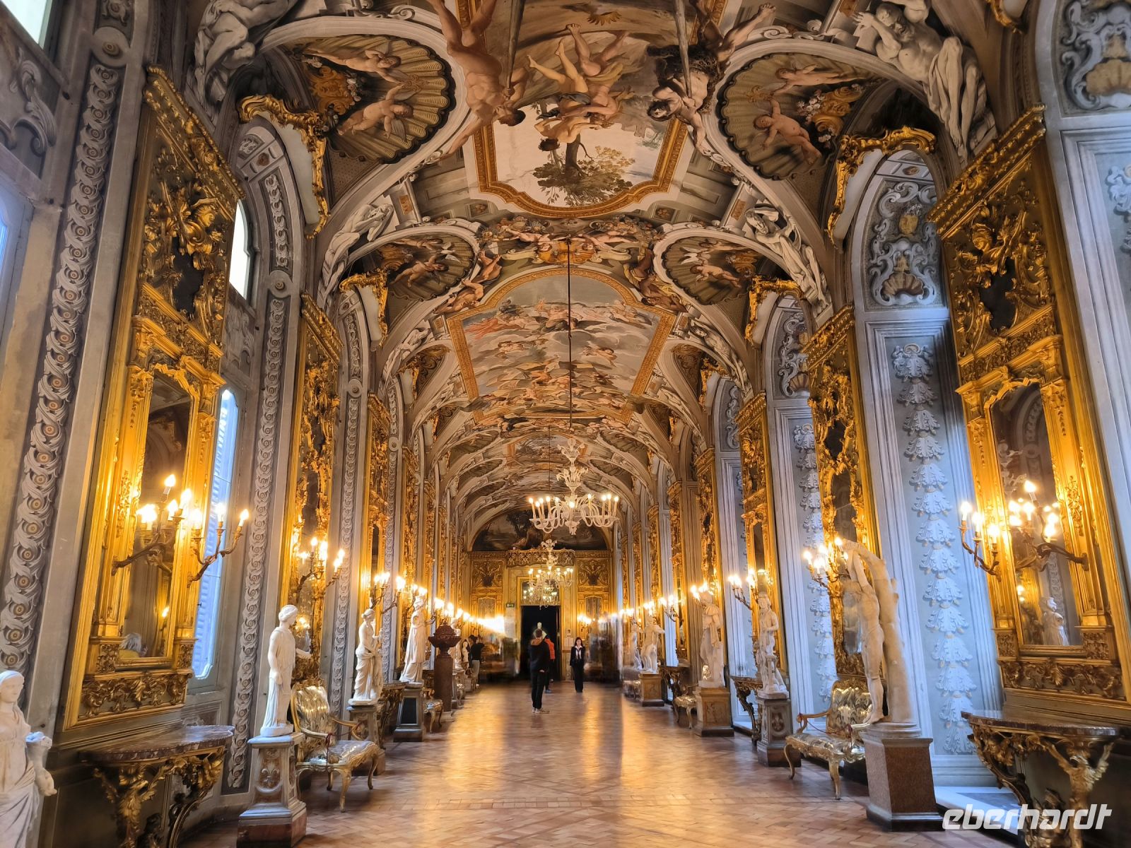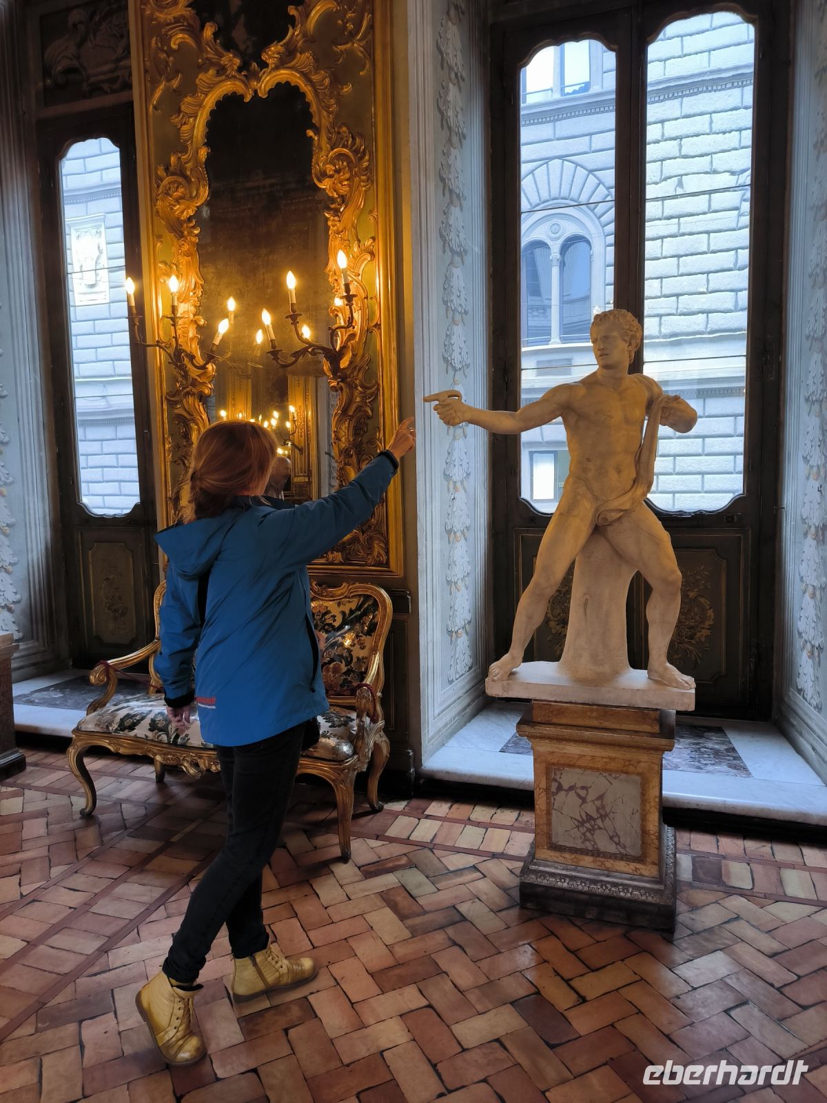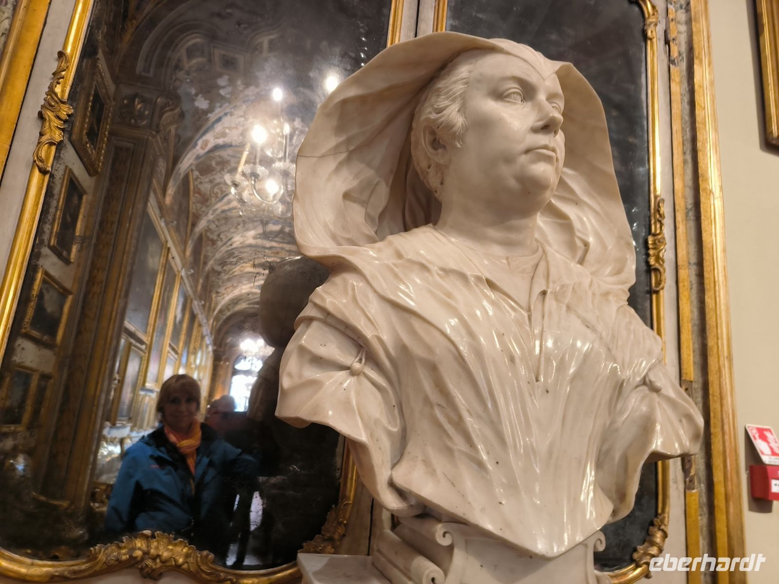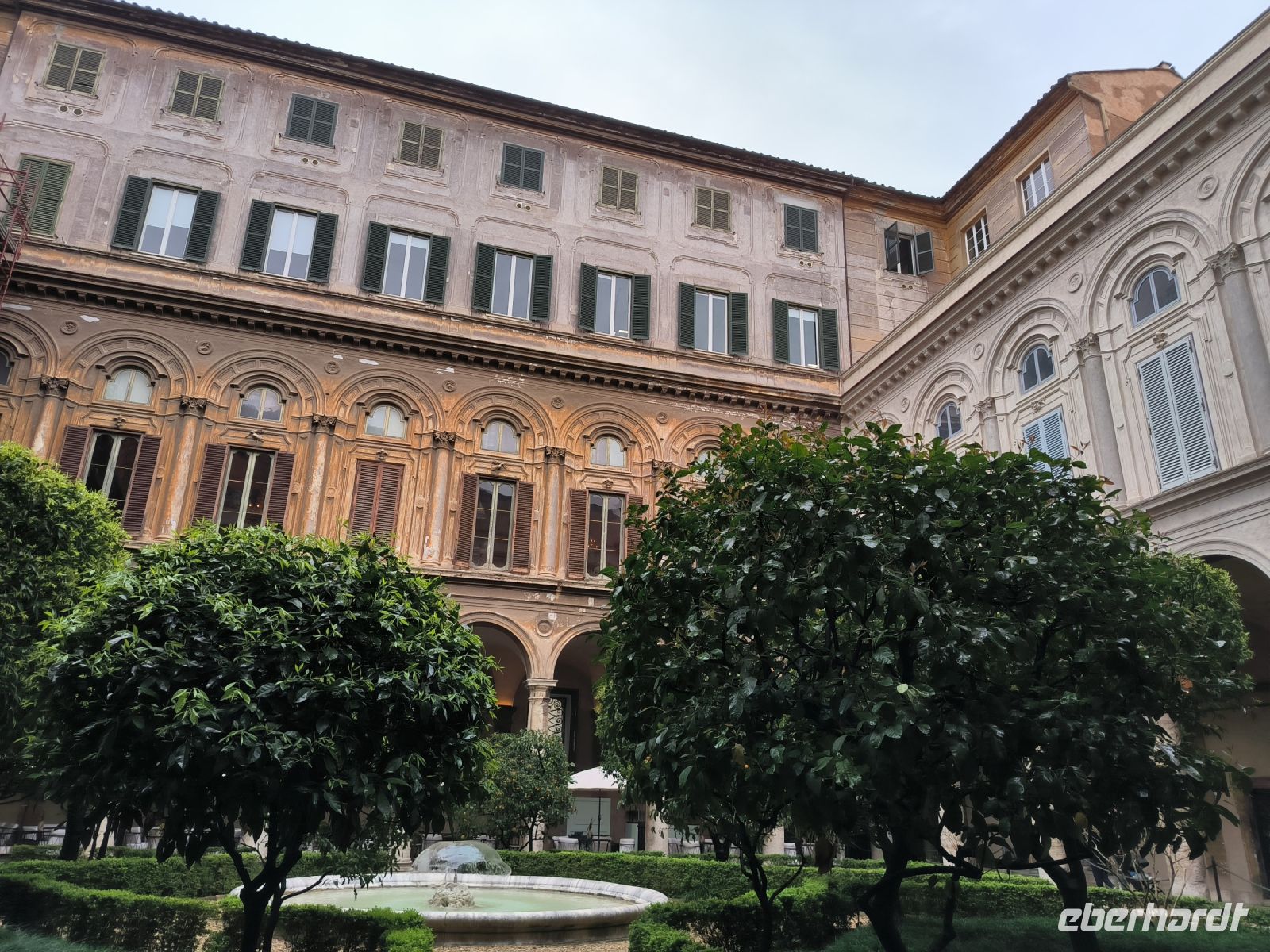 Danach spazieren wir zum letzten großen Höhepunkt des Tages: zur Galleria Doria Pamphilj im gleichnamigen Palazzo. Es ist sozusagen ein Geheimtipp unter den unzähligen Highlights der Stadt. Die Privatsammlung der Familie Doria umfasst Meisterwerke von Tizian, Raffael, Caravaggio, Correggio und Vélazquez. Mehrere Generationen dieser Familie waren große Kunstliebhaber, wodurch die Wände des Palastes von oben bis unten mit Gemälden behangen sind.