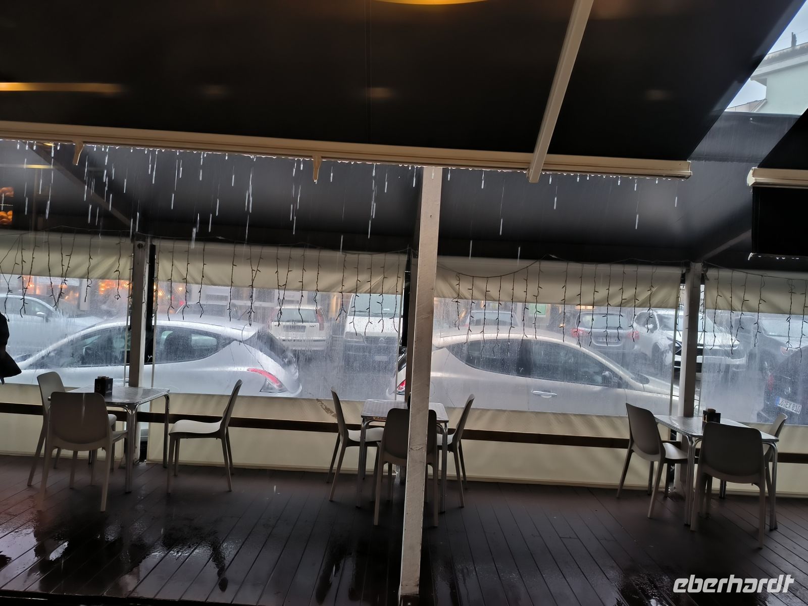Okay, die Schuhe müssen wir noch einmal wechseln, da es völlig unmöglich ist, die Straße, die sich in einen reißenden Sturzbach verwandelt hat, trockenen Fußes zu überqueren.