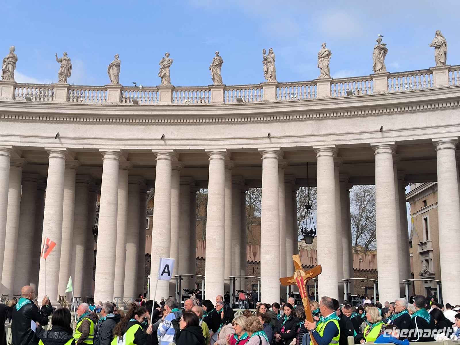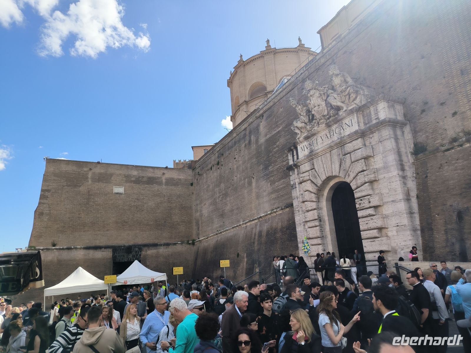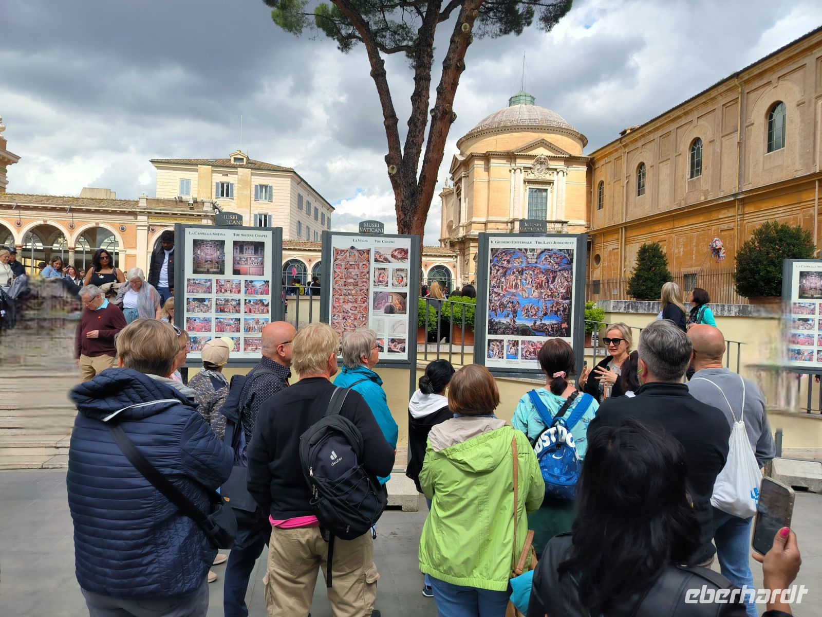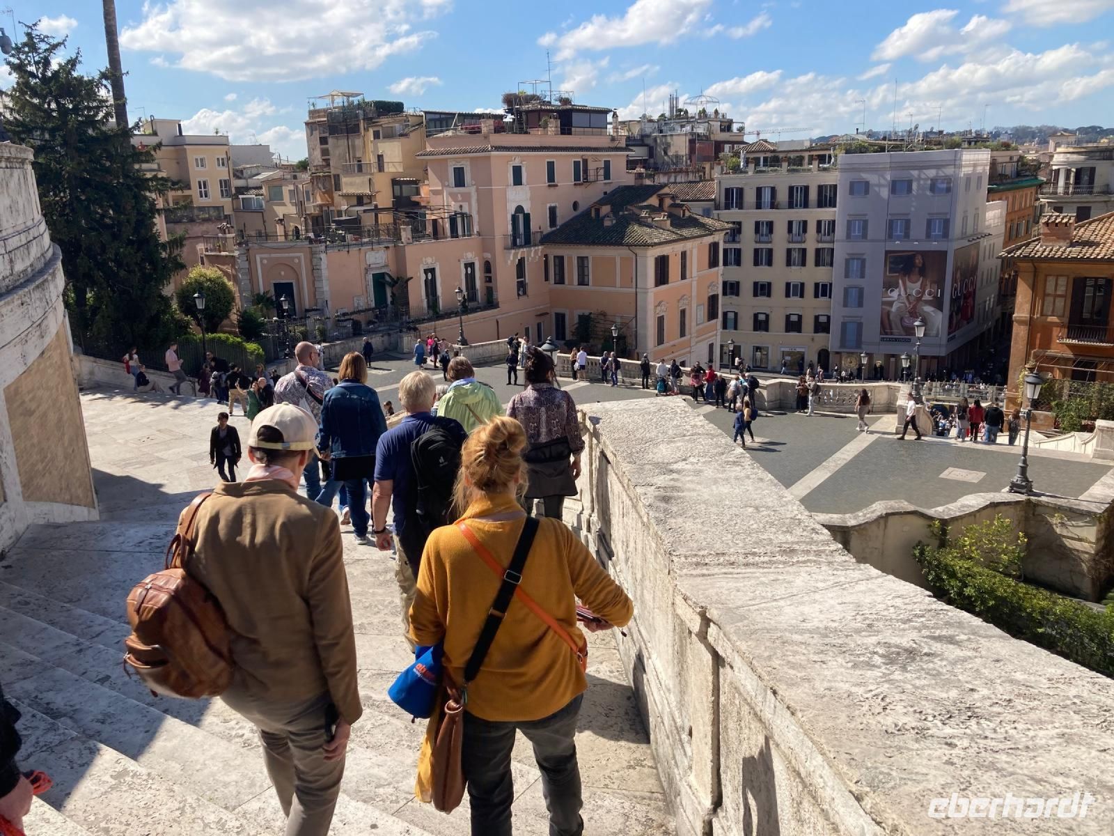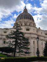 Obwohl unser Hotel in der Nähe des Vatikans liegt, müssen wir dessen Mauern zur Hälfte umrunden, um zum Eingang der Museen auf der anderen Seite zu gelangen. Dort stehen viele Menschen, aber alles ist gut organisiert. Zur angemeldeten Zeit dürfen wir durch die Sicherheitskontrolle gehen und bekommen dann am Schalter unsere Tickets. Wir freuen uns besonders auf die entspannte Busfahrt durch die Vatikanischen Gärten, die nur wenigen Besuchern vorbehalten sind. So sehen wir die Kuppel des Petersdoms ganz nah und von allen Seiten, stoppen am Radio Vaticano und bewundern die tolle Pflanzenwelt der gepflegten Gärten. Auch den Wohnsitz von Papst Francesco, der ja gerade erst aus dem Krankenhaus entlassen wurde, sehen wir. Nach der Rundfahrt erwartet uns Sylvia am Modell des Vatikans und gleich geht es weiter ins Innere des Heiligtums. Mit vielen anderen Besuchern schieben wir uns durch die Vatikanischen Museen mit ihren Schätzen: ausdrucksstarke Gemälde, Wandmalereien, wertvolle Wandteppiche, Skulpturen und vieles mehr. Besonders beeindruckend sind die „Stanzen des Raffael“, die Gemächer im Apostolischen Palast, die von Raffael und seiner Schule ausgemalt wurden. Augen und Hirn und laufen über von den unzähligen Details und so kommt eine kurze Pause gerade recht, bevor wir den Höhepunkt der Tour erleben. In der Sixtinischen Kapelle findet das Konklave statt, wenn ein neuer Papst gewählt wird. Konklave bedeutet „verschließbares Gemach“, hier wird das Wahlgremium eingeschlossen, bis es zu einer gültigen Wahl gekommen ist und weißer Rauch aufsteigt. Heute aber dürfen wir hindurchgehen und Michelangelos grandiose Decken- und Wandmalereien bewundern. Durch einen separaten Ausgang gelangen wir auf die Königstreppe, die Scala Regia, die uns direkt zum Petersdom führt. Auch hier ist die heilige Pforte geöffnet, aber zunächst den Pilgern vorbehalten, die im Heiligen Jahr 2025 in Scharen nach Rom kommen. Das Innere des Petersdoms wurde in den letzten Jahren aufwändig restauriert und nun strahlen die Pietá von Michelangelo, Berninis Baldachin, die Goldene Kuppel und die herrlichen Mosaiken um die Wette. Nach Sylvias offizieller Führung lassen es sich einige natürlich nicht nehmen, die Kuppel zu erklimmen und den sensationellen Ausblick von oben über die Stadt zu genießen. Andere steigen hinab in die Krypta unter dem Petersdom, wo viele Päpste, andere Geistliche und auch Papst Benedikt XVI. beerdigt sind.