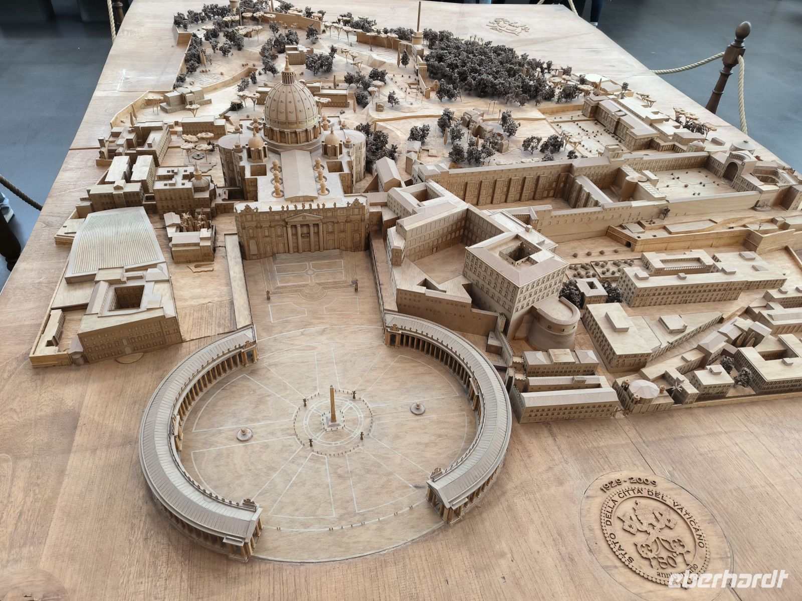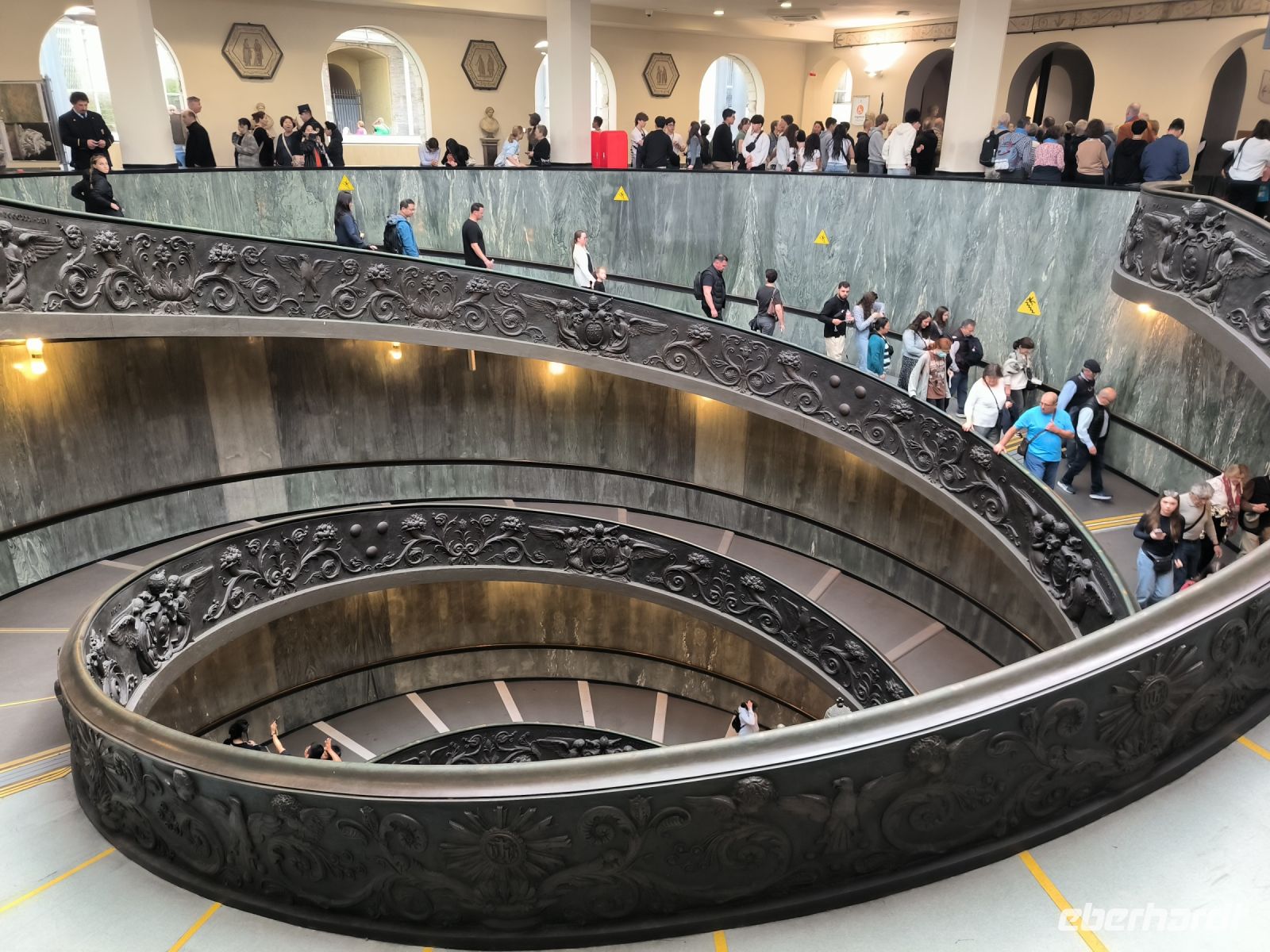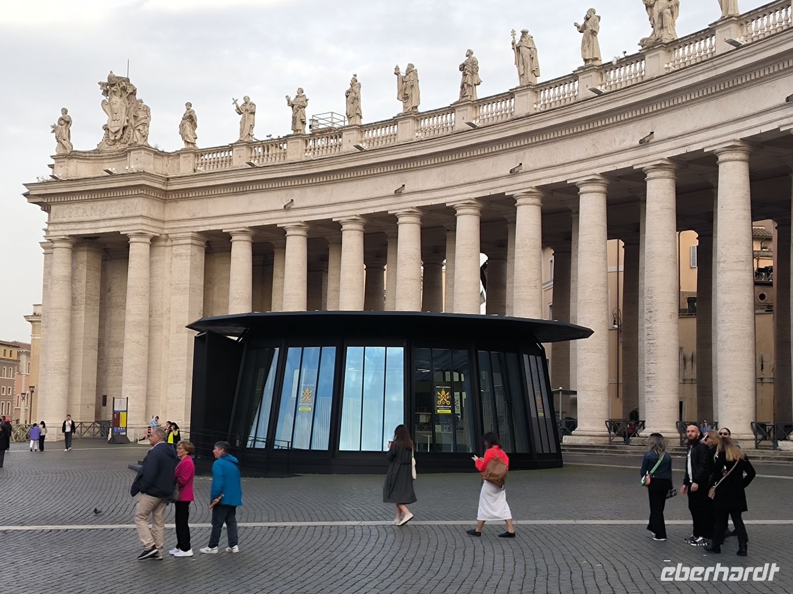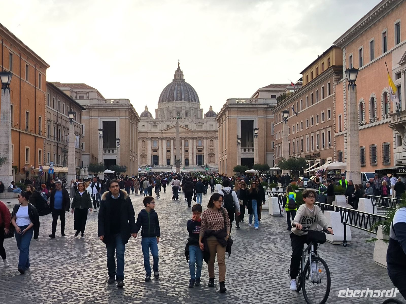 Obwohl unser Hotel in der Nähe des Vatikans liegt, müssen wir dessen Mauern zur Hälfte umrunden, um zum Eingang der Museen auf der anderen Seite zu gelangen. Dort stehen viele Menschen, aber alles ist gut organisiert. Zur angemeldeten Zeit dürfen wir durch die Sicherheitskontrolle gehen und bekommen dann am Schalter unsere Tickets. Wir freuen uns besonders auf die entspannte Busfahrt durch die Vatikanischen Gärten, die nur wenigen Besuchern vorbehalten sind. So sehen wir die Kuppel des Petersdoms ganz nah und von allen Seiten, stoppen am Radio Vaticano und bewundern die tolle Pflanzenwelt der gepflegten Gärten. Auch den Wohnsitz von Papst Francesco, der ja gerade erst aus dem Krankenhaus entlassen wurde, sehen wir. Nach der Rundfahrt erwartet uns Sylvia am Modell des Vatikans und gleich geht es weiter ins Innere des Heiligtums. Mit vielen anderen Besuchern schieben wir uns durch die Vatikanischen Museen mit ihren Schätzen: ausdrucksstarke Gemälde, Wandmalereien, wertvolle Wandteppiche, Skulpturen und vieles mehr. Besonders beeindruckend sind die „Stanzen des Raffael“, die Gemächer im Apostolischen Palast, die von Raffael und seiner Schule ausgemalt wurden. Augen und Hirn und laufen über von den unzähligen Details und so kommt eine kurze Pause gerade recht, bevor wir den Höhepunkt der Tour erleben. In der Sixtinischen Kapelle findet das Konklave statt, wenn ein neuer Papst gewählt wird. Konklave bedeutet „verschließbares Gemach“, hier wird das Wahlgremium eingeschlossen, bis es zu einer gültigen Wahl gekommen ist und weißer Rauch aufsteigt. Heute aber dürfen wir hindurchgehen und Michelangelos grandiose Decken- und Wandmalereien bewundern. Durch einen separaten Ausgang gelangen wir auf die Königstreppe, die Scala Regia, die uns direkt zum Petersdom führt. Auch hier ist die heilige Pforte geöffnet, aber zunächst den Pilgern vorbehalten, die im Heiligen Jahr 2025 in Scharen nach Rom kommen. Das Innere des Petersdoms wurde in den letzten Jahren aufwändig restauriert und nun strahlen die Pietá von Michelangelo, Berninis Baldachin, die Goldene Kuppel und die herrlichen Mosaiken um die Wette. Nach Sylvias offizieller Führung lassen es sich einige natürlich nicht nehmen, die Kuppel zu erklimmen und den sensationellen Ausblick von oben über die Stadt zu genießen. Andere steigen hinab in die Krypta unter dem Petersdom, wo viele Päpste, andere Geistliche und auch Papst Benedikt XVI. beerdigt sind.