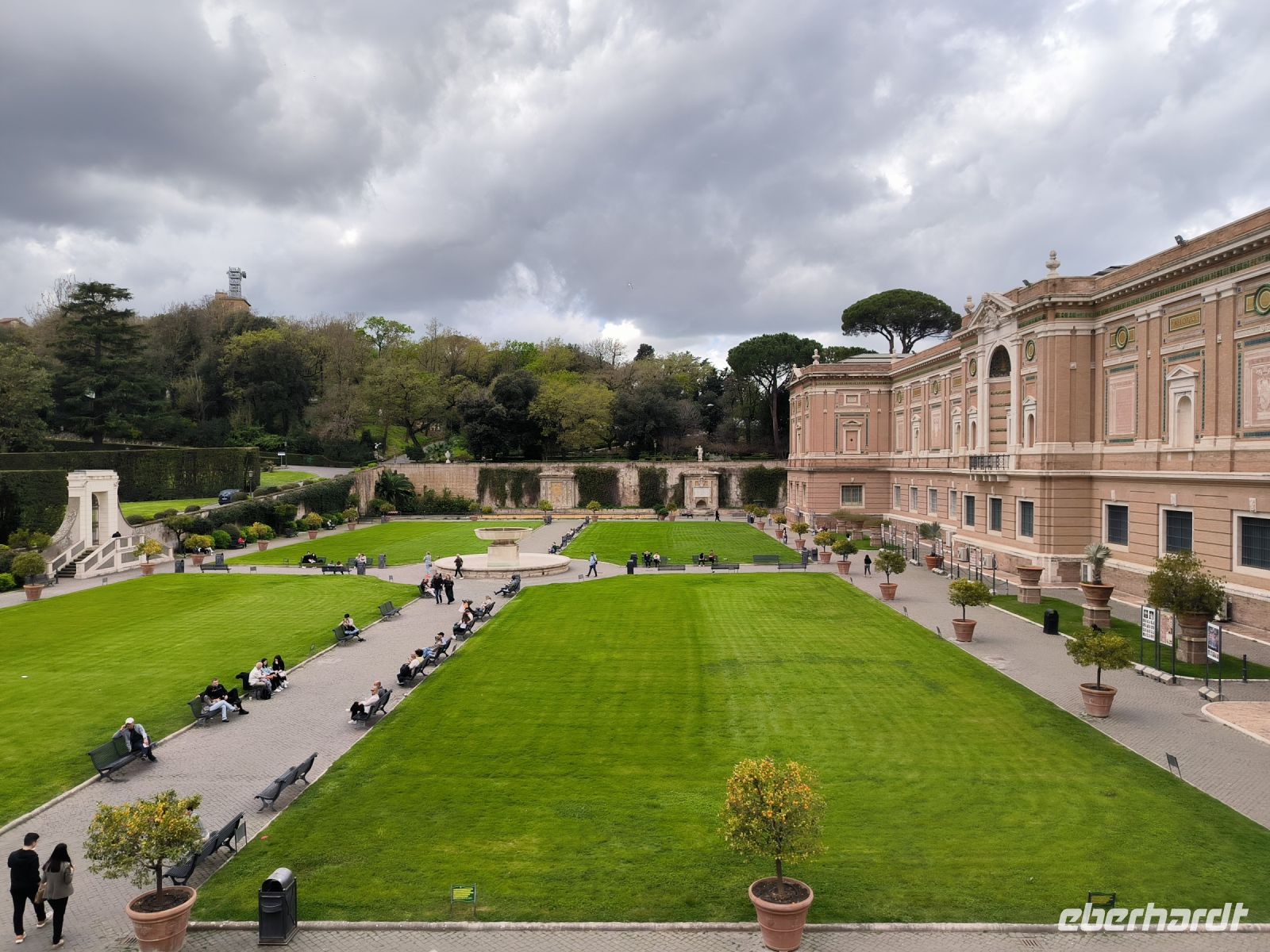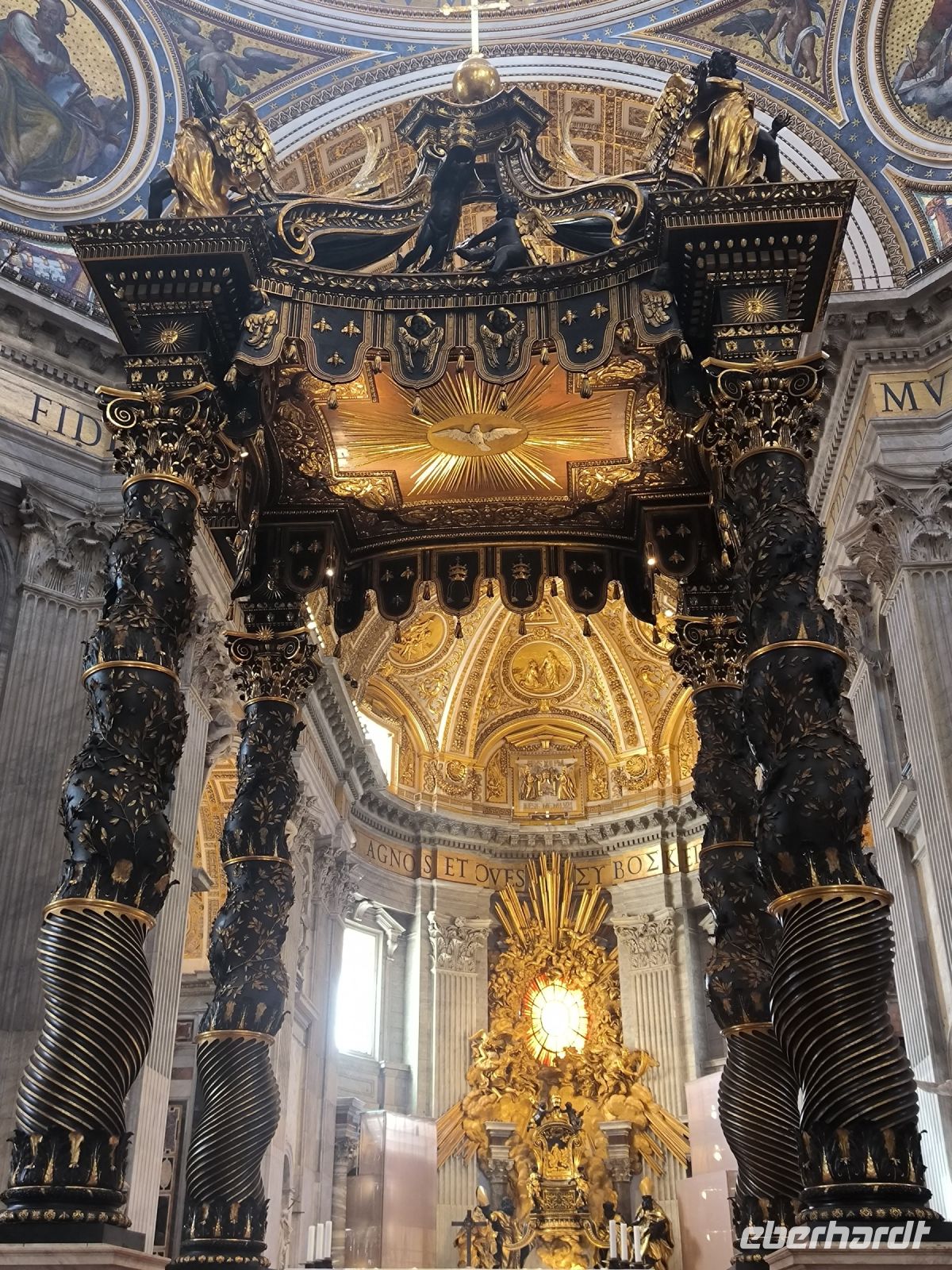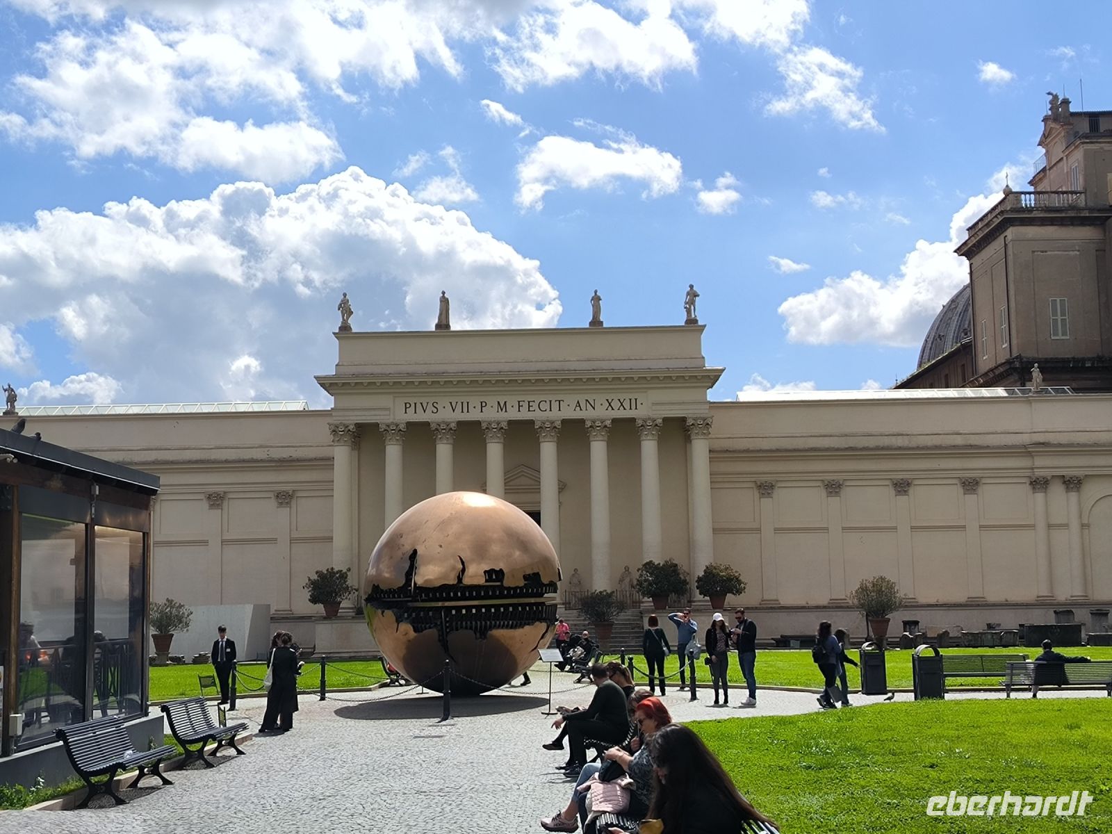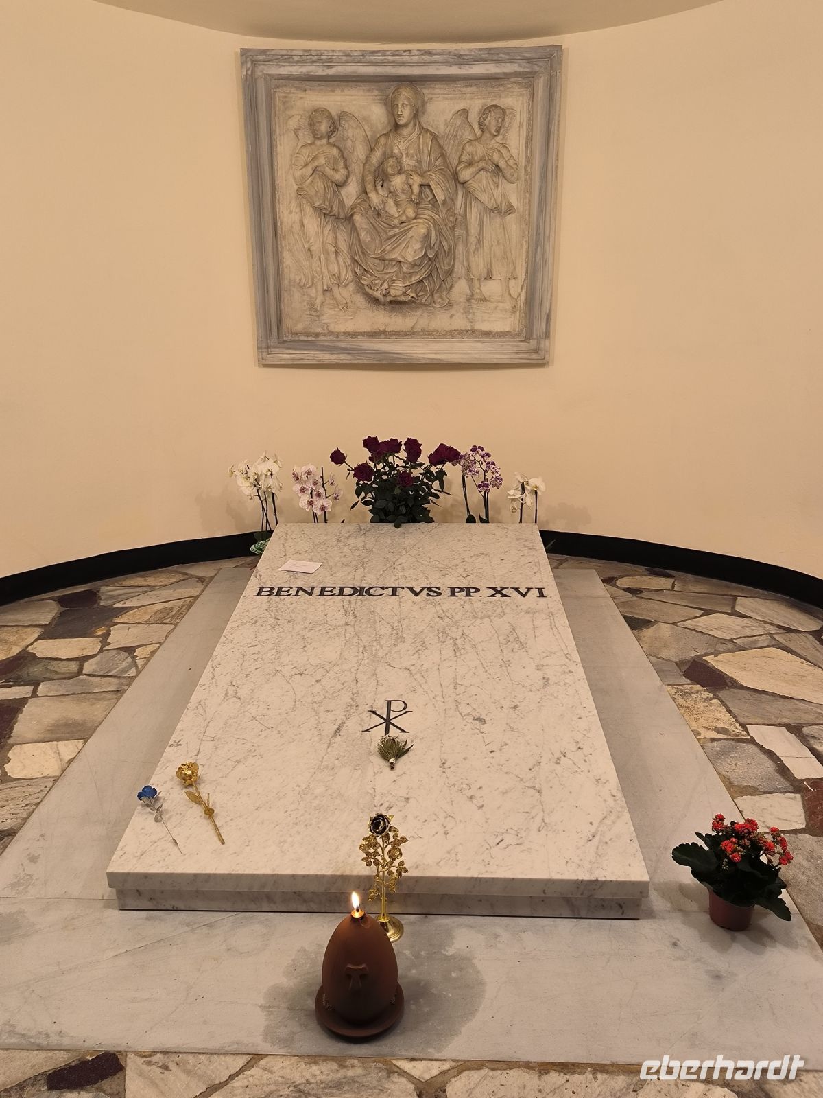 Obwohl unser Hotel in der Nähe des Vatikans liegt, müssen wir dessen Mauern zur Hälfte umrunden, um zum Eingang der Museen auf der anderen Seite zu gelangen. Dort stehen viele Menschen, aber alles ist gut organisiert. Zur angemeldeten Zeit dürfen wir durch die Sicherheitskontrolle gehen und bekommen dann am Schalter unsere Tickets. Wir freuen uns besonders auf die entspannte Busfahrt durch die Vatikanischen Gärten, die nur wenigen Besuchern vorbehalten sind. So sehen wir die Kuppel des Petersdoms ganz nah und von allen Seiten, stoppen am Radio Vaticano und bewundern die tolle Pflanzenwelt der gepflegten Gärten. Auch den Wohnsitz von Papst Francesco, der ja gerade erst aus dem Krankenhaus entlassen wurde, sehen wir. Nach der Rundfahrt erwartet uns Sylvia am Modell des Vatikans und gleich geht es weiter ins Innere des Heiligtums. Mit vielen anderen Besuchern schieben wir uns durch die Vatikanischen Museen mit ihren Schätzen: ausdrucksstarke Gemälde, Wandmalereien, wertvolle Wandteppiche, Skulpturen und vieles mehr. Besonders beeindruckend sind die „Stanzen des Raffael“, die Gemächer im Apostolischen Palast, die von Raffael und seiner Schule ausgemalt wurden. Augen und Hirn und laufen über von den unzähligen Details und so kommt eine kurze Pause gerade recht, bevor wir den Höhepunkt der Tour erleben. In der Sixtinischen Kapelle findet das Konklave statt, wenn ein neuer Papst gewählt wird. Konklave bedeutet „verschließbares Gemach“, hier wird das Wahlgremium eingeschlossen, bis es zu einer gültigen Wahl gekommen ist und weißer Rauch aufsteigt. Heute aber dürfen wir hindurchgehen und Michelangelos grandiose Decken- und Wandmalereien bewundern. Durch einen separaten Ausgang gelangen wir auf die Königstreppe, die Scala Regia, die uns direkt zum Petersdom führt. Auch hier ist die heilige Pforte geöffnet, aber zunächst den Pilgern vorbehalten, die im Heiligen Jahr 2025 in Scharen nach Rom kommen. Das Innere des Petersdoms wurde in den letzten Jahren aufwändig restauriert und nun strahlen die Pietá von Michelangelo, Berninis Baldachin, die Goldene Kuppel und die herrlichen Mosaiken um die Wette. Nach Sylvias offizieller Führung lassen es sich einige natürlich nicht nehmen, die Kuppel zu erklimmen und den sensationellen Ausblick von oben über die Stadt zu genießen. Andere steigen hinab in die Krypta unter dem Petersdom, wo viele Päpste, andere Geistliche und auch Papst Benedikt XVI. beerdigt sind.