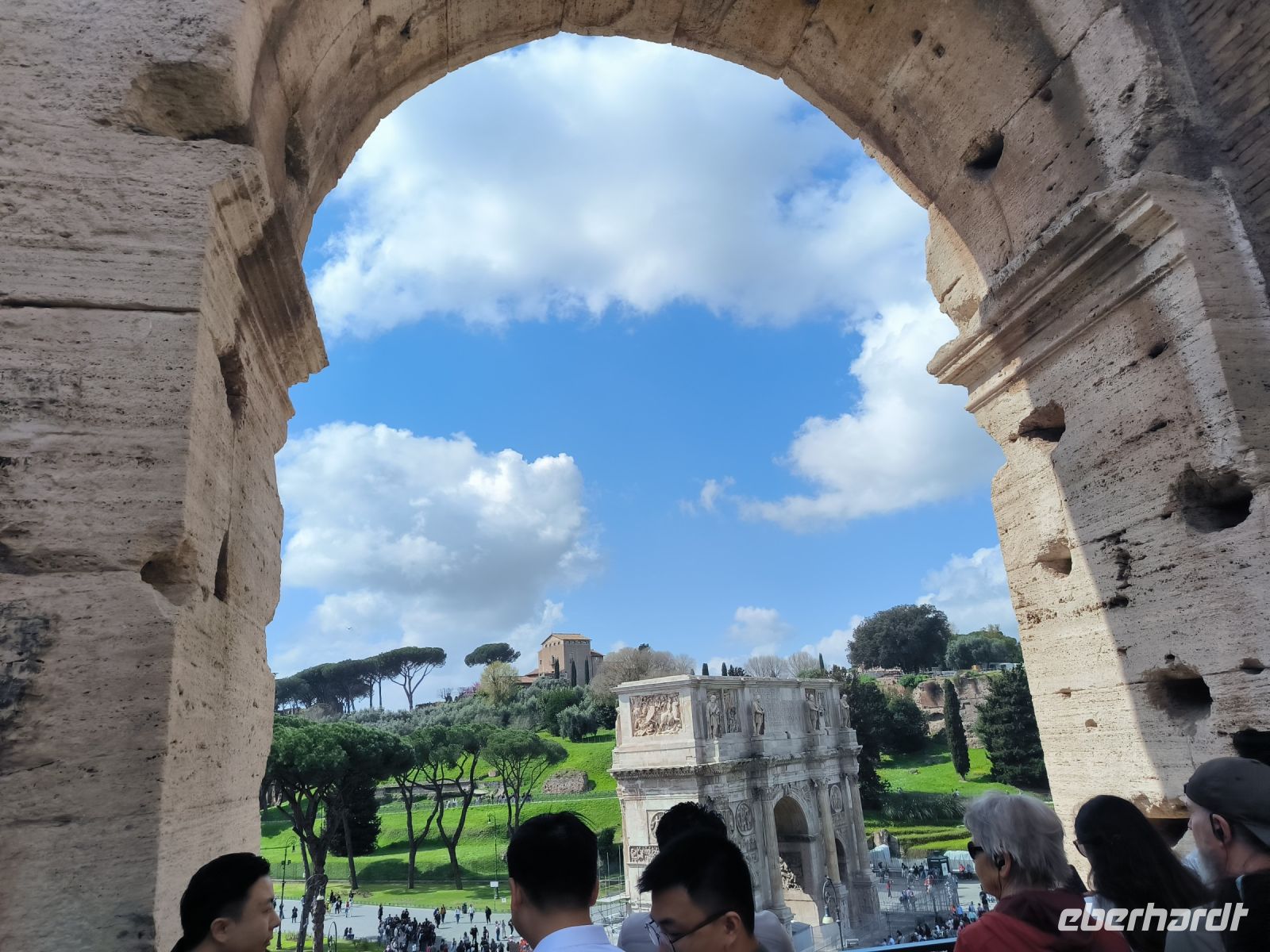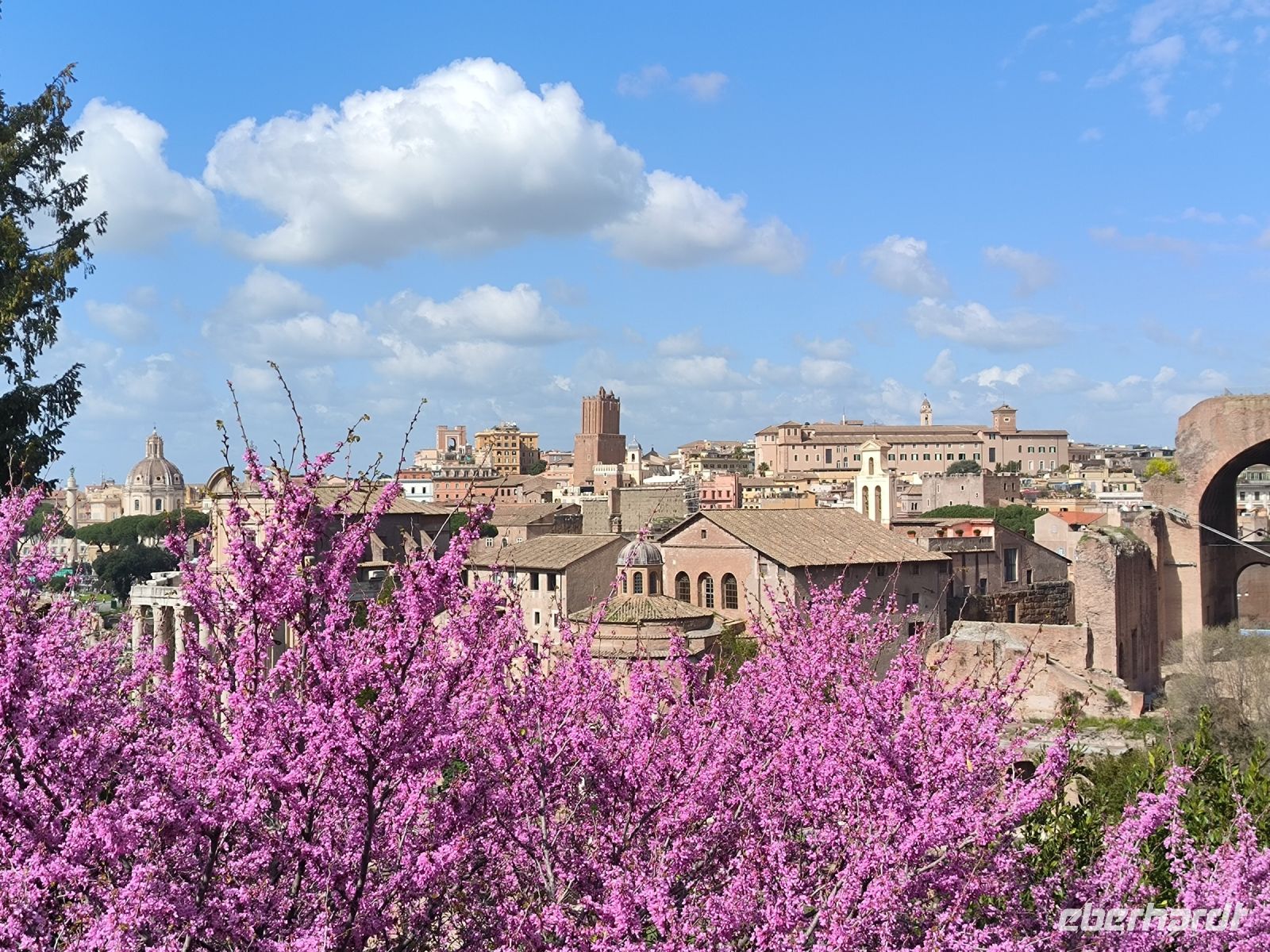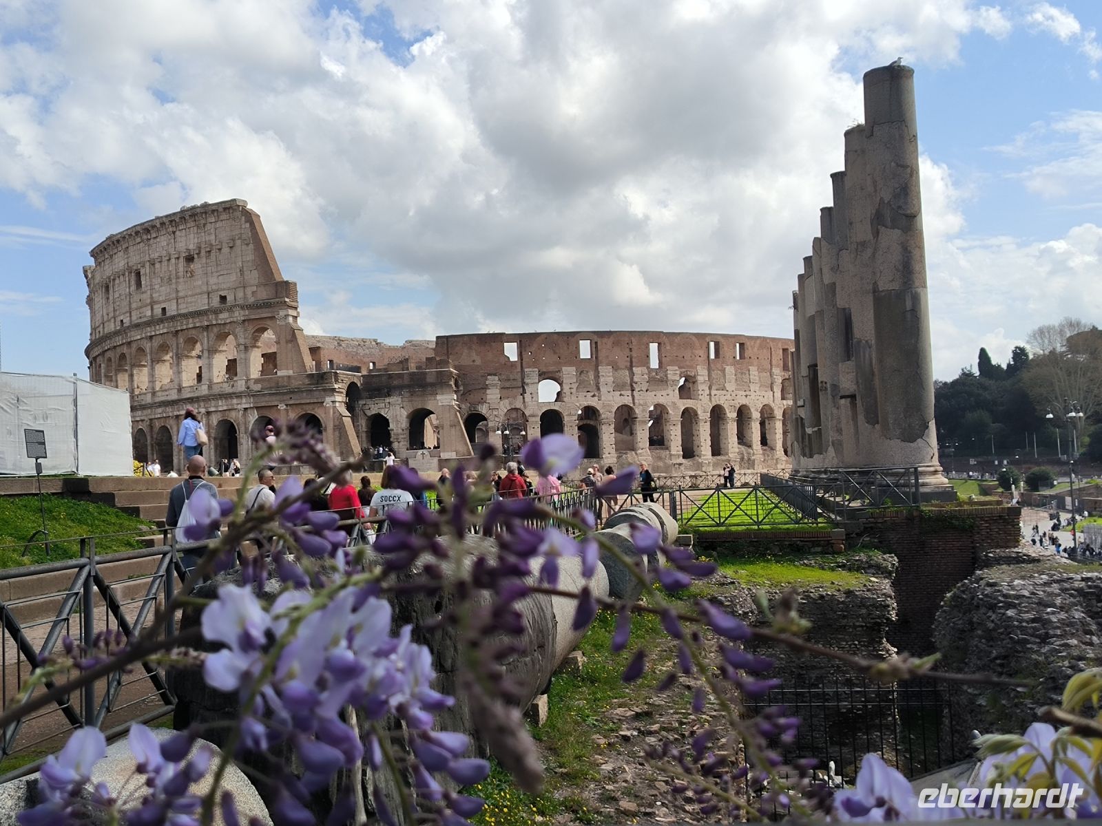Nach dem Frühstück heißt es, die öffentlichen Verkehrsmittel Roms zu testen. Mit dem Bus fahren wir bis ins Herz der Stadt, zur Piazza Venezia, wo das weiße Monument für Vittorio Emanuele II. die riesige Metro-Baustelle überragt. Von hier aus laufen wir zur Metro Station am Kolosseum. Hier erwartet uns Sylvia, unsere kenntnisreiche Stadtführerin für die nächsten Tage. Sie führt uns mit detailreichen Erläuterungen durch die geschichtsträchtigen Reste einer wirklich kolossalen Architektur. Zwischendurch benötigen wir eine kleine Mittagspause, die aber teilweise – wie so oft – von der Toilettenschlange aufgefressen wird. Vom Palatin-Hügel aus bietet sich uns ein unbeschreiblicher Überblick über das Forum Romanum. Die violett blühenden Judasbäume sorgen für farbige Kontraste.
