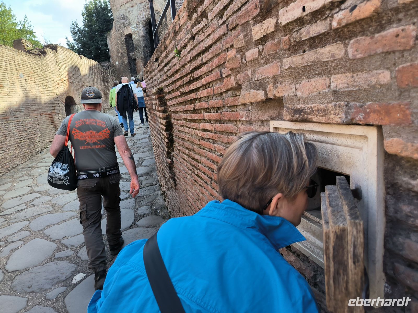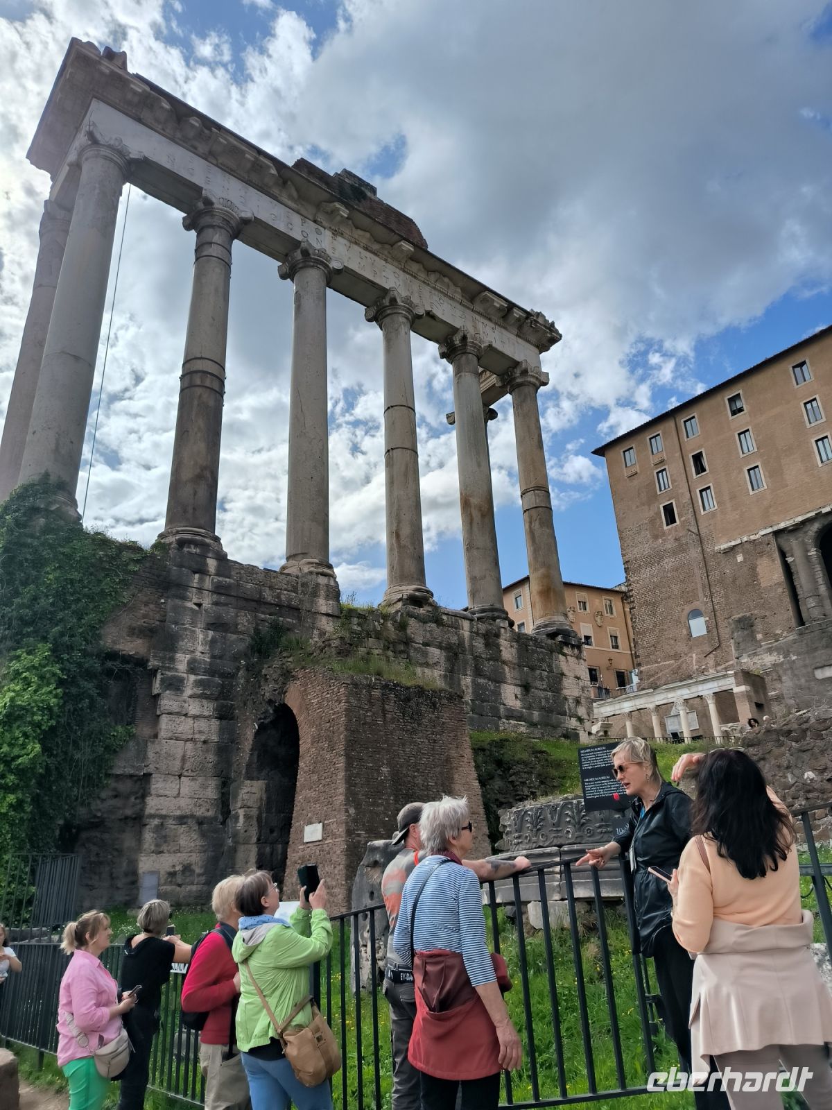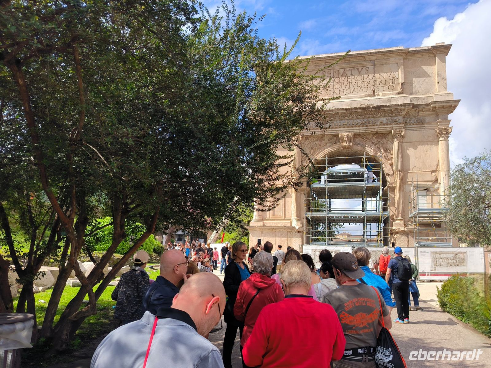 Nach dem Frühstück heißt es, die öffentlichen Verkehrsmittel Roms zu testen. Mit dem Bus fahren wir bis ins Herz der Stadt, zur Piazza Venezia, wo das weiße Monument für Vittorio Emanuele II. die riesige Metro-Baustelle überragt. Von hier aus laufen wir zur Metro Station am Kolosseum. Hier erwartet uns Sylvia, unsere kenntnisreiche Stadtführerin für die nächsten Tage. Sie führt uns mit detailreichen Erläuterungen durch die geschichtsträchtigen Reste einer wirklich kolossalen Architektur. Zwischendurch benötigen wir eine kleine Mittagspause, die aber teilweise – wie so oft – von der Toilettenschlange aufgefressen wird. Vom Palatin-Hügel aus bietet sich uns ein unbeschreiblicher Überblick über das Forum Romanum. Die violett blühenden Judasbäume sorgen für farbige Kontraste.