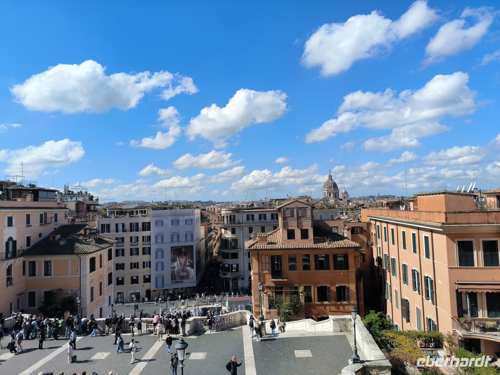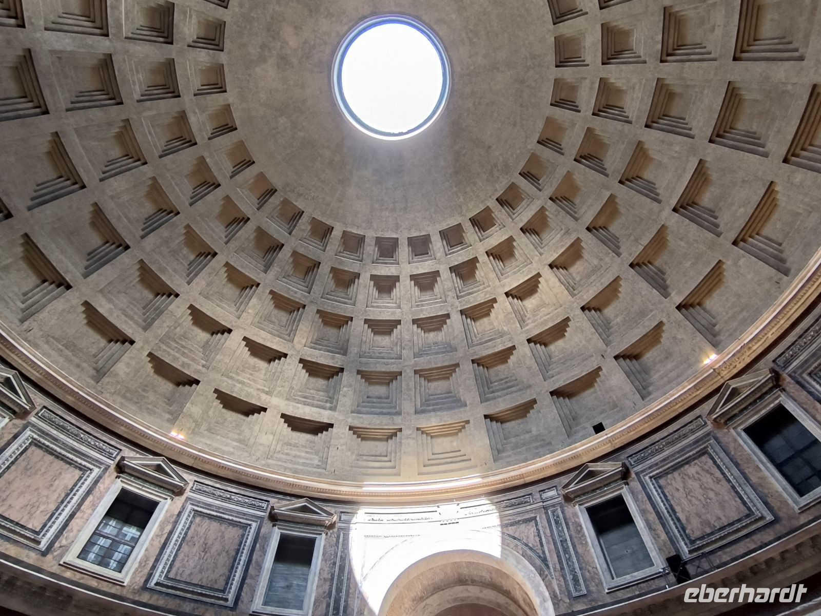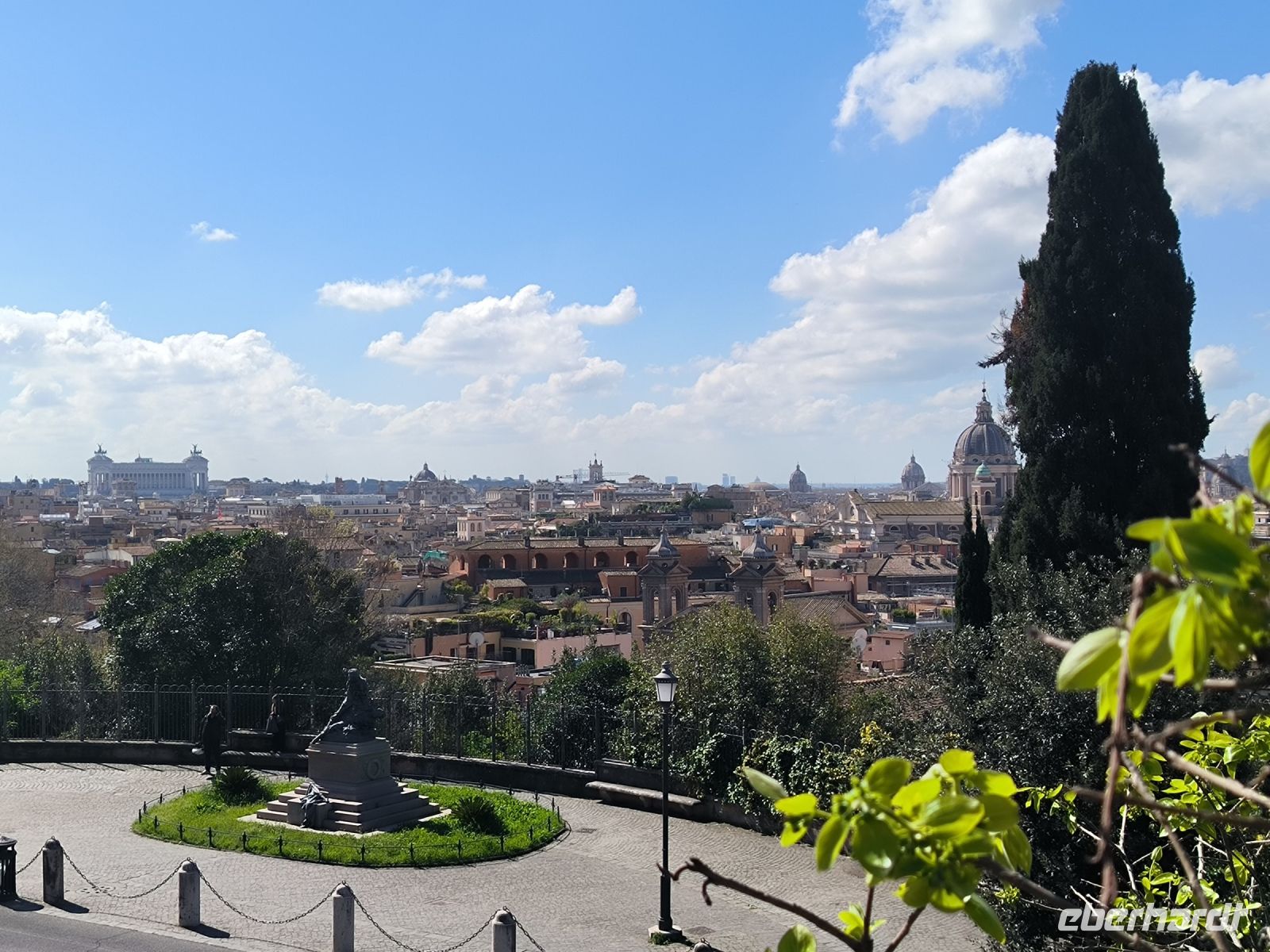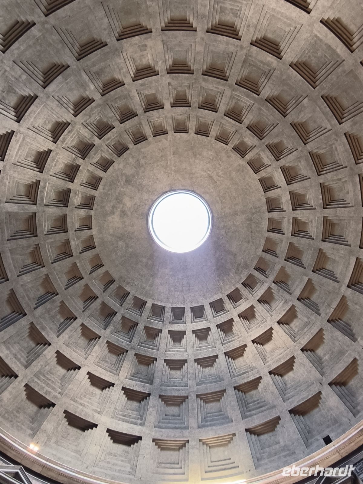 Fast alle haben heute diesen zusätzlichen Ausflug gebucht und so nehmen wir beschwingt einen Bus, der uns kreuz und quer durch die Stadt, aber dann doch zum Ziel führt. Die Piazza del Popolo soll für den Stadtrundgang der Ausgangspunkt sein, hier treffen wir Sylvia. Wir steigen zum Pincio Park hinauf, wo sich auch wieder ein fantastischer Blick eröffnet, über die Piazza bis zum allgegenwärtigen Petersdom. Vorbei an Skulpturen, deren Nasen immer wieder ersetzt werden müssen, und an der Villa Medici gelangen wir zur Spanischen Treppe. Nun ja, eigentlich heißt sie ja „Scalinata di Trinità dei Monti“ nach der Kirche am oberen Ende. Aber das weiß kaum jemand. Verbreitet ist der Name nach der Piazza di Spagna am unteren Ende, wo sich die spanische Botschaft beim Heiligen Stuhl befindet. Durch das Stadtzentrum, am Regierungsviertel vorbei, gehen wir zu einem besonderen Gebäude. Das Pantheon mit seinem neun Meter großen Loch in der flachen ca. 44m breiten Kuppel gehört zu den am besten erhaltenen Bauten der römischen Antike, was vor allem seiner recht frühen Umwandlung in eine Kirche zu verdanken ist. Kurz vor zwölf Uhr mittags erkennen wir gut den Sonnenstrahl über der zentralen Eingangstür. Auch Raffael und seine Verlobte wurden u.a. hier bestattet.