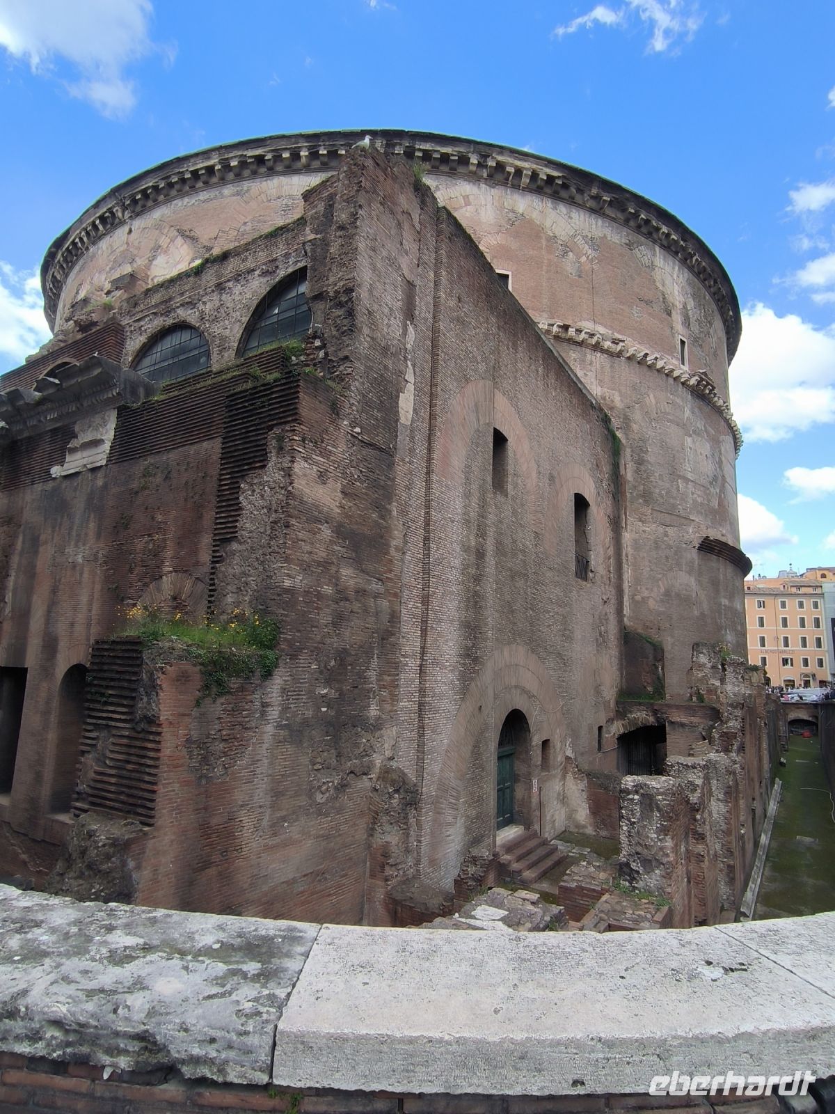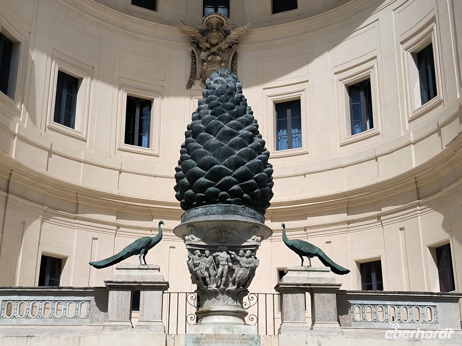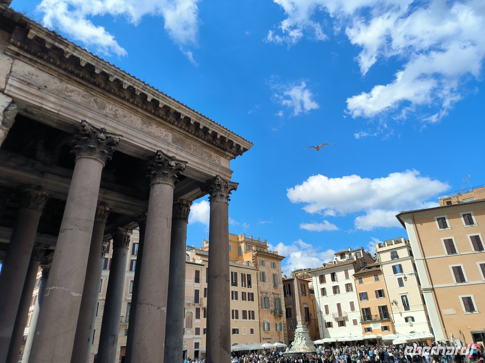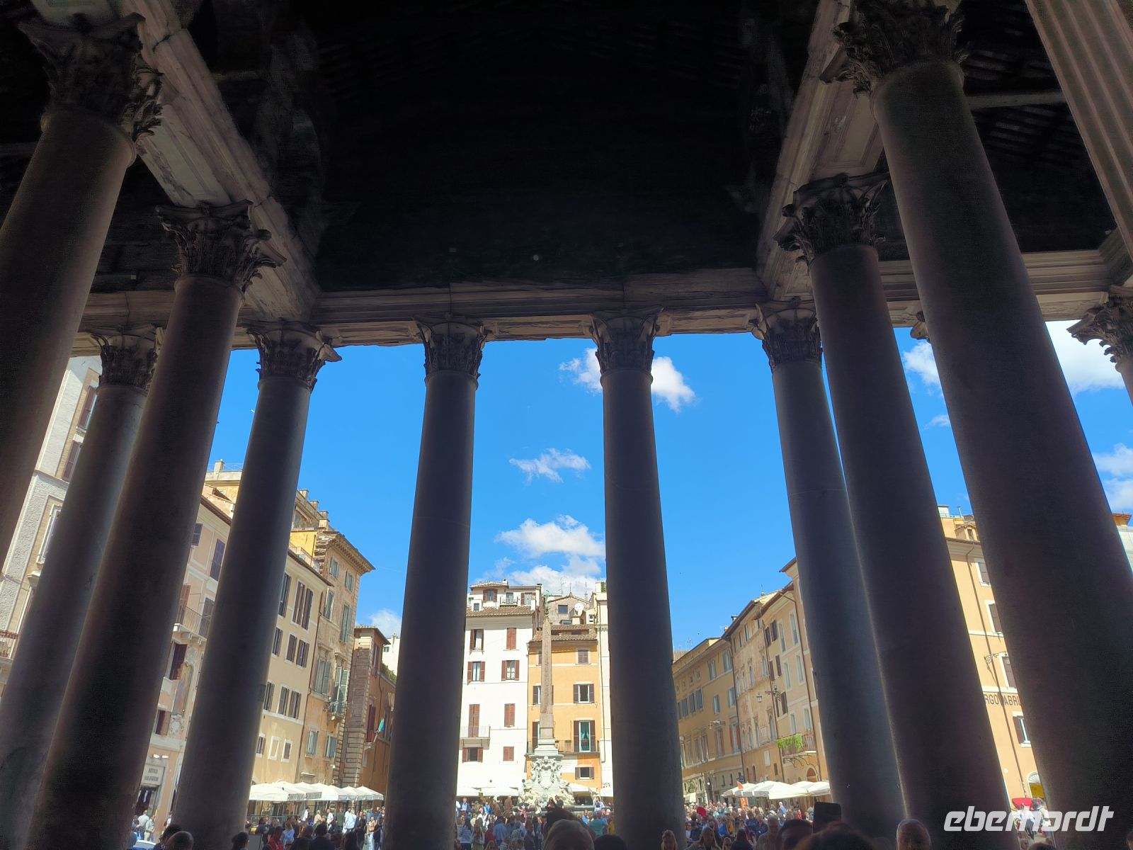 Fast alle haben heute diesen zusätzlichen Ausflug gebucht und so nehmen wir beschwingt einen Bus, der uns kreuz und quer durch die Stadt, aber dann doch zum Ziel führt. Die Piazza del Popolo soll für den Stadtrundgang der Ausgangspunkt sein, hier treffen wir Sylvia. Wir steigen zum Pincio Park hinauf, wo sich auch wieder ein fantastischer Blick eröffnet, über die Piazza bis zum allgegenwärtigen Petersdom. Vorbei an Skulpturen, deren Nasen immer wieder ersetzt werden müssen, und an der Villa Medici gelangen wir zur Spanischen Treppe. Nun ja, eigentlich heißt sie ja „Scalinata di Trinità dei Monti“ nach der Kirche am oberen Ende. Aber das weiß kaum jemand. Verbreitet ist der Name nach der Piazza di Spagna am unteren Ende, wo sich die spanische Botschaft beim Heiligen Stuhl befindet. Durch das Stadtzentrum, am Regierungsviertel vorbei, gehen wir zu einem besonderen Gebäude. Das Pantheon mit seinem neun Meter großen Loch in der flachen ca. 44m breiten Kuppel gehört zu den am besten erhaltenen Bauten der römischen Antike, was vor allem seiner recht frühen Umwandlung in eine Kirche zu verdanken ist. Kurz vor zwölf Uhr mittags erkennen wir gut den Sonnenstrahl über der zentralen Eingangstür. Auch Raffael und seine Verlobte wurden u.a. hier bestattet.