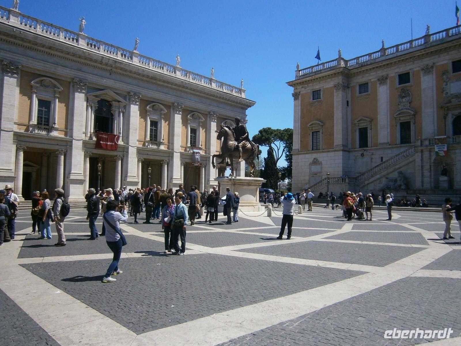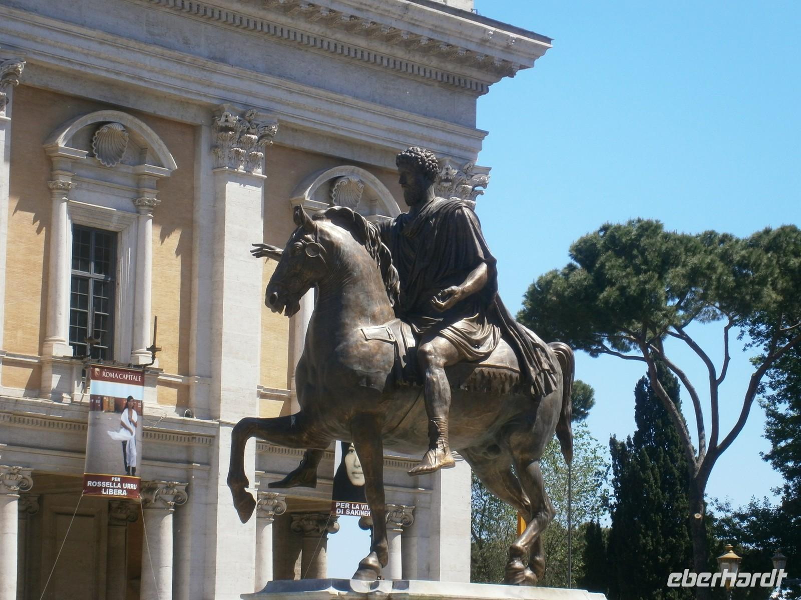Von der Aussichtsterrasse geniessen wir noch einmal den Blick auf das Colloseum, bevor wir zum Forum Romanum gelangen. Hier die erste Schrecksekunde: Ein Reisegast hat sich einer anderen Reisegruppe angeschlossen. Vorbei am Forum Romanum, den Kaiserforen erreichen wir den Capitolshügel, mit dem Reiterstandbild von Marc Aurel. Über die Flachtreppe gehts hinab zur Piazza Venezia, an deren Südseite das Nationaldenkmal für Viktor Emanuell II. steht.