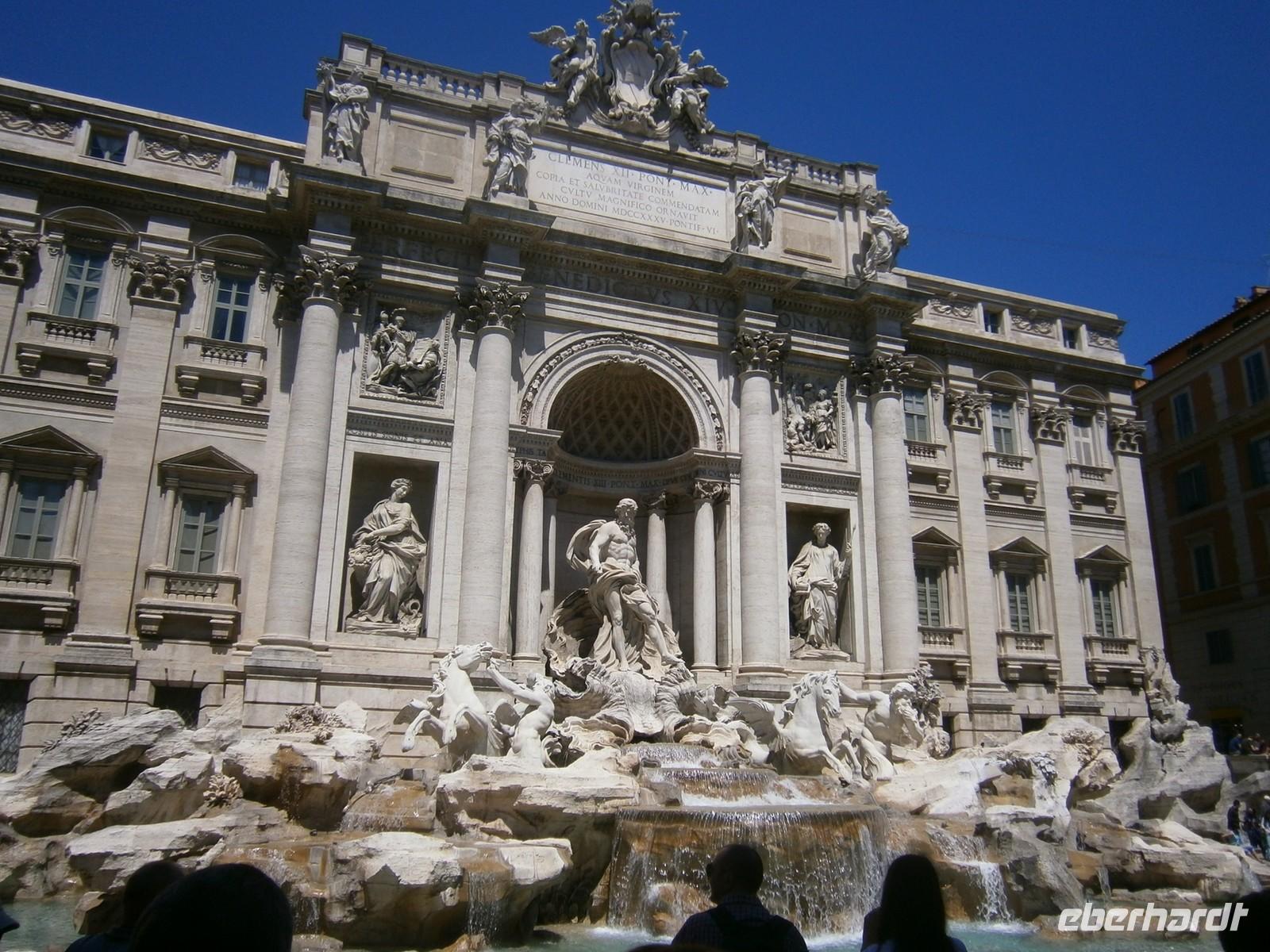 Durch verwinkelte Gassen erreichen wir zur Mittagszeit den Fontana di Trevi, den monumentalsten und größten Brunnen Roms. Rund 26 Meter hoch und rund 50 Meter breit, wurde er aus Travertin und Marmor Mitte des 18. Jh. in seiner heutigen Form erbaut.