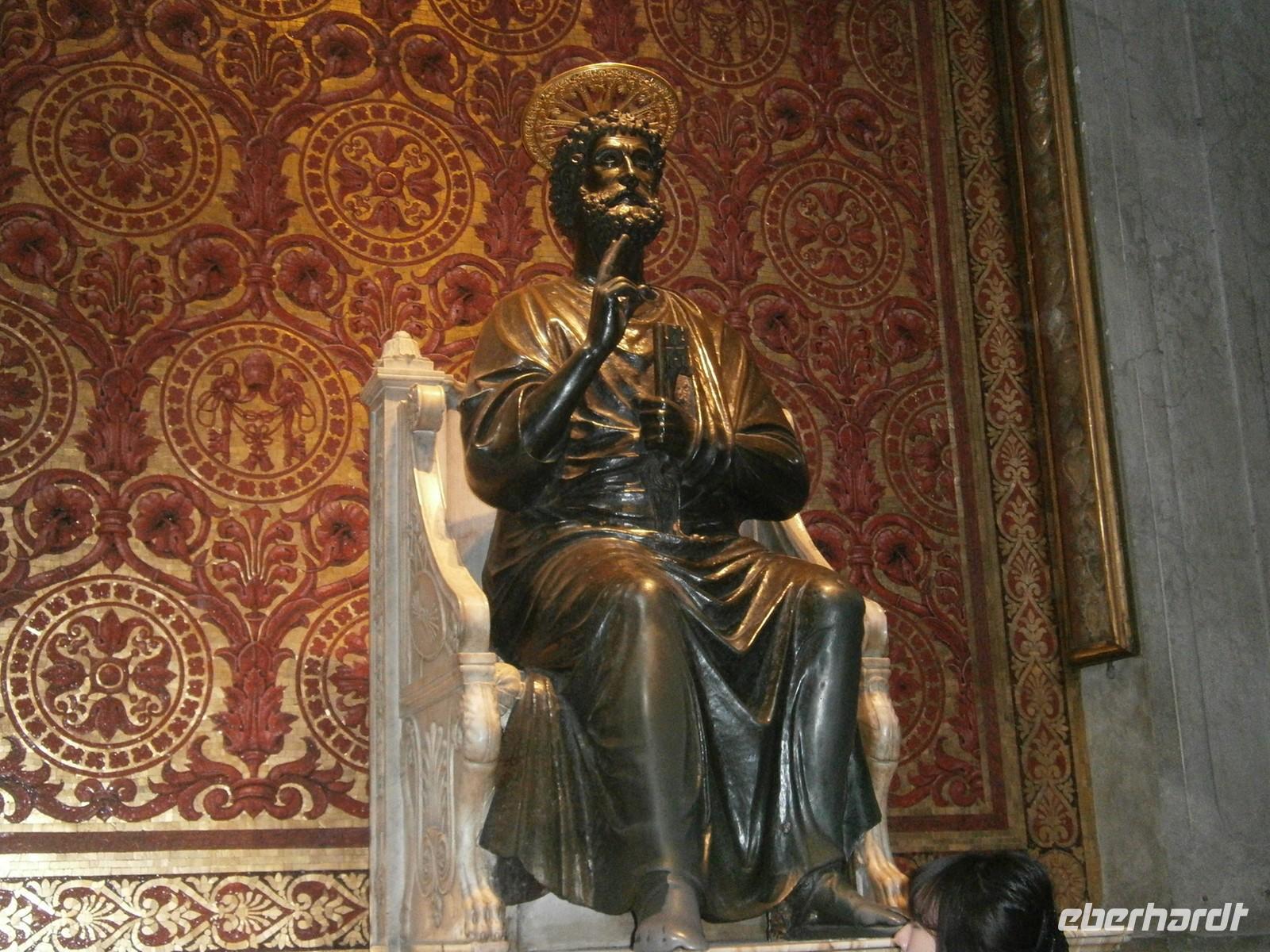 Maria führt uns durch den Petersdom, gibt uns Einblicke in die Baugeschichte, zeigt uns die von Michelangelo gefertigte Pieta. Nachdem die sie 1972 bei einem Attentat schweren Schaden gelitten hatte, wurde sie nach den Restaurierungsarbeiten hinter Panzerglas wieder aufgestellt. Weiter bestaunen wir den Bronzebaldachin von Bernini, das Material stammt aus der Bronze-Kassettendecke des Pantheon. Nicht weit entfernt davon steht die Bronzestatue des heiligen Petrus. Ihr rechter Fuß ist bereits stark abgeflacht, denn die Berührung des Fußes soll Segen bringen.
