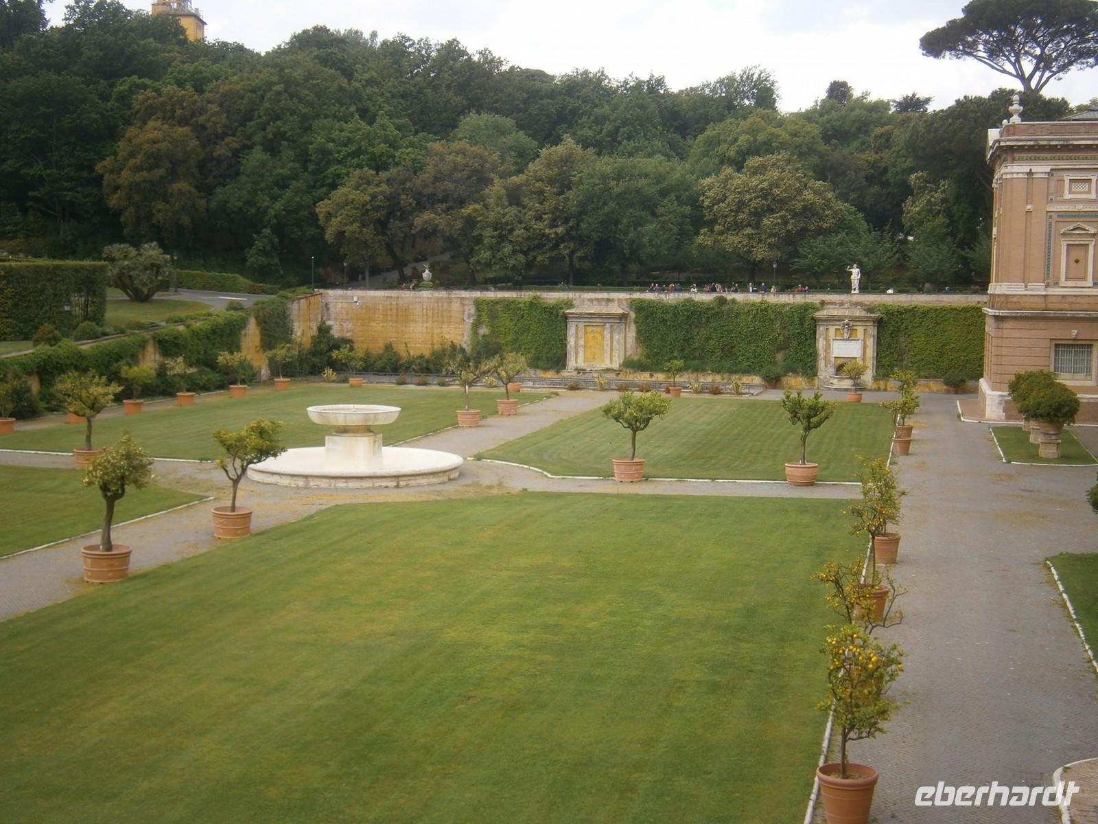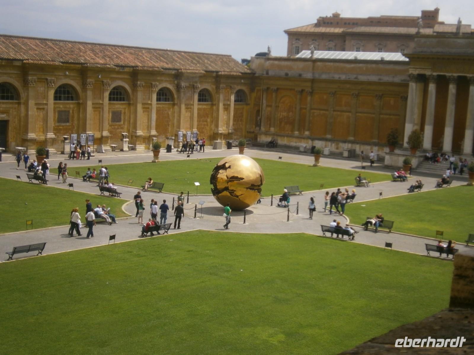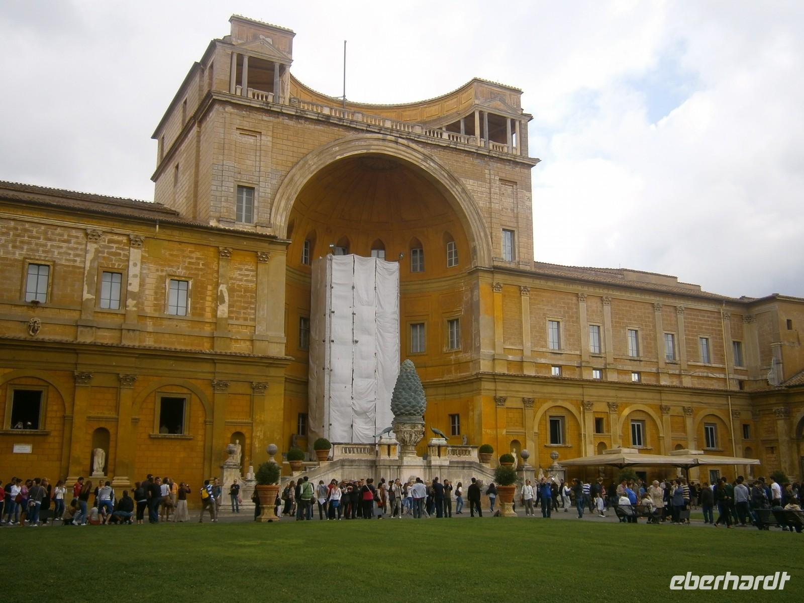 Die Eintrittskarten sind schnell geholt und wir gelangen auch recht zügig in den Innenhof. Der Corttile della Pigna verdankt seinen Namen einem riesigen, fast 4 m hohen Pinienzapfen aus Bronze. Dieser befand sich im antiken Rom in der Nähe des Pantheon. Hier gibt es ausreichend Schautafeln um die Fresken in der Sixtinischen Kapelle zu erklären.