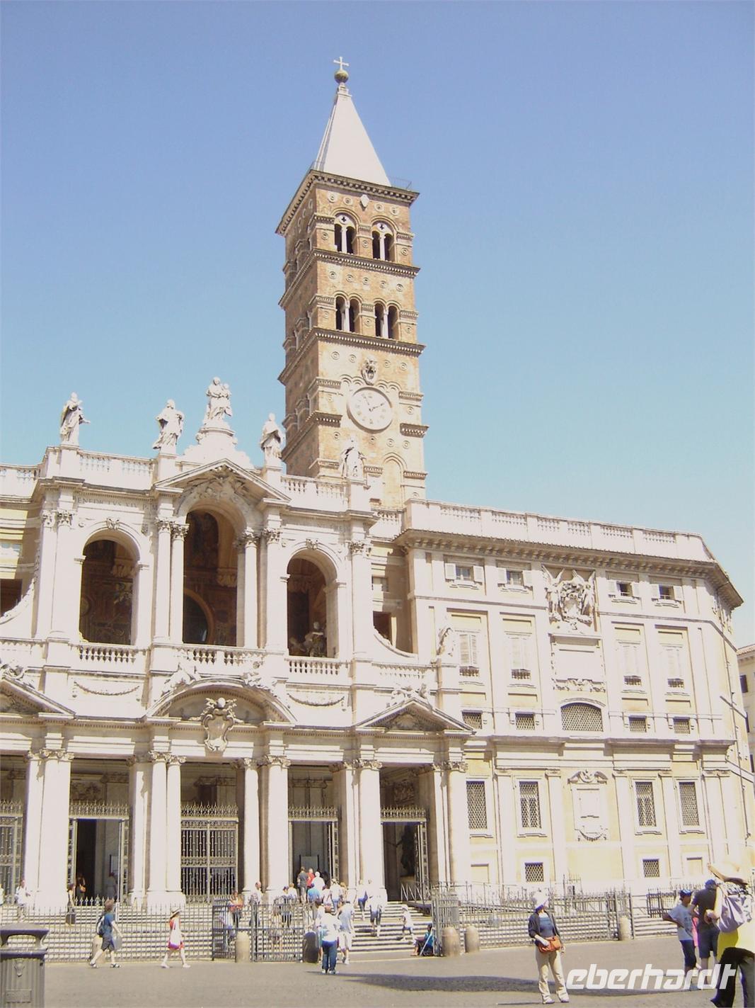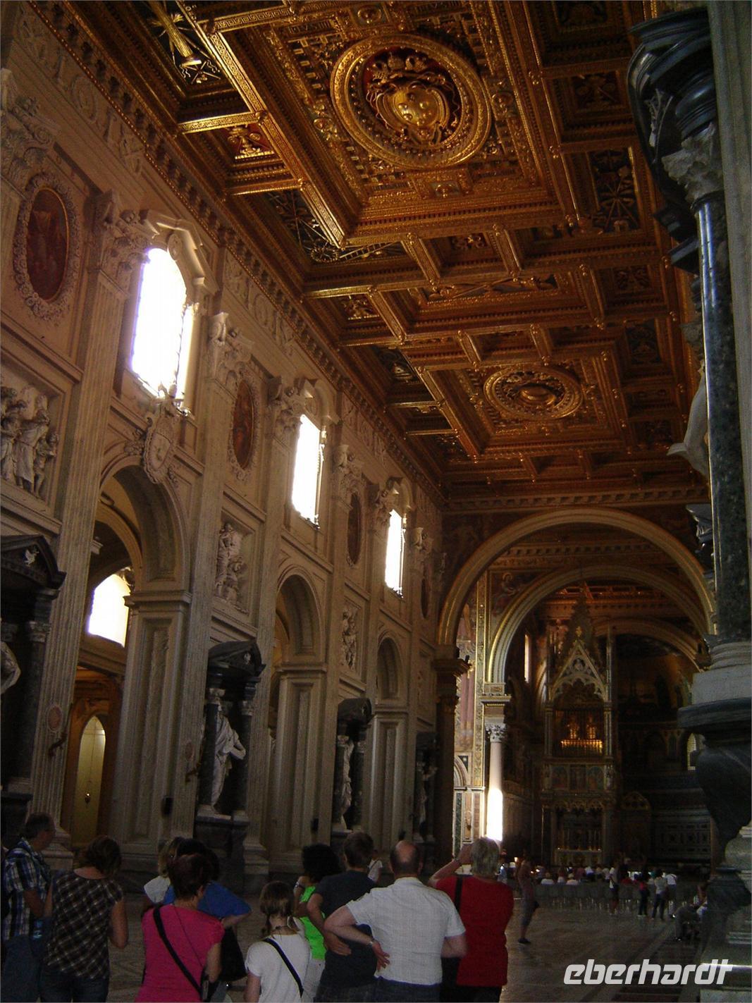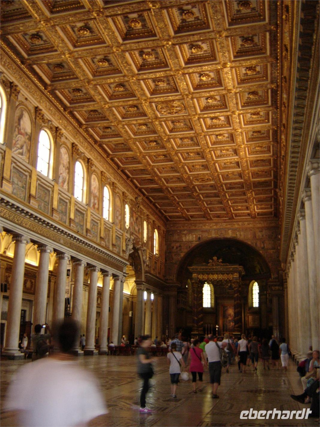 Nach dieser Besichtigung fuhren wir mit der Kirche Santa Maria de Maggiore, zu Deutsch Groß Sankt Maria) fort. Diese ist eine der vier Patriarchalbasiliken Roms und gehört auch zu den sieben Pilgerkirchen. Auf dem Esquilinhügel präsentiert sie sich mit einer wunderschönen Außenfassade. Doch nicht nur ihr Äußeres gewinnt die Herzen der Touristen, sondern auch die großartige Innengestaltung mit farbenfrohen Mosaiken und Wandteppichen.