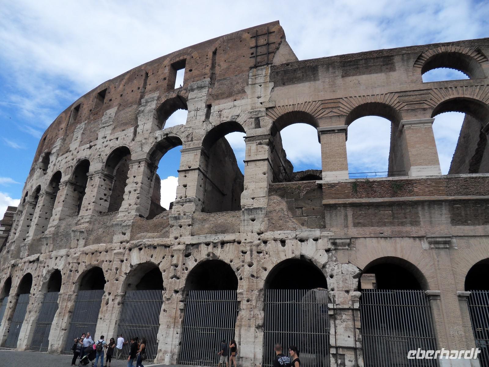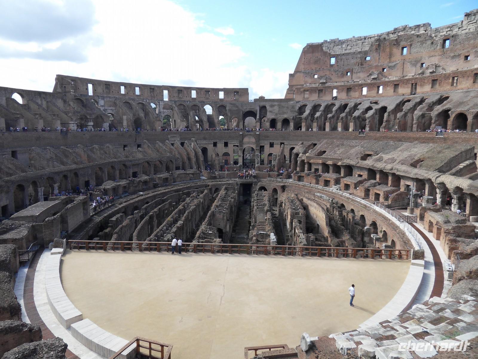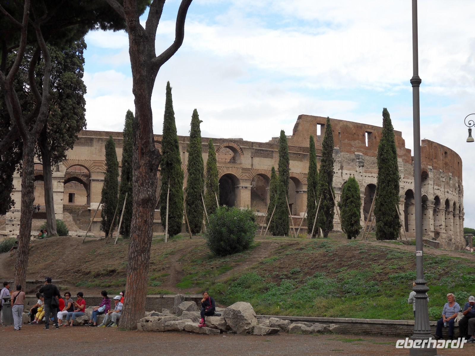 Beinahe noch mitten in der Nacht ging es für uns los, wir wurden zum Flughafen Berlin-Tegel gebracht. Das frühe Aufstehen hat allerdings einen großen Vorteil: Nach der relativ pünktlichen Landung, einem versteckten Weg zu den Kofferbändern und dem langen Warten auf das Gepäck am Flughafen waren wir schon mittags im Hotel, so dass wir nach kurzer Zeit unsere Zimmer beziehen konnten und noch den ganzen Nachmittag für erste Erkundungen in Rom hatten. So bot ich meinen Gästen an, sich mit mir das Kollosseum von innen anzusehen. Ich glaube, meinen Mitreisenden ging es genauso wie mir - wir kamen aus der U-Bahn-Station und vor uns tauchte das gewaltige Bauwerk auf - ich war im ersten Moment wirklich sprachlos. Relativ zügig bekamen wir die Eintrittskarten, die auch noch für das Forum Romanum galten, was wir uns natürlich ebenso gern ansahen, auch wenn die Zeit dafür etwas knapp war. Am Abend machten wir uns wieder mit der U-Bahn auf den Weg zurück zum Hotel, wo uns ein leckeres Abendessen erwartete. Leider mussten wir aber auch feststellen, dass die Gerüchte wie "in Rom wird viel geklaut" auch stimmen, denn so hatten wir gleich am ersten Tag den Verlust eines Geldbeutels zu beklagen. Das machte uns natürlich für die nächsten Tage um so vorsichtiger.