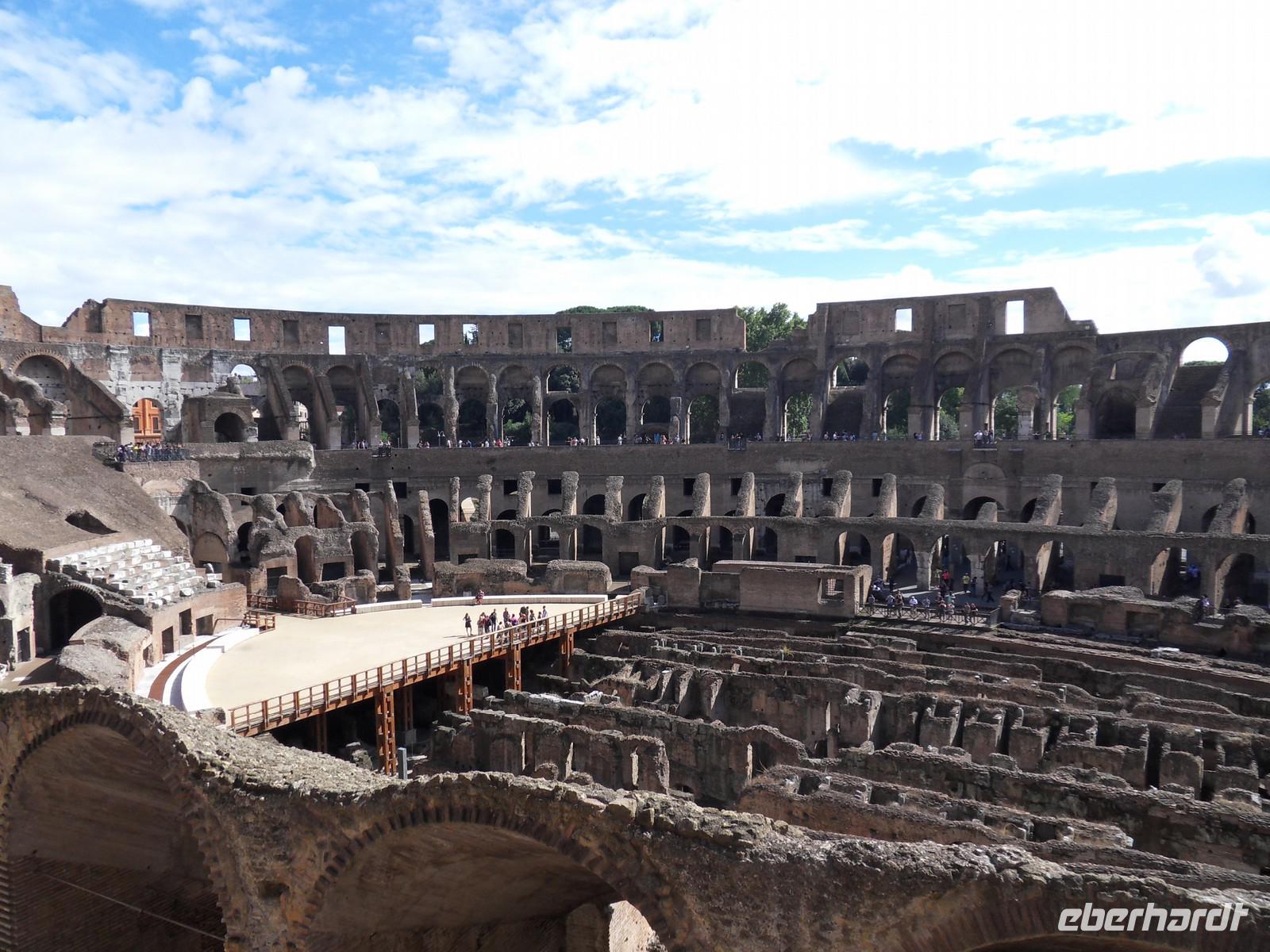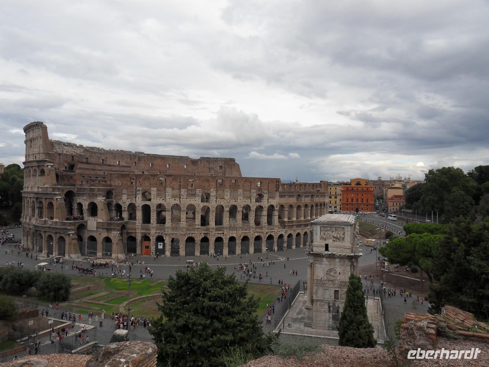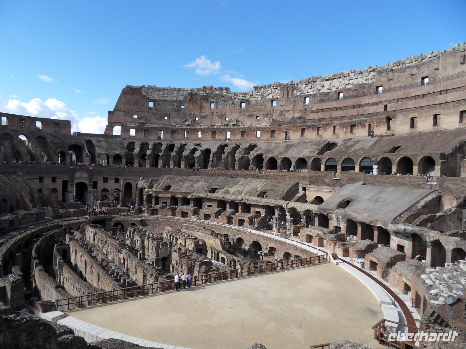 Beinahe noch mitten in der Nacht ging es für uns los, wir wurden zum Flughafen Berlin-Tegel gebracht. Das frühe Aufstehen hat allerdings einen großen Vorteil: Nach der relativ pünktlichen Landung, einem versteckten Weg zu den Kofferbändern und dem langen Warten auf das Gepäck am Flughafen waren wir schon mittags im Hotel, so dass wir nach kurzer Zeit unsere Zimmer beziehen konnten und noch den ganzen Nachmittag für erste Erkundungen in Rom hatten. So bot ich meinen Gästen an, sich mit mir das Kollosseum von innen anzusehen. Ich glaube, meinen Mitreisenden ging es genauso wie mir - wir kamen aus der U-Bahn-Station und vor uns tauchte das gewaltige Bauwerk auf - ich war im ersten Moment wirklich sprachlos. Relativ zügig bekamen wir die Eintrittskarten, die auch noch für das Forum Romanum galten, was wir uns natürlich ebenso gern ansahen, auch wenn die Zeit dafür etwas knapp war. Am Abend machten wir uns wieder mit der U-Bahn auf den Weg zurück zum Hotel, wo uns ein leckeres Abendessen erwartete. Leider mussten wir aber auch feststellen, dass die Gerüchte wie "in Rom wird viel geklaut" auch stimmen, denn so hatten wir gleich am ersten Tag den Verlust eines Geldbeutels zu beklagen. Das machte uns natürlich für die nächsten Tage um so vorsichtiger.