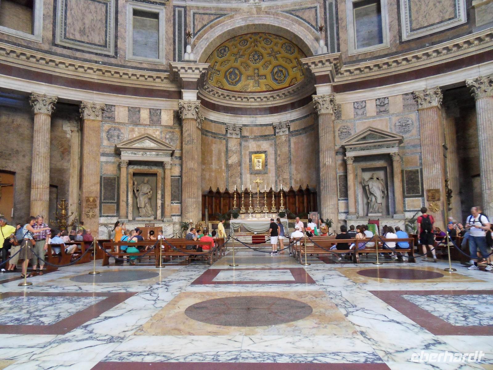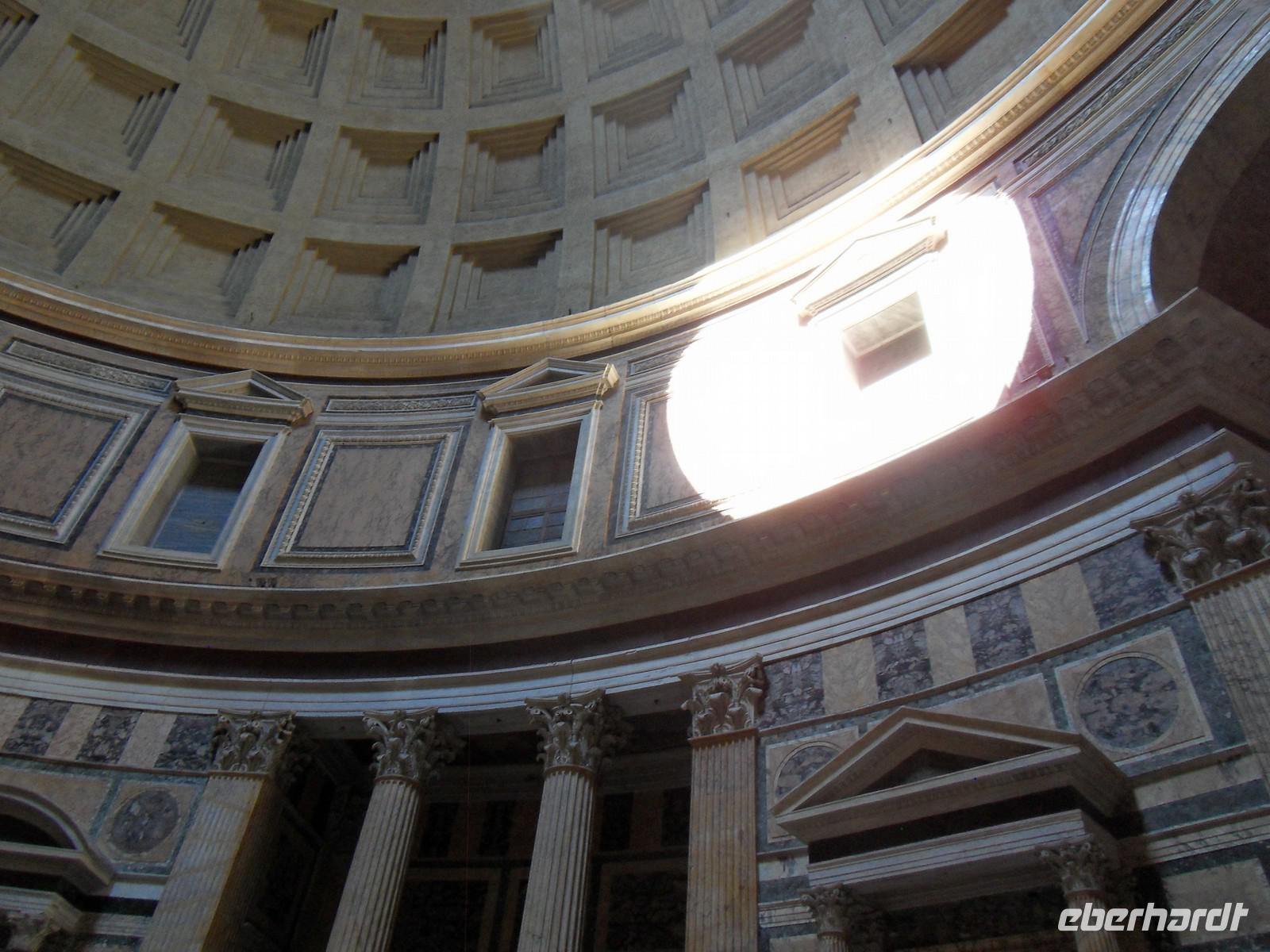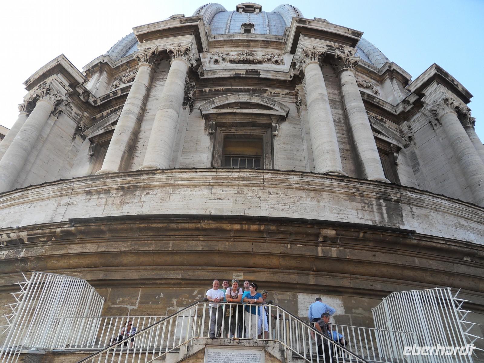 Nach dem Frühstück trafen wir noch im Hotel unsere Stadtführerin Agnieszka. Mit ihr fuhren wir nach einer kurzen Vorstellungsrunde mit der U-Bahn bis zur Spanischen Treppe, die auch am Morgen erstaunlich gut besucht ist! Nach einer kurzen Fotopause ging es durch Sträßchen und Gässchen weiter zum berühmten Trevi-Brunnen! Natürlich musste ich hier Münzen hineinwerfen, aber wichtig: mit der rechten Hand über die linke Schulter!! Nach etwas Freizeit, dass ich für ein leckeres italienisches Eis nutzte, gingen wir weiter zum Pantheon, das zwischen Häusern versteckt liegt und erst zu sehen ist, wenn man schon gleich da ist. Die Dimensionen dieses Baus werden beim Besuch noch deutlicher, denn die riesige Kassettendecke mit dem 9m breiten, offenen Okulus, durch den es auch hineinregnen kann, sind atemberaubend. Zum Glück gibt es aber im Boden auch kleine integrierte Abflusslöcher für das Regenwasser. Man hat also auch schon im 1. Jh. nach Christus an alles gedacht.