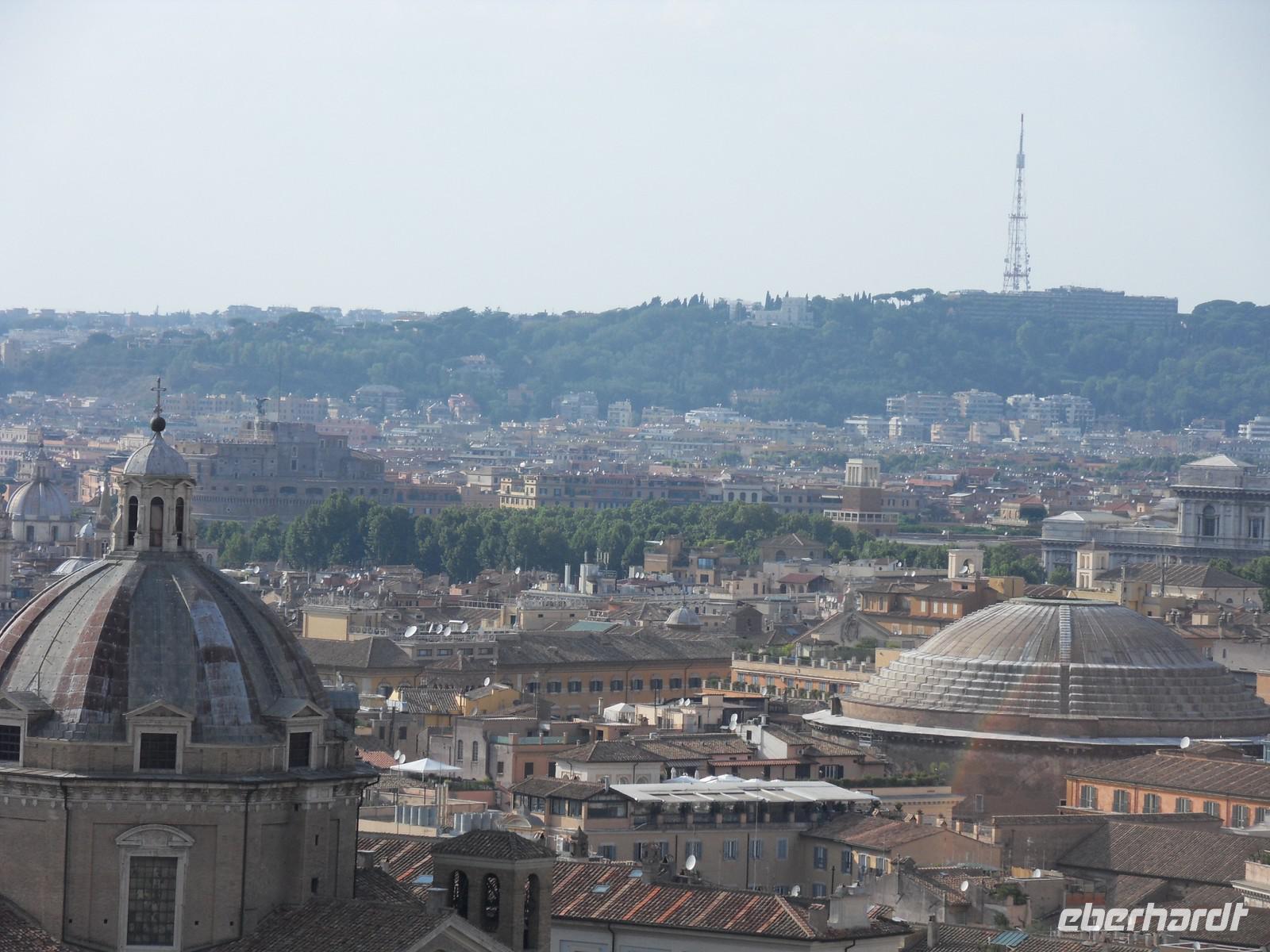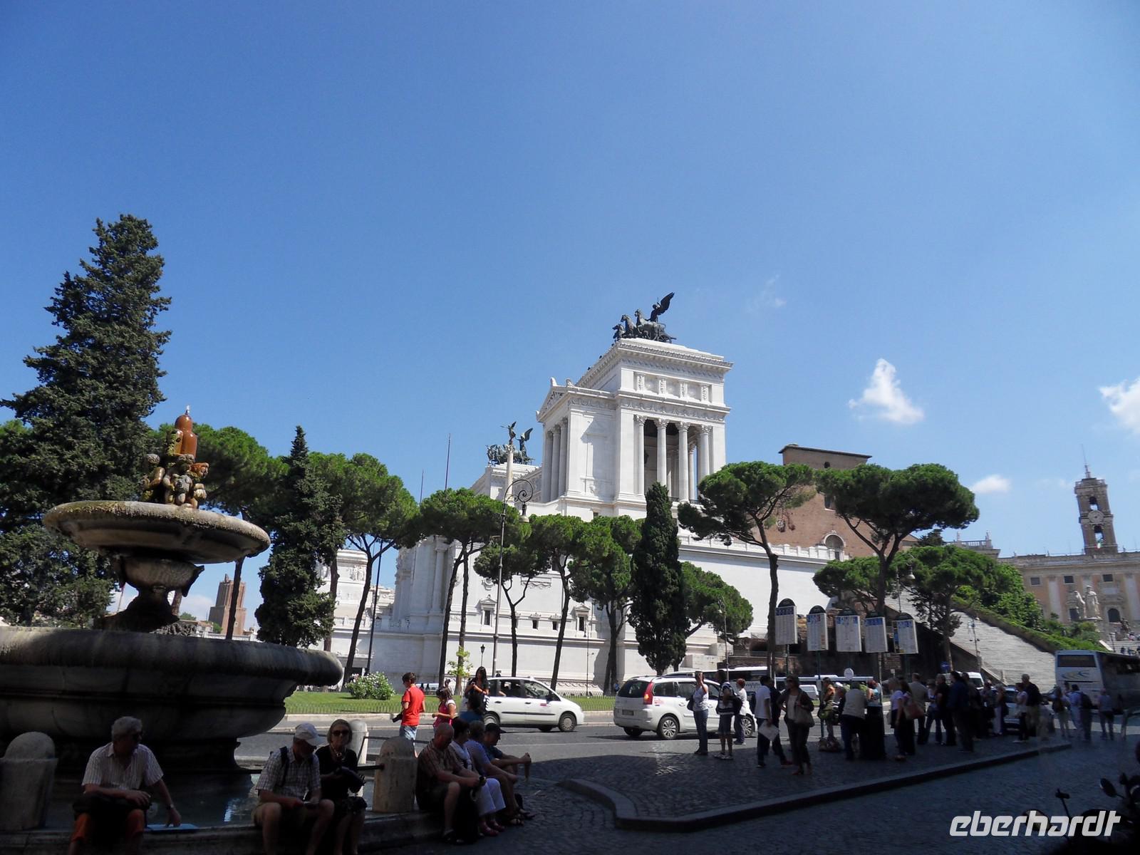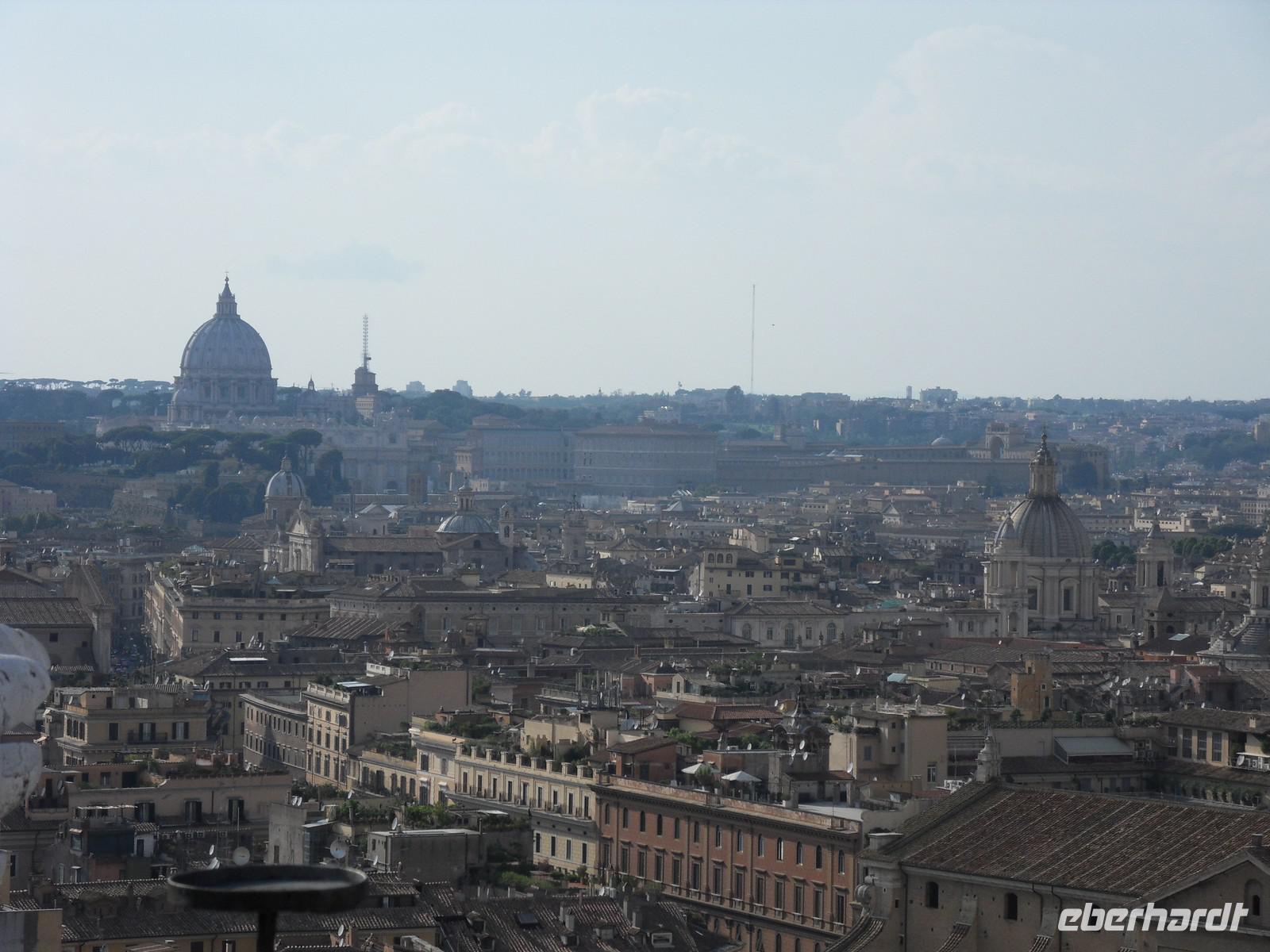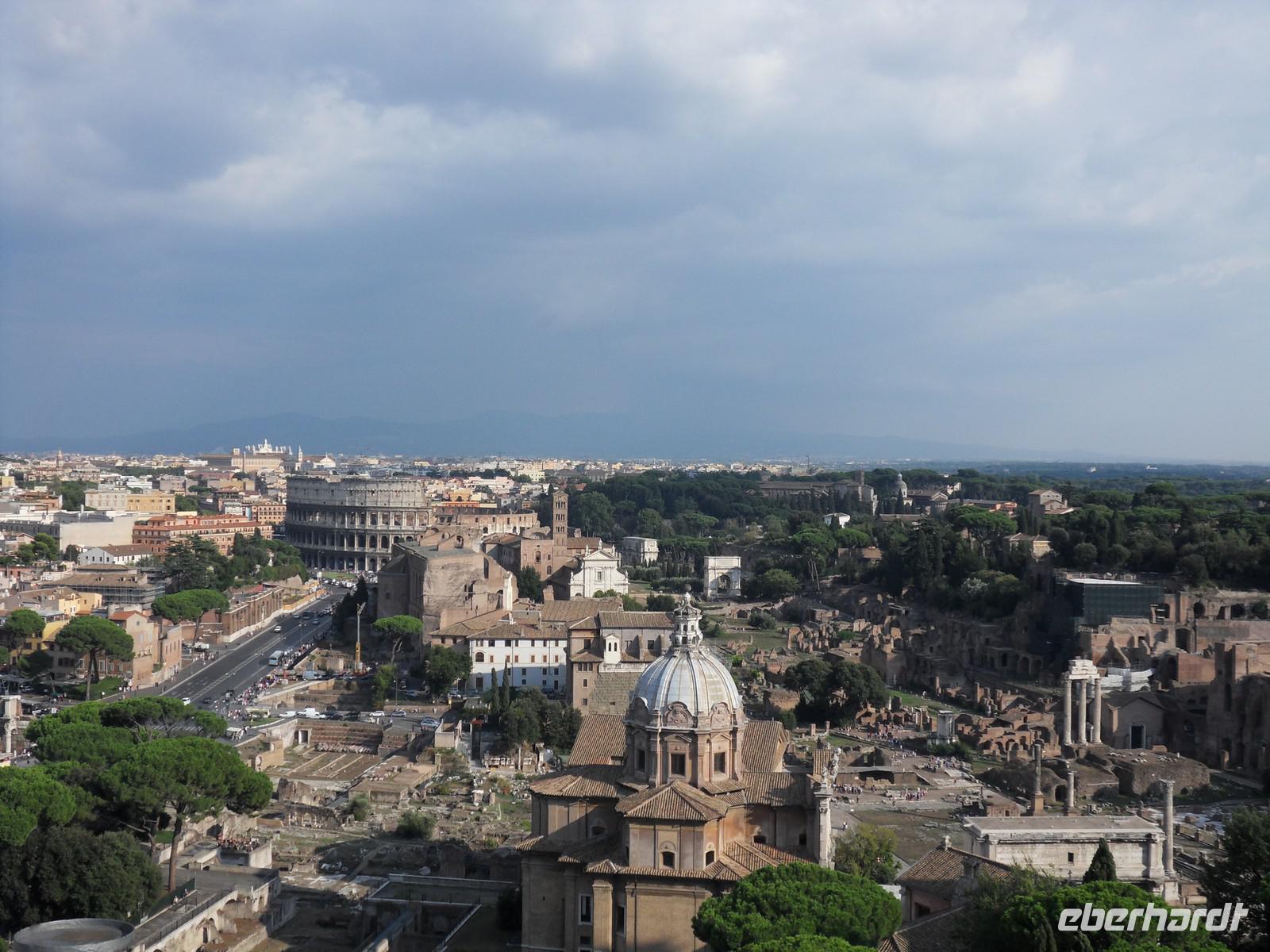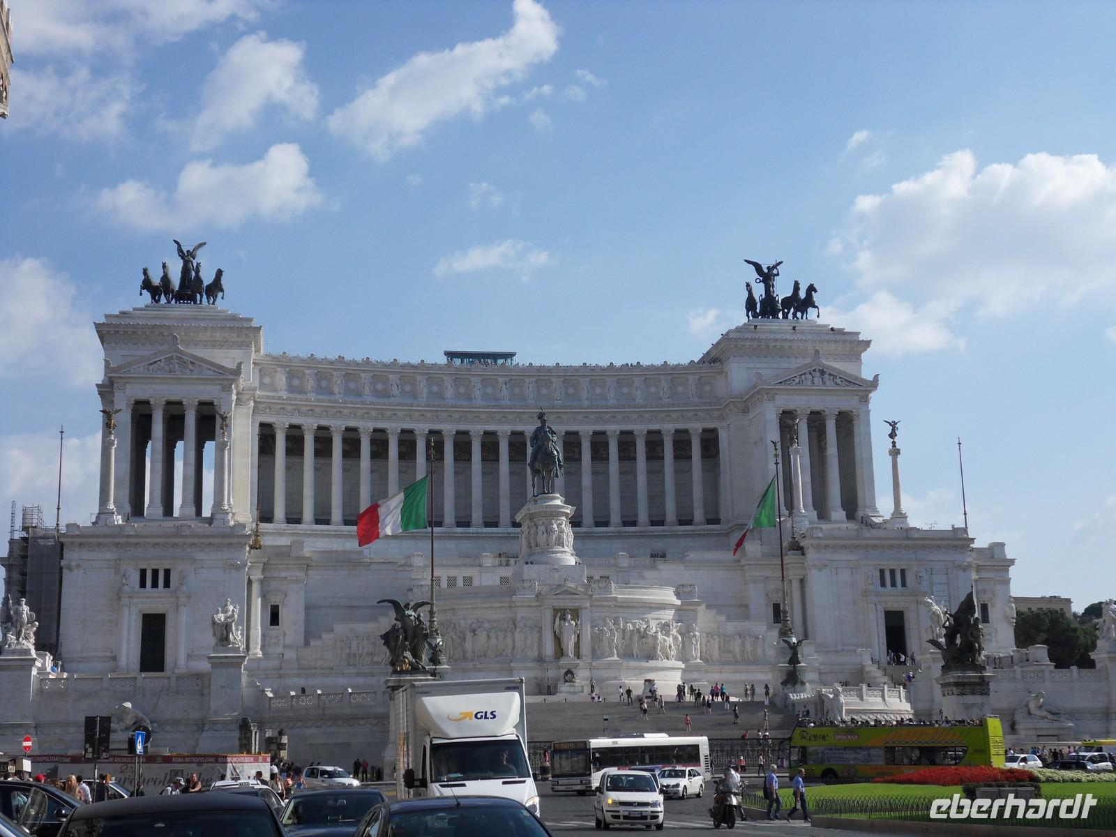 Nach einer Mittagspause ging es für uns weiter zum Kapitolshügel. Unterwegs kamen wir vorbei am Haus von Silvio Berlusconi sowie an den Wohnungen von Anna Magnani und Sophia Loren. Auf dem von Michelangelo entworfenen Kapitolshügel - dem früheren Macht- und Religionszentrum des Antiken Roms - angekommen, erwartete uns der Senatorenpalast, heute Sitz des Bürgermeisters von Rom, der Konservatorenpalast, der Palazzo Nuovo - in beiden befinden sich die Kapitolinischen Museen - sowie eine Kopie des Reiterstandbildes von Mark Aurel. Letztere überlebte nur bis in die heutige Zeit, weil sie im Mittelalter fälschlicherweise für eine Darstellung des ersten christlichen Kaisers Konstantin gehalten wurde. Vorbei am Forum Romanum ging es weiter zu den Kaiserforen und zum Kollosseum, wo unsere Stadtführung heute endete. Während der Freizeit am Nachmittag hatte man die Möglichkeit, das "Monumento Vittorio Emmanuel II", das Nationaldenkmal - von den Römern liebevoll "Schreibmaschine" genannt - zu besichtigen. Für 7 € kann man mit dem Lift bis nach oben fahren und einen sagenhaften Ausblick sowohl über das antike Rom mit Kollosseum und Forum Romanum als auch bis hinüber zum Pantheon, Engelsburg und Petersdom genießen. Zum Abendessen waren wir wieder im Hotel und natürlich gab es auch heute als Vorspeise wieder Pasta!