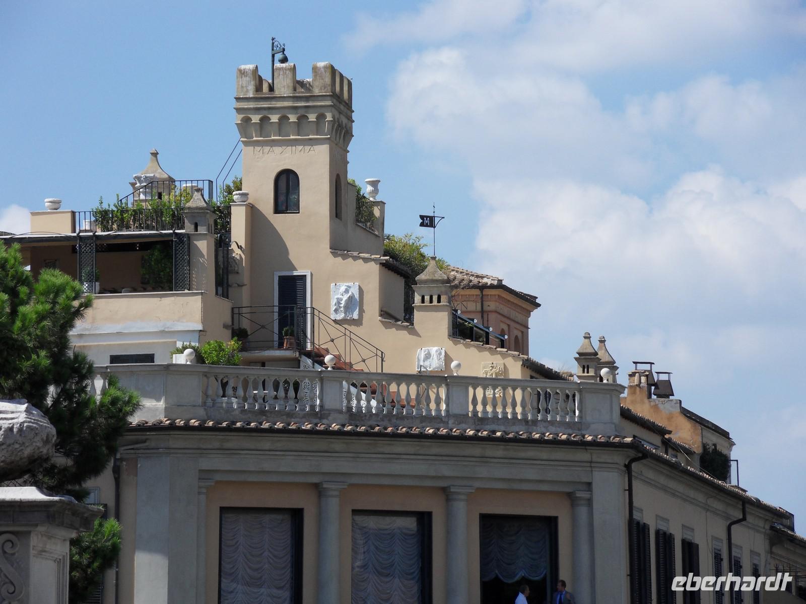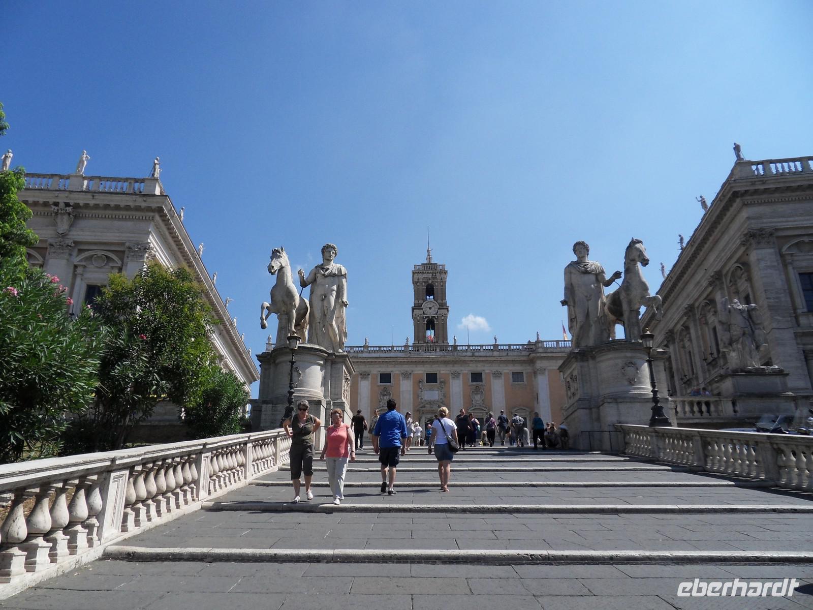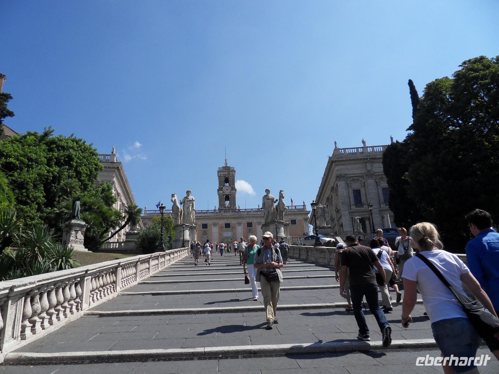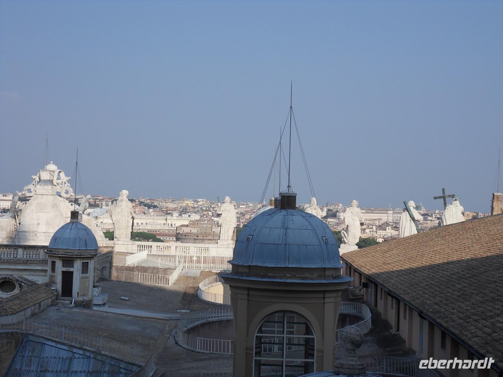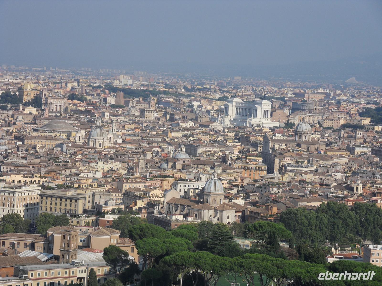 Nach einer Mittagspause ging es für uns weiter zum Kapitolshügel. Unterwegs kamen wir vorbei am Haus von Silvio Berlusconi sowie an den Wohnungen von Anna Magnani und Sophia Loren. Auf dem von Michelangelo entworfenen Kapitolshügel - dem früheren Macht- und Religionszentrum des Antiken Roms - angekommen, erwartete uns der Senatorenpalast, heute Sitz des Bürgermeisters von Rom, der Konservatorenpalast, der Palazzo Nuovo - in beiden befinden sich die Kapitolinischen Museen - sowie eine Kopie des Reiterstandbildes von Mark Aurel. Letztere überlebte nur bis in die heutige Zeit, weil sie im Mittelalter fälschlicherweise für eine Darstellung des ersten christlichen Kaisers Konstantin gehalten wurde. Vorbei am Forum Romanum ging es weiter zu den Kaiserforen und zum Kollosseum, wo unsere Stadtführung heute endete. Während der Freizeit am Nachmittag hatte man die Möglichkeit, das "Monumento Vittorio Emmanuel II", das Nationaldenkmal - von den Römern liebevoll "Schreibmaschine" genannt - zu besichtigen. Für 7 € kann man mit dem Lift bis nach oben fahren und einen sagenhaften Ausblick sowohl über das antike Rom mit Kollosseum und Forum Romanum als auch bis hinüber zum Pantheon, Engelsburg und Petersdom genießen. Zum Abendessen waren wir wieder im Hotel und natürlich gab es auch heute als Vorspeise wieder Pasta!