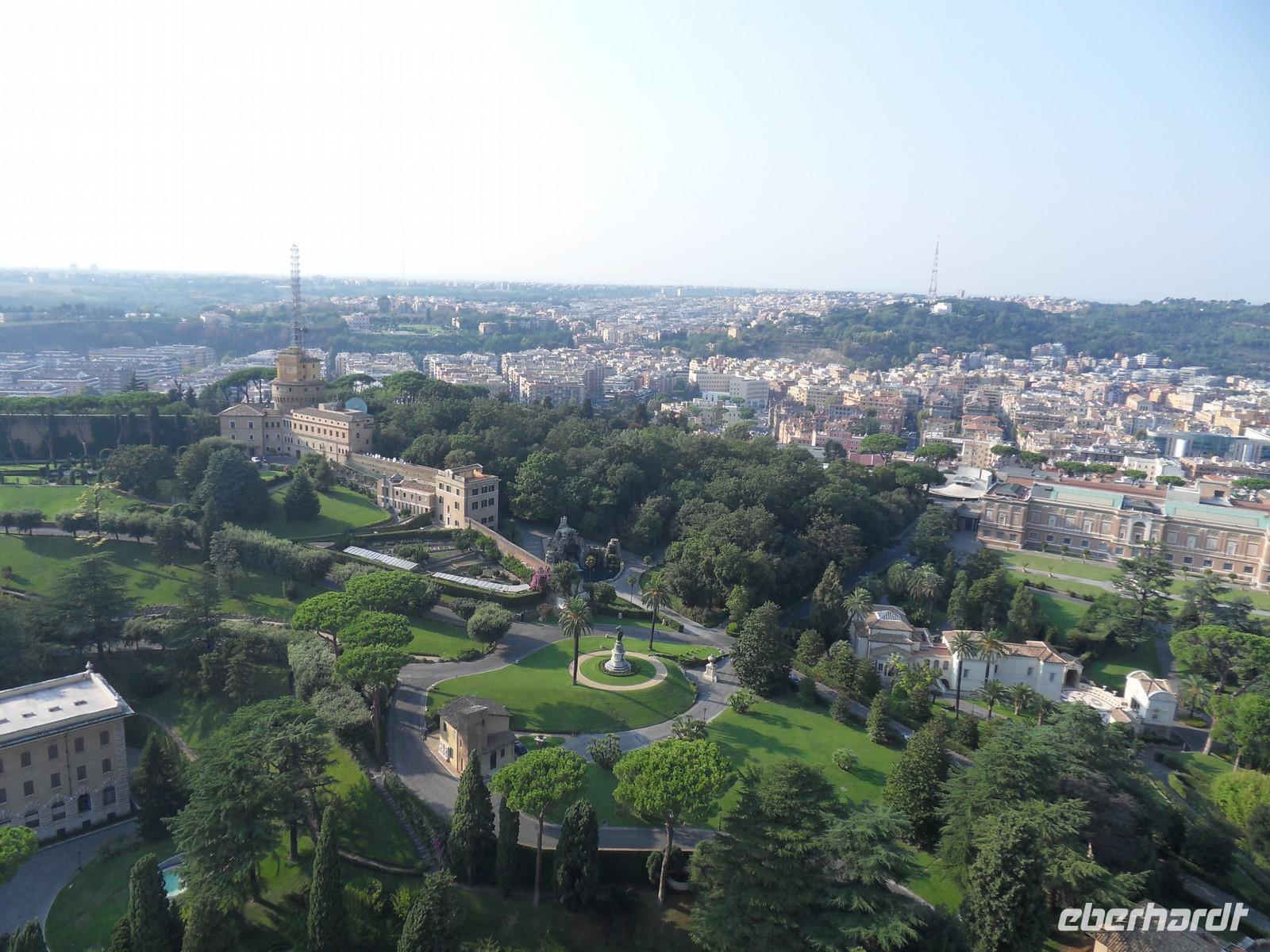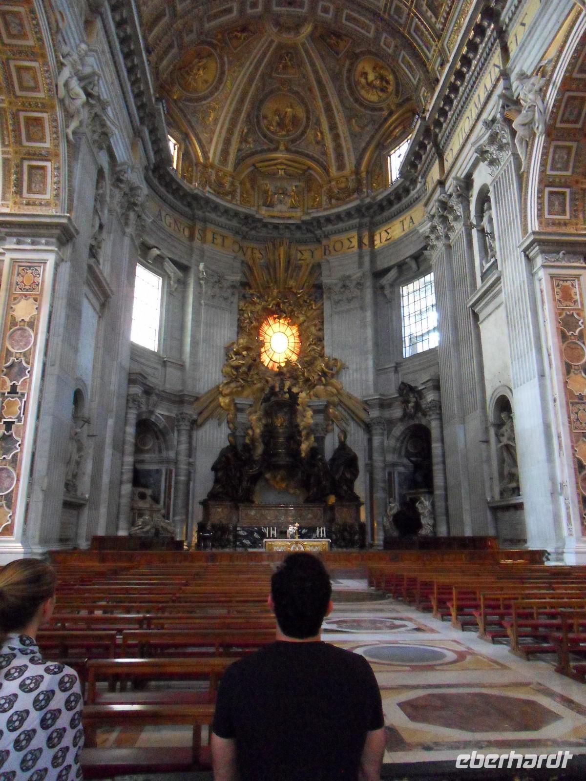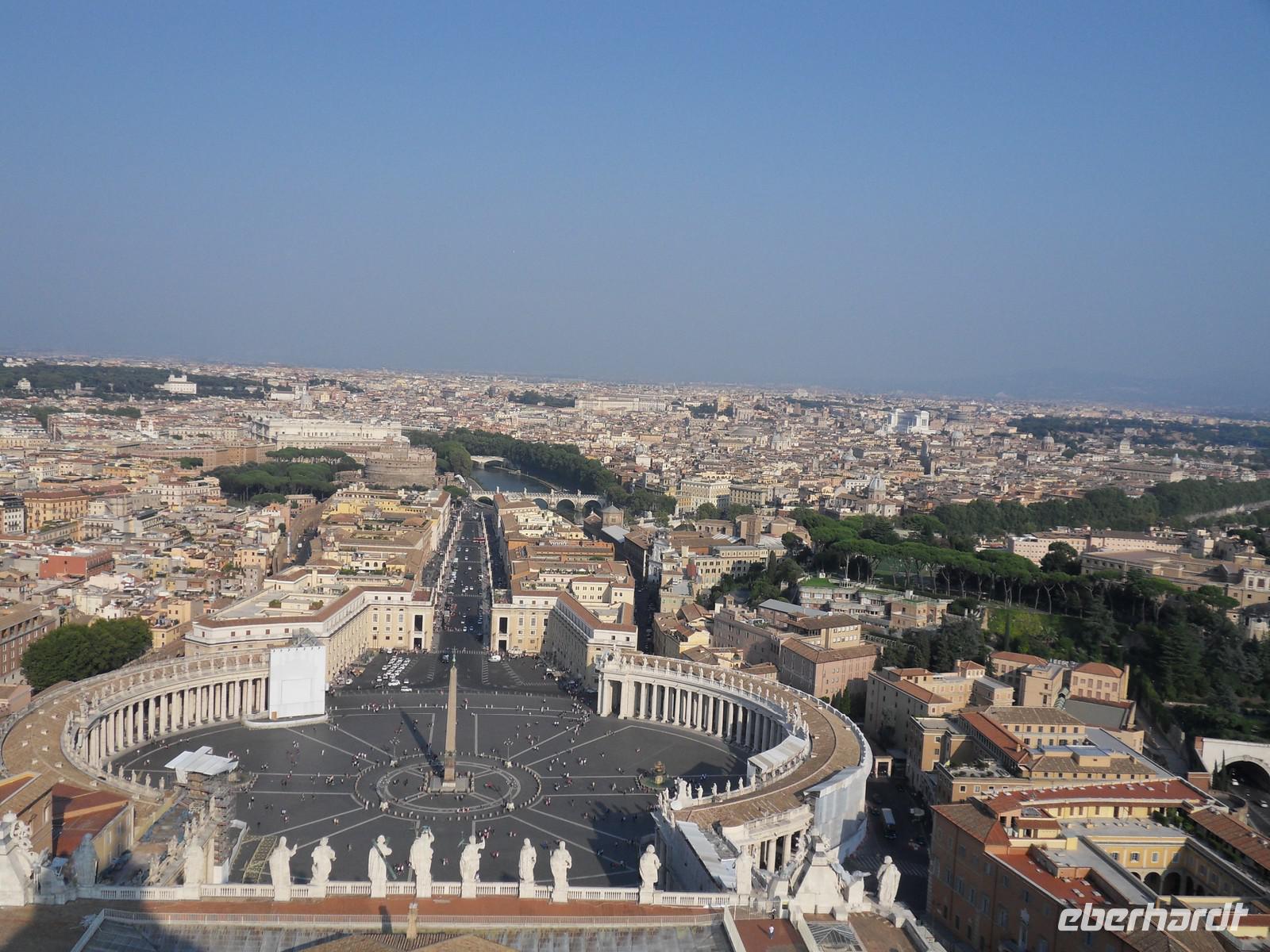 Unser nächster Programmpunkt war die Kirche Santa Maria Maggiore. Hier konnten wir prächtige, leicht gewölbte Kassettendecke bestaunten, die mit Gold aus Südamerika verziert ist. Nach einer Mittagspause ging es weiter zum - wie ich finde - Höhepunkt des heutigen Tages: in den Petersdom. Leider befand sich der Papst derzeit nicht in Rom, doch wir sahen trotzdem Wachmänner der Schweizer Garde und waren beeindruckt von den gewaltigen Ausmaßen des Bauwerks, in das sogar der Kölner Dom hineinpassen würde. Nachdem uns Agnieszka zu zahlreichen Besonderheiten wie dem Heiligen Jahr, der Pieta sowie den Größenverhältnissen und zahlreichen Päpsten und königlichen Herrschern Europas Erklärungen gegeben hat, nutzten wir die Freizeit am Nachmittag, um Briefmarken in der Vatikanischen Post zu holen oder die Kuppel des Petersdoms zu erklimmen. Am einfachsten ging das zunächst per Lift und dann waren es nur noch 320 Stufen bis ganz nach oben. Der Ausblick war einfach sagenhaft, auch wenn sich ein Foto durch die Menge der Menschen etwas schwierig gestaltete. Mit vielen Informationen und tollen Eindrücken kehrten wir dann ins Hotel zurück, wo heute wieder ein leckeres Abendessen auf uns wartete.