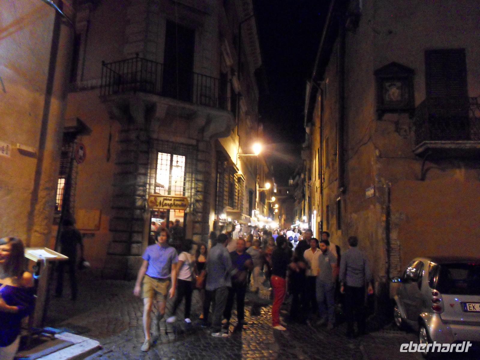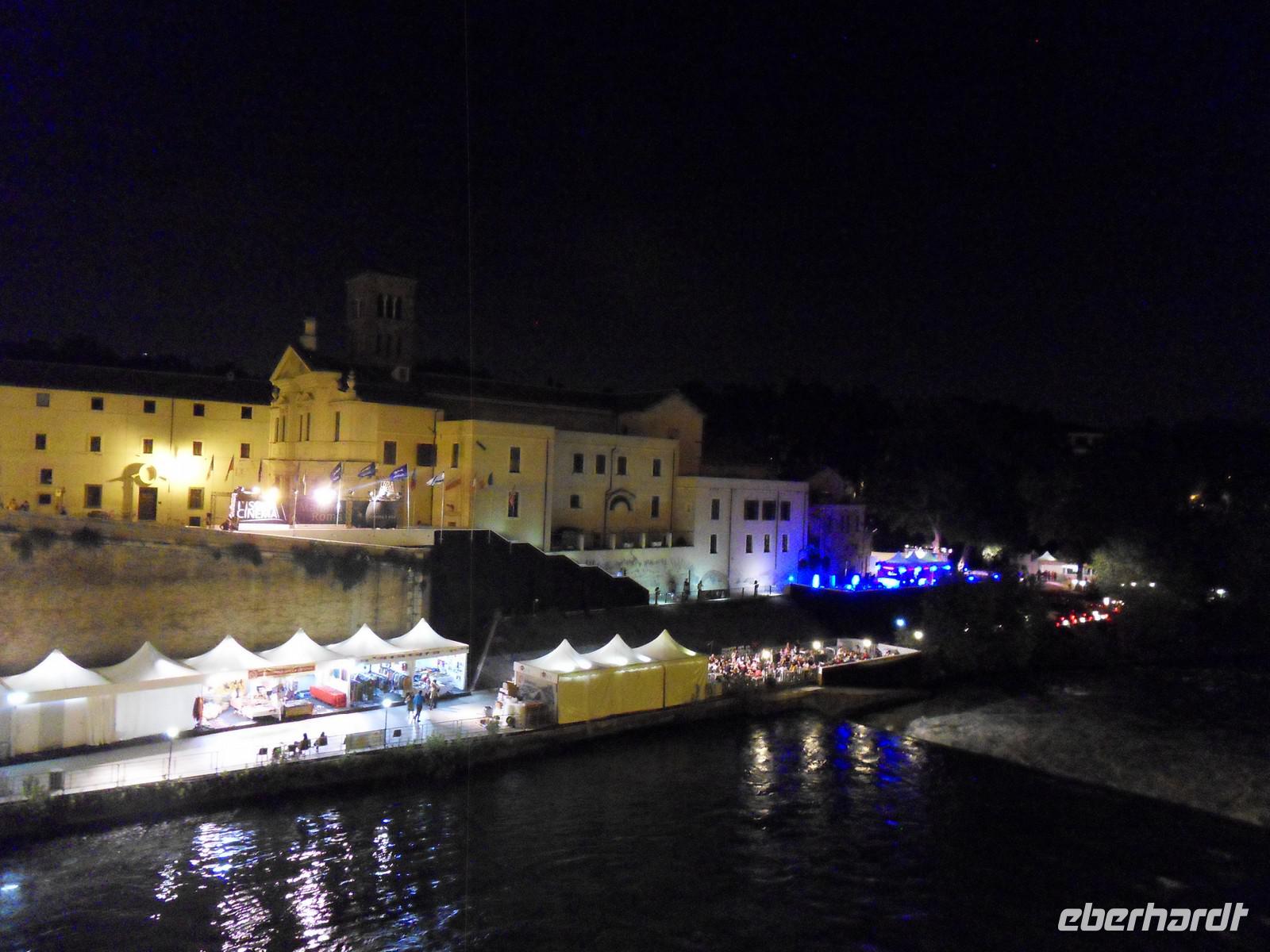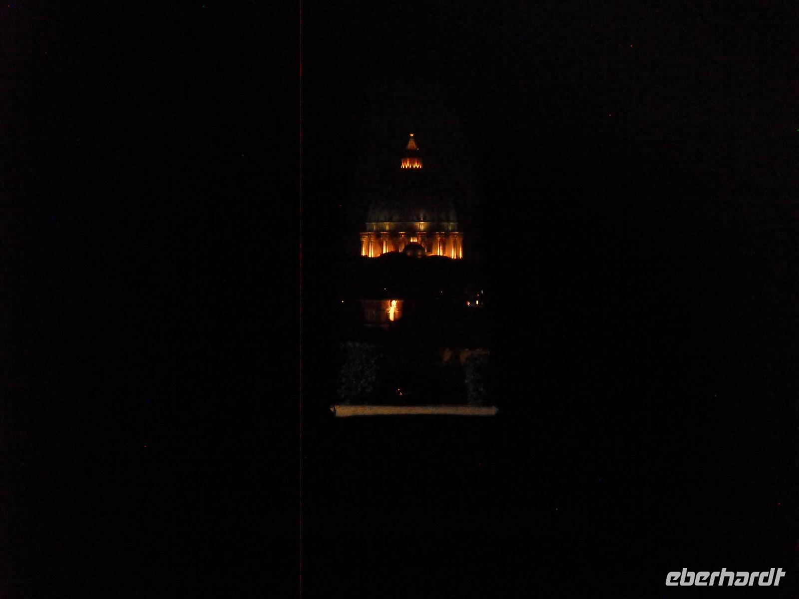 Das Abendessen war lecker und reichlich, wobei zwei Vorspeisen mit Pasta eigentlich schon mehr als genug waren und wir Mühe hatten, den Hauptgang überhaupt noch zu schaffen. Trotzdem war das Personal sehr freundlich und das kleine Lokal gemütlich. Nach dem Essen holte uns Agnieszka zur Lichterfahrt durch Rom ab. Über die Tiberinsel spazierten wir zum Bus und konnten so noch einen Eindruck vom "Sommerfestival" bekommen, dass Römer über den Sommer in der Stadt halten soll. So gibt es zum Beispiel Cocktailbars am Tiberufer und Freiluftkinos. Mit dem Bus ging es dann vorbei am Kapitolshügel, dem Kollosseum, den Caracallathermen, zum durch das Schlüsselloch der Maltester schauen - weiter entlang der Aurelianischen Stadtmauer, zur Santa Maria in Cosmedin mit dem Mund der Wahrheit, vorbei am Quirinalspalast und oberhalb der Spanischen Treppe entlang bis zur Piazza del Popolo und zum Petersplatz, der auch bei Nacht ein ganz tolles Fotomotiv ist. Hier hieß es dann leider Abschied nehmen von Agnieszka, unserer tollen Stadtführerin. Und auch für uns war der Abschied von Rom nicht mehr weit - die letzte Nacht in unserem Hotel brach an.