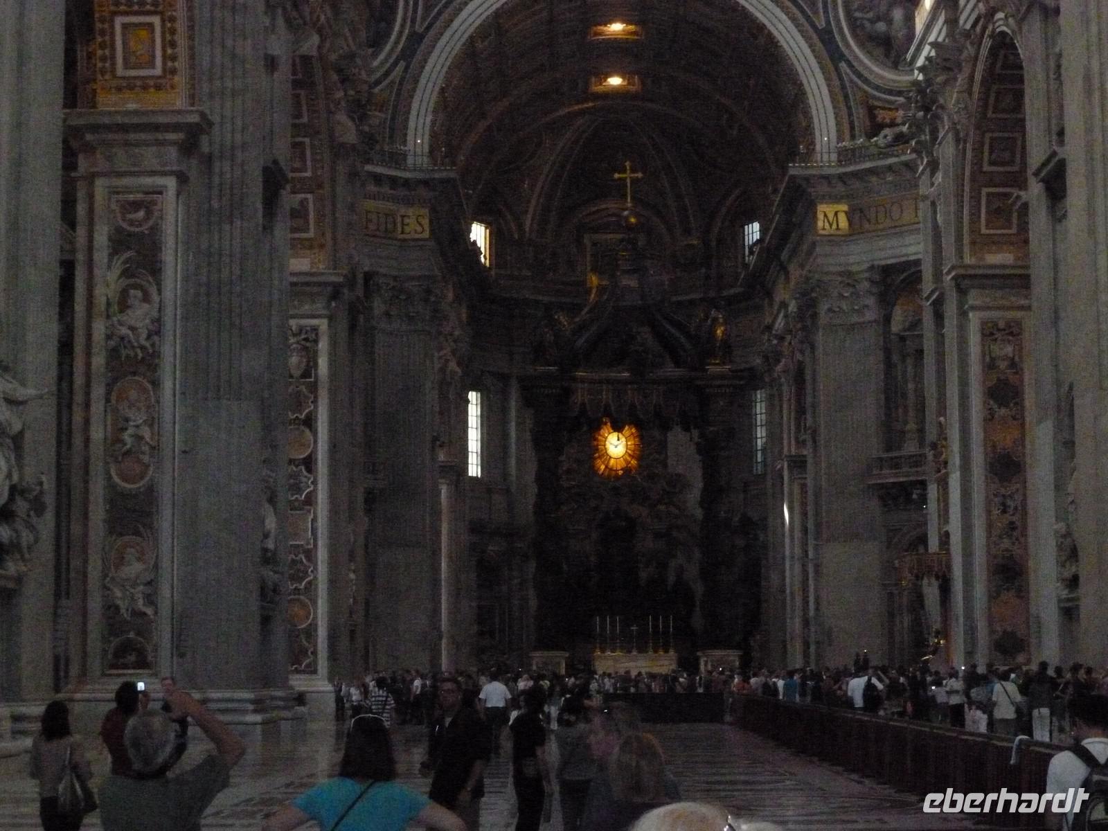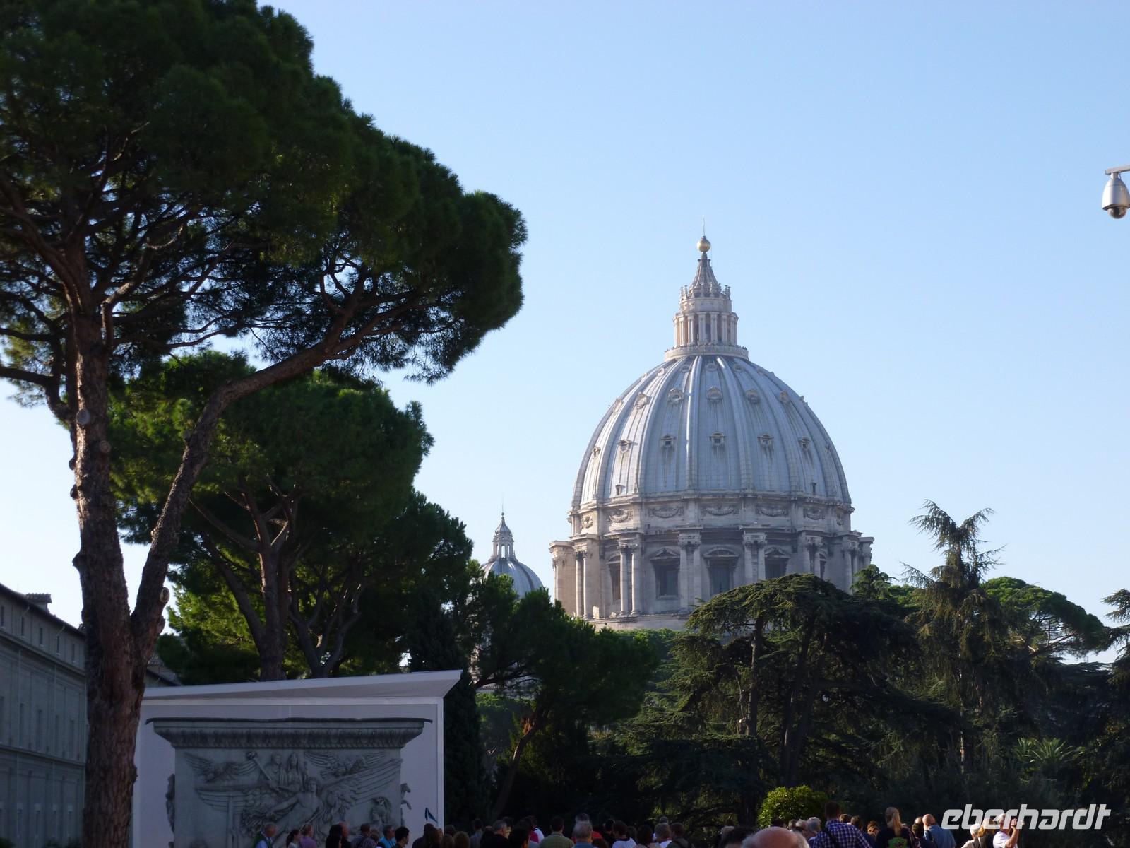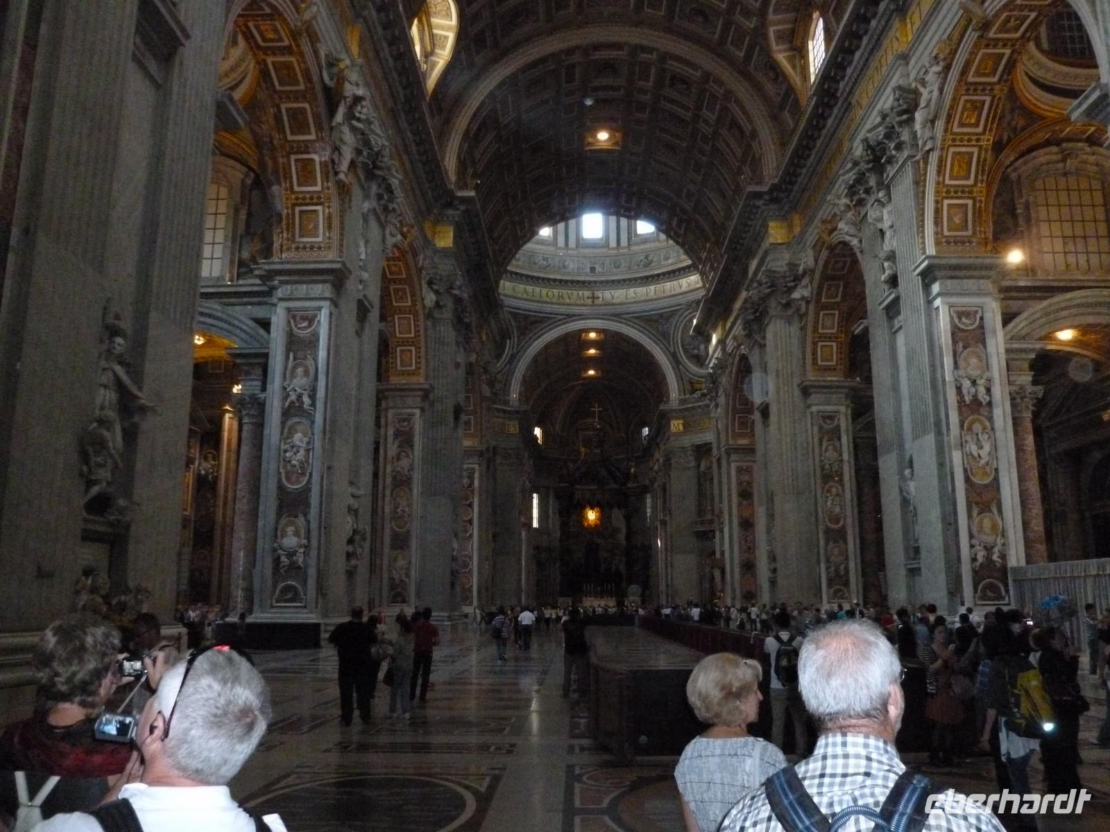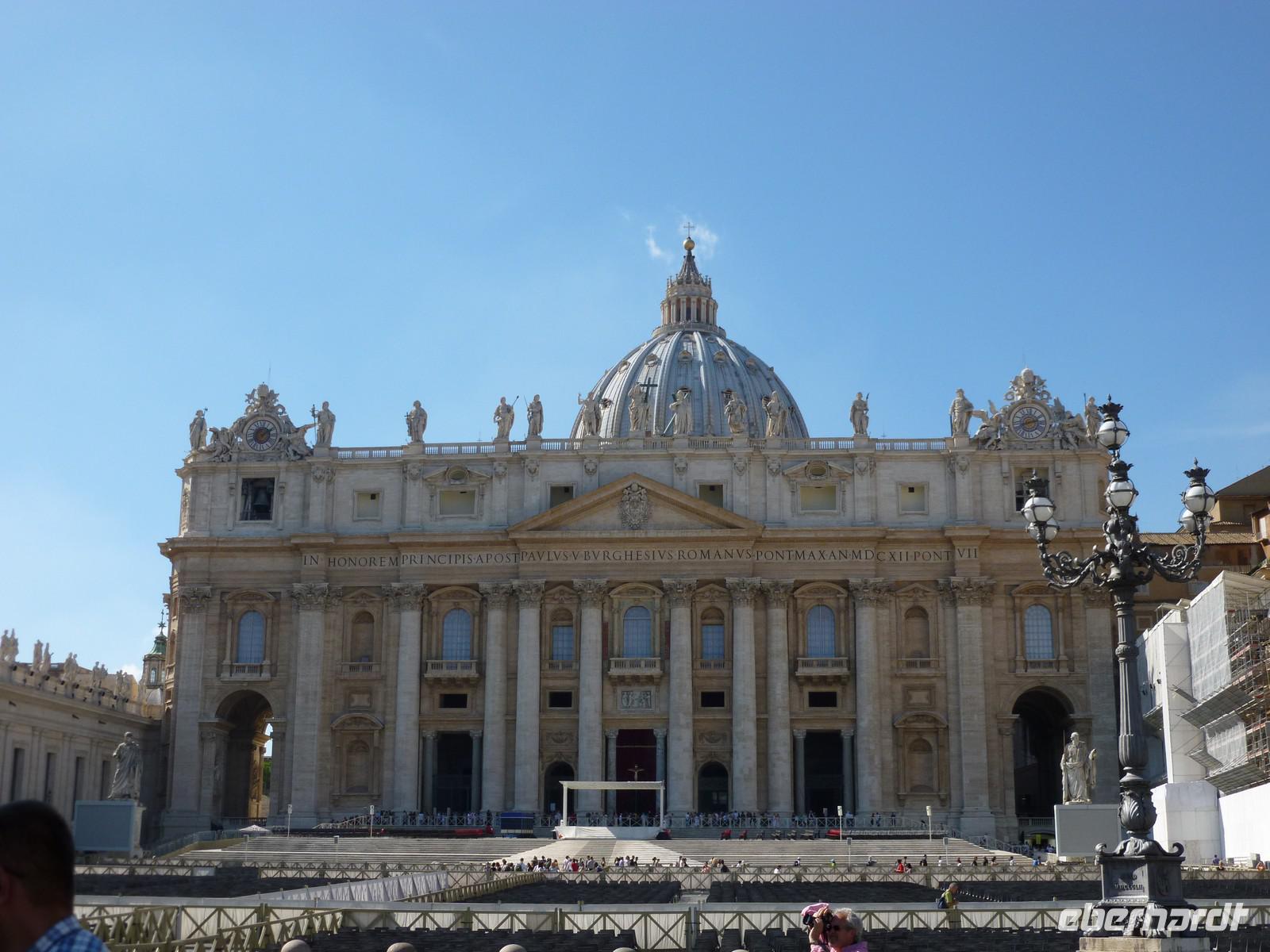 Unser dritter Tag in Rom stand ganz im Zeichen der Kirchen und Kathedralen. Gleich nach dem Frühstück machten wir uns auf den Weg zur San Giovanni Kirche. Dort wartete bereits Susanne und nahm uns mit in die Geschichte des Christlichen Roms. Schon der Eingangsbereich schien übermächtig groß und auch der Innenraum zeugte von einer architektonischen Meisterleistung. Nach einem ausgiebigen Rundgang ging es weiter zur nächsten Sehenswürdigkeit, der Basilika Santa Maria Maggiore. Diese erreichten wir nach einer kurzen Fahrt mit dem öffentlichen Linienbus. Bevor wir aber die Besichtigung der Kirche mit Ihrer wundervollen Kassettendecke begannen, genossen wir noch einen typischen italienischen Cappuccino in einem kleinen Straßencafé. Wunderschöne Malereien und Mosaikbilder sowie eine bewundernswerte Bauweise der Kirche erstaunten uns immer wieder auf Neue. Susanne hätte sicherlich noch eine ganze Weile über diese Kirche erzählen können aber es wartete noch die Hauptattraktion an diesem Tag, der Petersdom, eine der größten Kirchen der Welt und Sitz von Papst Benedict der XVI. Nicht nur die Gewissheit, dass ein einstiger deutscher Bischoff an oberster Stelle des Vatikans steht, machte uns Stolz diese Pilgerstätte für Millionen von Touristen und Gläubigen besichtigen zu dürfen. Man fühlte sich schon etwas klein in dieser riesigen Kirche, die nach ihrer langjährigen Baugeschichte 1626 als neue Grabeskirche von Papst Urban VIII. geweiht wurde. Nach der Besichtigung der Grotten, wo viele Päpste ihre letzte Ruhestätte in Marmorierten Särgen fanden, beendeten wir diesen wunderschönen Tag.