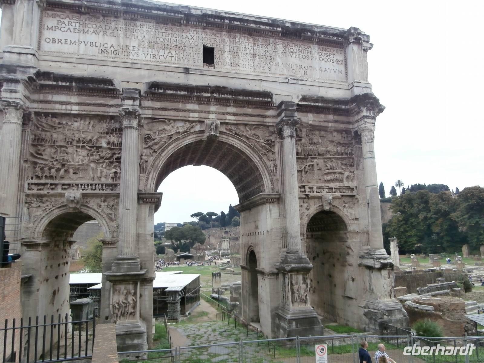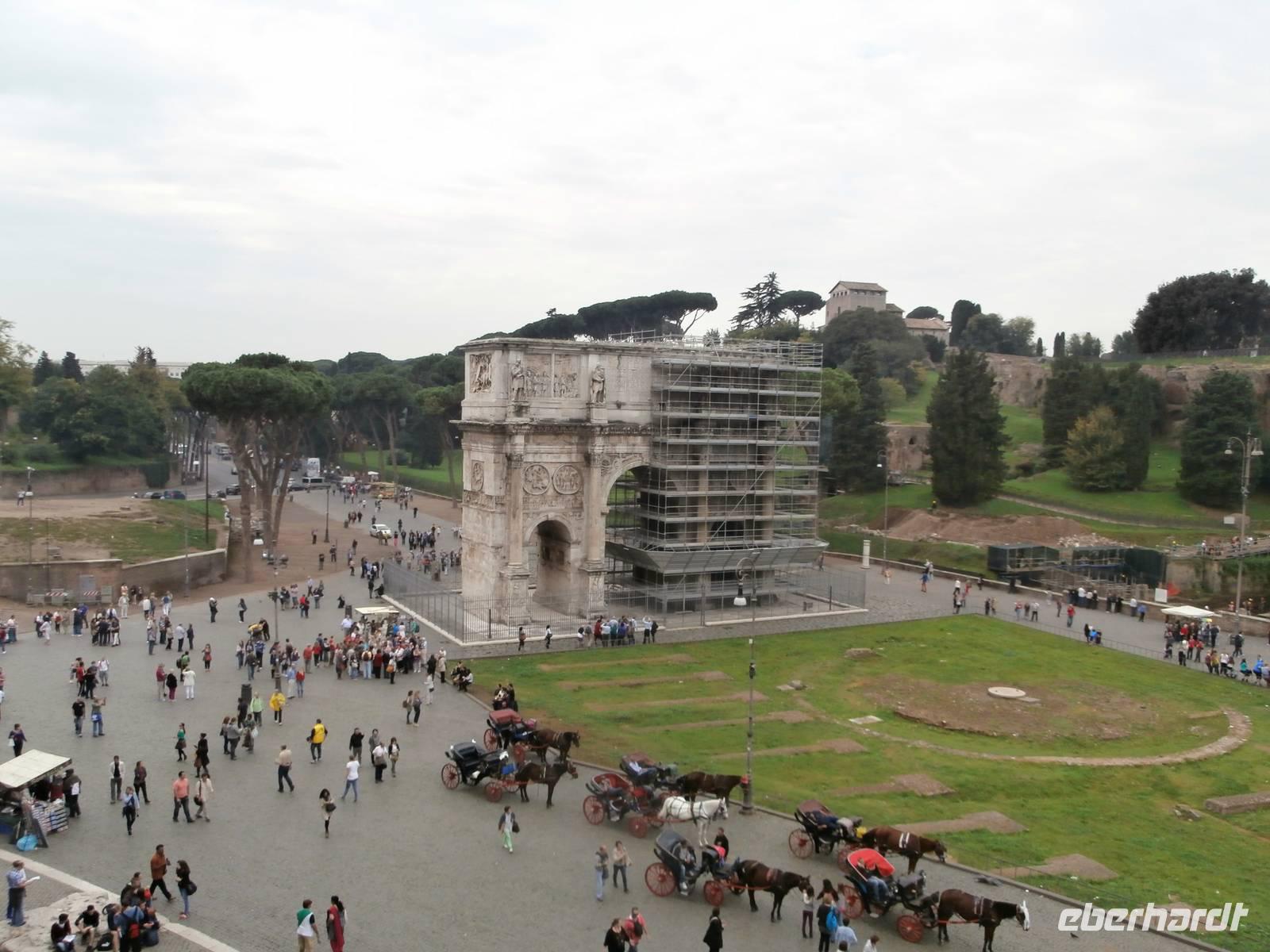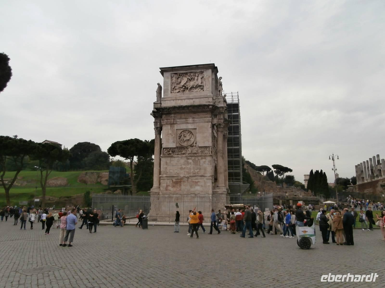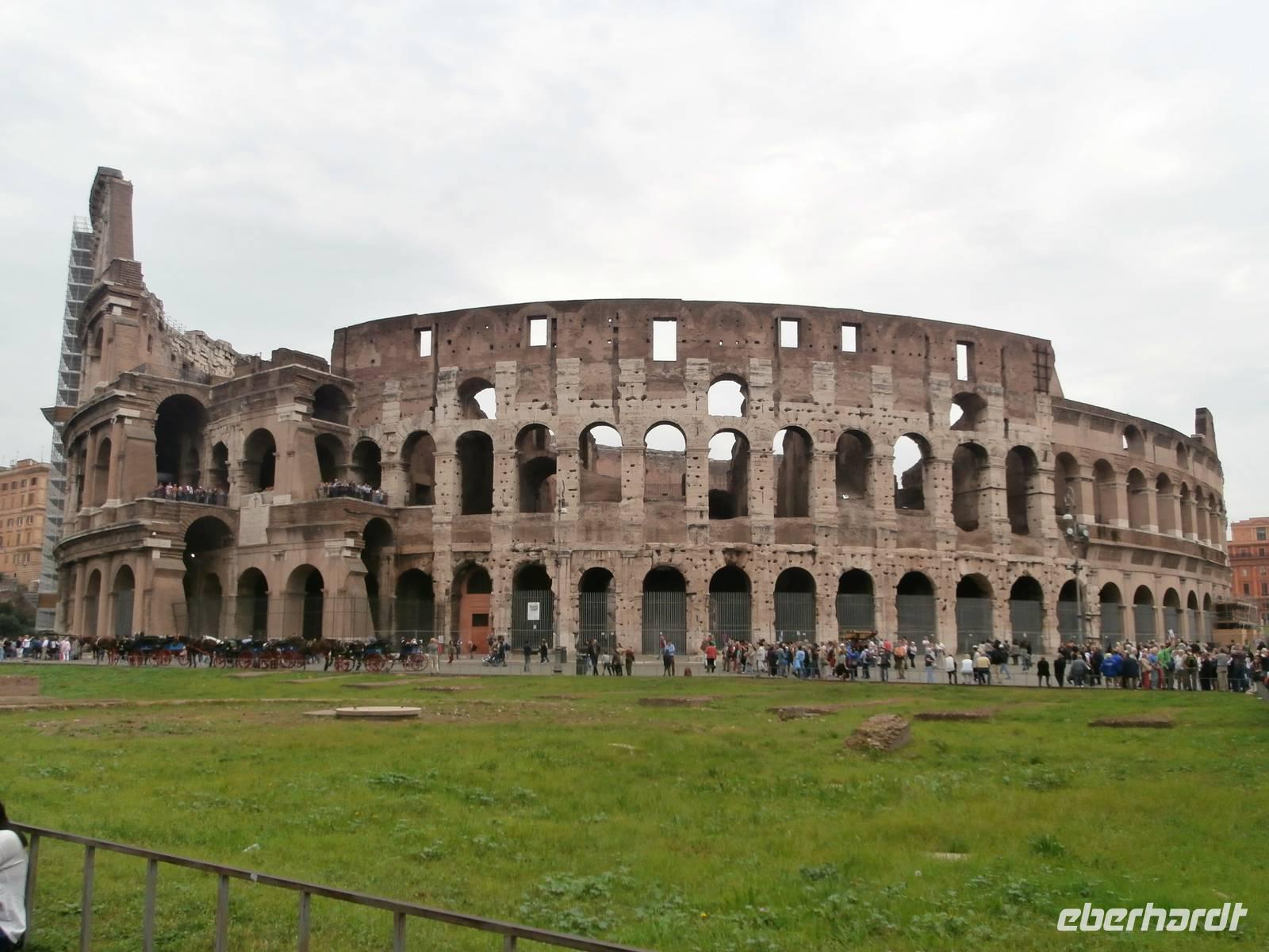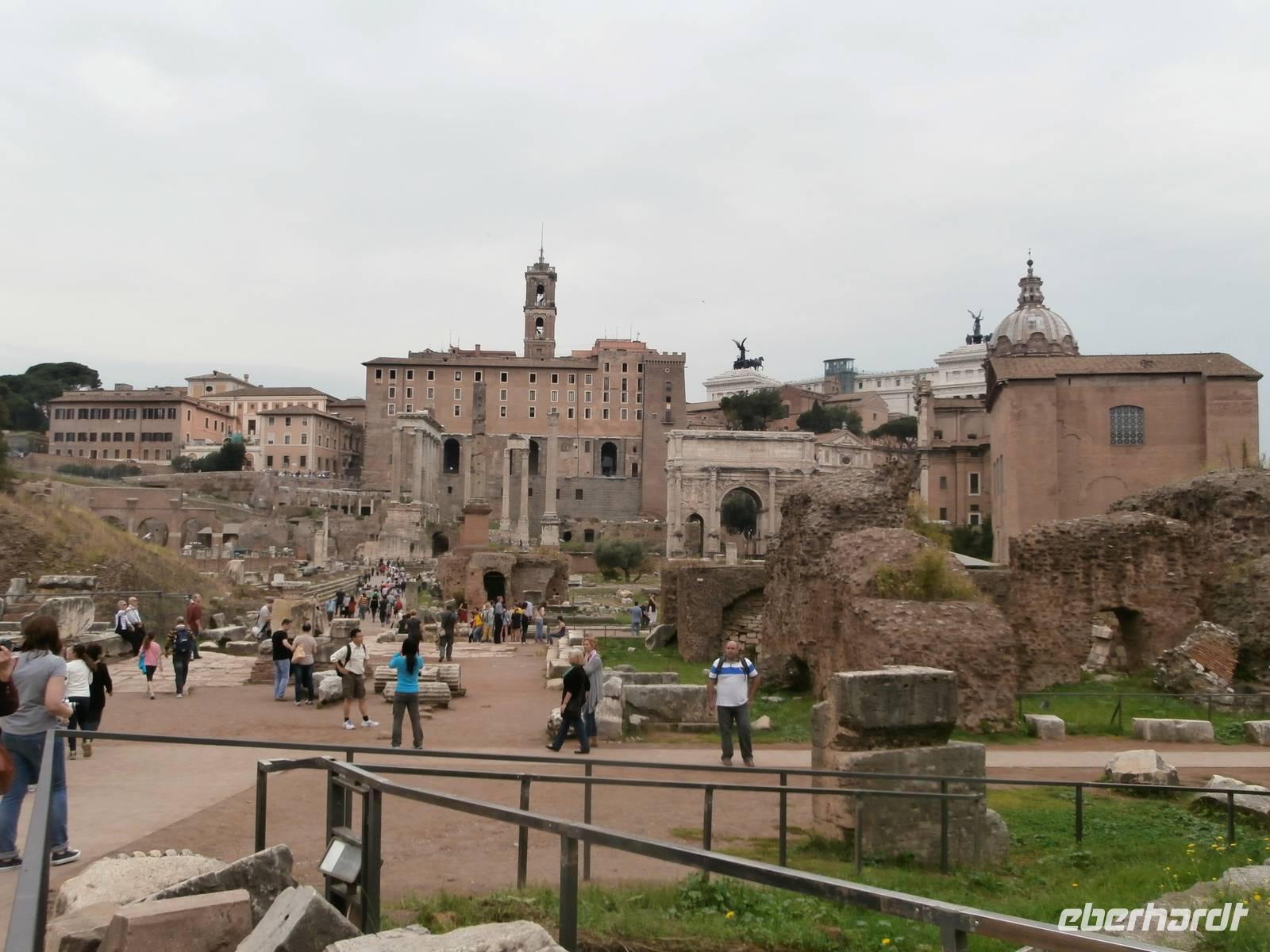 Ausgerüstet mit Audioguides starten wir gemeinsam mit Marilisa, unserer örtlichen Reiseleitung, zur Exkursion mit der Metro bis zum Kolosseum. und hier gehen wir zuerst ins Kolosseum. Wir erfahren viel über die Tierkämpfe und Gladiatoren und sind begeistert vom Erhalt der Anlage im Inneren. Vorbei am Konstantinbogen, der eingerüstet ist, gehen wir hoch zum Palatin Hügel. Hier lauschen wir gespannt den Ausführungen von Marilisa und erfahren auch, dass die Ursprünge Roms als kleine Siedlung sich hier befinden. Mit unserem Rundgang geht's weiter durch das Forum Romanum, welches von vielen Säulen, Bögen und natürlich auch von Tempeln reichlich zum Staunen und Sehen bietet. Den Titus Bogen halten wir fotografisch fest. Weiter geht's hinauf zum Kapitols Hügel und hier wird erst einmal eine Pause eingelegt. Über die breite Treppe, die von Michelangelo geschaffen wurde, gehen wir nicht hinunter zum Piazza Venezia, Marilisa wählt den Weg durch das Nationaldenkmal Emanuele II. Flotten Schrittes geht es zum Trevi Brunnen, da das Eis hier besonders gut schmeckt, gibt es für alle die nächste Pause. Letzter Besichtigungspunkt für heute ist die Spanische Treppe. Vorbei an der Spanischen Botschaft und der Säule der unbefleckten Empfängnis Marias erreichen wir diese bekannte Freitreppe, sie ist heute ein beliebter Treffpunkt und es führen 138 Stufen hinauf zur Kirche Santa Trinita die Monti. Auch der Brunnen auf dem Platz unterhalb der Treppe hat eine Geschichte zu erzählen. Ein angeschwemmtes Boot nach einem Hochwasser des Tibers soll die Inspiration des Künstlers gewesen sein, danach hat er den Bau in dieser Form realisiert. Da hier auch das bekannte Café Greco ist, in dem sich die Deutschen u. a. auch Goethe oder Wagner getroffen haben, empfehlen wir den Besuch unbedingt. Der einsetzende Regen hält sich nicht die ganze Nacht. Nach Einkäufen und Kaffee Pause fahren wir mit der Metro bis zur Station Cipro, die ganz in der Nähe vom Hotel Nova Domus ist, zurück. Der Tag unterwegs im antiken Rom ist schön aber auch anstrengend gewesen.