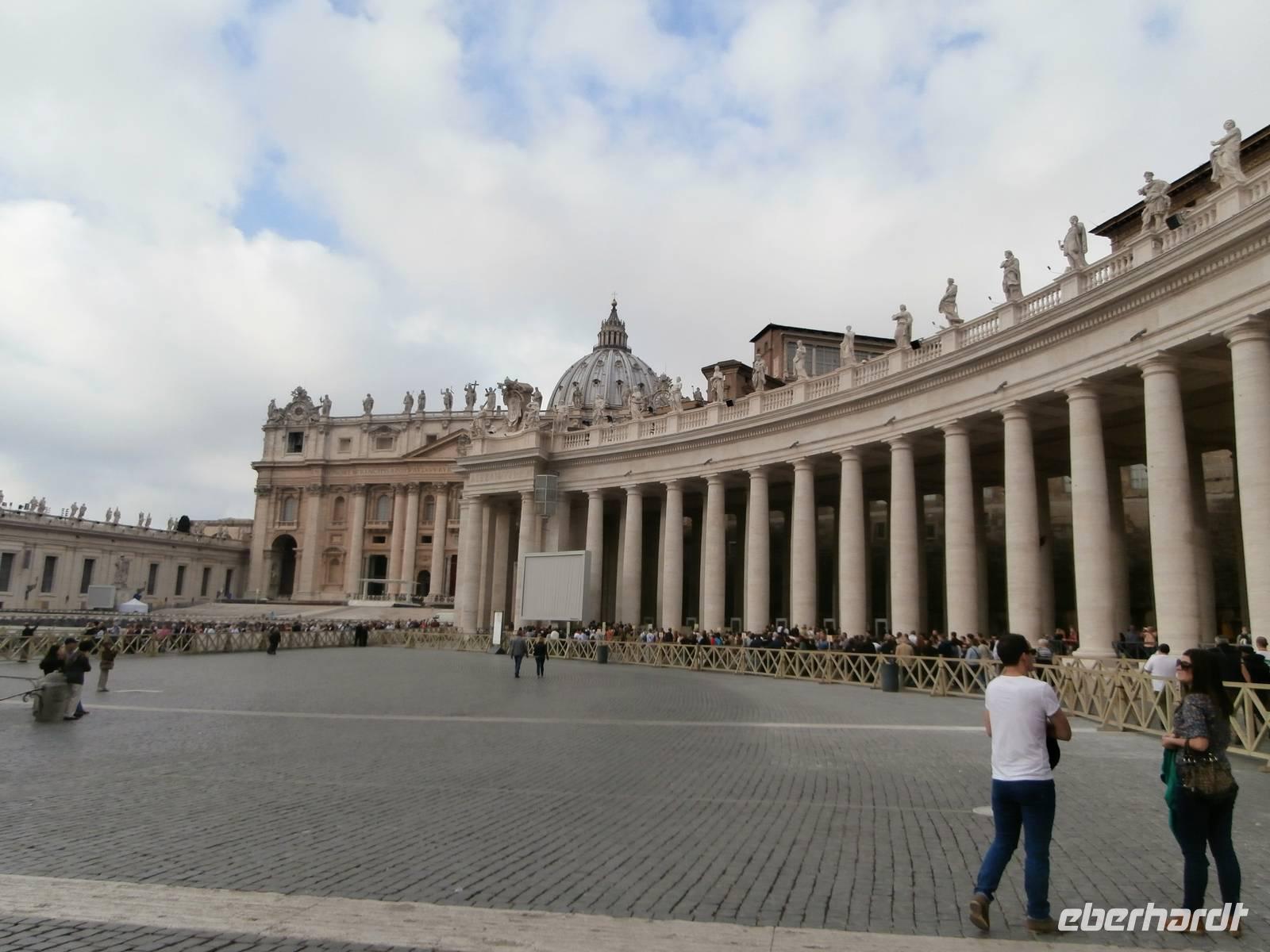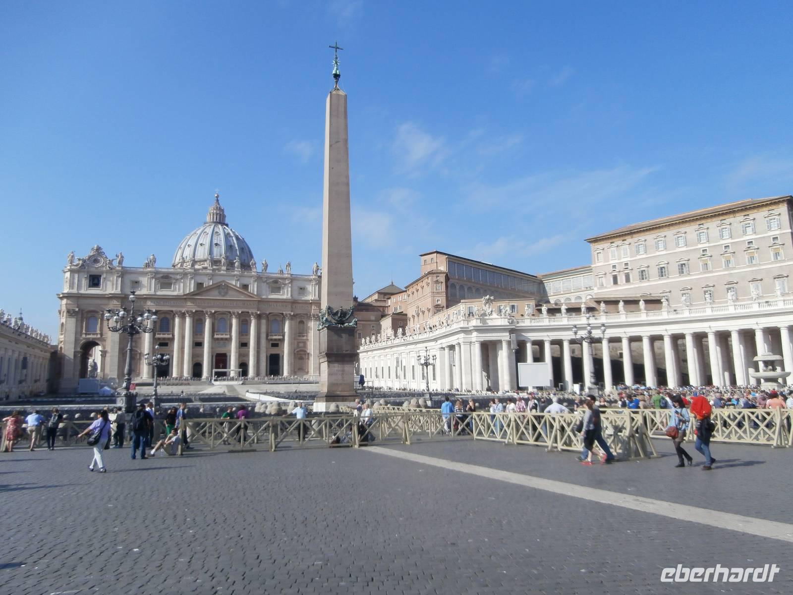 Und wieder starten wir unsere Tour bei schönen, warmen Sommerwetter und heute früh gehen wir zu Fuß bis zum Petersdom. Wir treffen uns mit Marilisa in Nähe des Obelisken, Menschenmassen drängen alle zum Petersdom. Wir reihen uns ein in die Warteschlange, über die Audiguides erfahren wir viel Interessantes zum Leben im Vatikan von Marilisa und schnell verfliegt die Wartezeit. Vorbei an der Schweizer Garde gehen wir hinauf, um noch vorm Betreten des Heiligtums einen Blick über den Petersplatz bis hin zum Tiber zu erhaschen. Und nun geht es hinein in den Petersdom und was uns Marilisa vermittelt, dass ergreift die Seele, das Herz und jeder von uns folgt mit Aufmerksamkeit ihren Ausführungen. Das Innere des Doms ist gewaltig: 50 Altäre, 450 Statuen und 500 Säulen, ja und fast 60.000 Menschen finden Platz in ihm. Im Anschluss besteigen einige Gäste die Kuppel, von da oben bekommt man einen genialen Überblick über die Gesamtanlage des Petersplatzes, der übrigens hat den Grundriss eines auf den Kopf gestellten Schlüssellochs und wurde von Bernini entworfen.