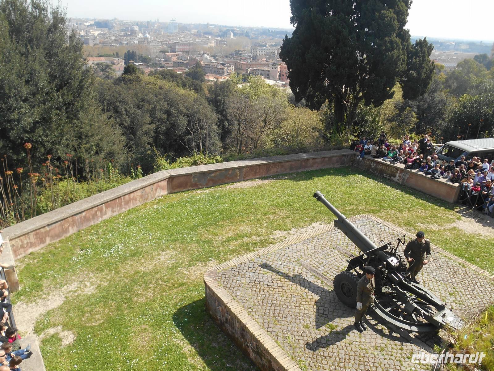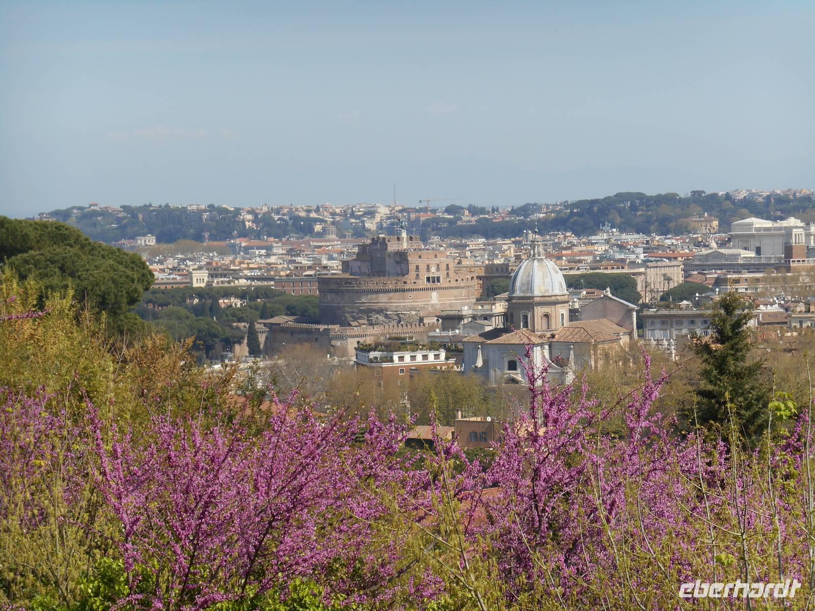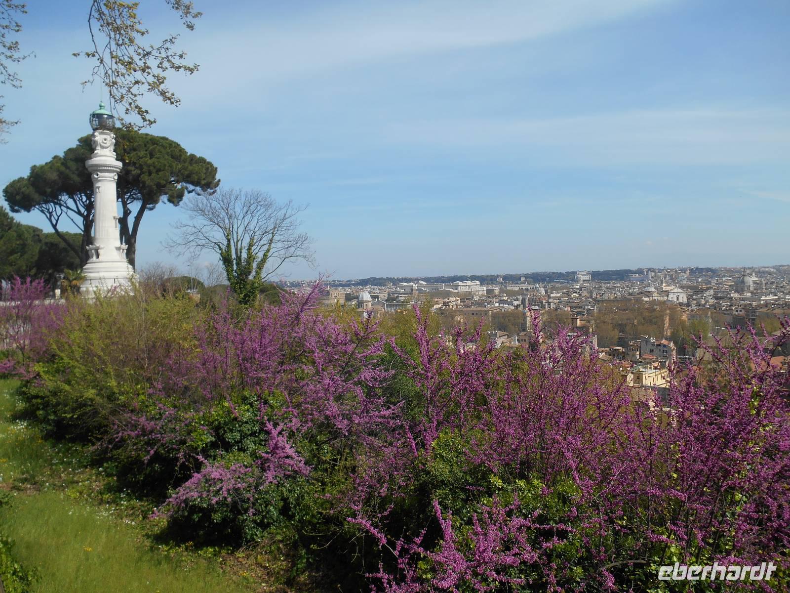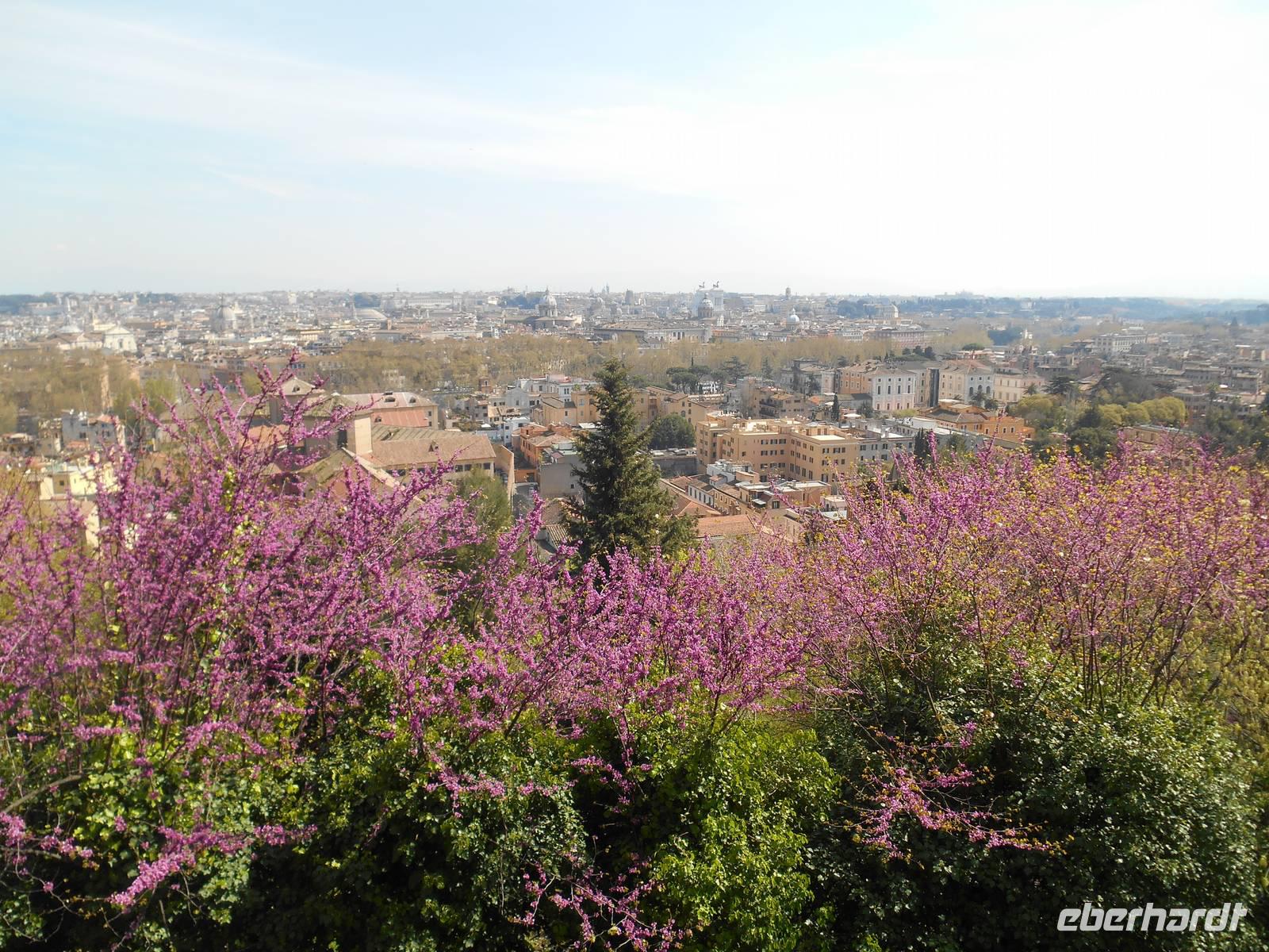 Unser Flugzeug in Richtung Heimat startete glücklicherweise erst am frühen Abend und somit hatten wir noch ein paar Stunden Zeit, um uns auf die ein oder andere individuelle Entdeckungstour in Rom zu begeben. Ich spazierte mit einem Teil unserer Gruppe in Richtung Gianicolo-Hügel, der Piazza Garibaldi war unser Ziel - von hier aus bot sich uns ein herrlicher Blick auf die Dächer Roms und so konnten wir zum Abschluss unserer Reise nochmals ein Bild auf diese faszinierende Stadt werfen! Das Wetter war toll und wir genossen hier oben ebenso die angenehme Ruhe abseits der großen Touristenströme. Des Weiteren erlebten wir hier den Frühling besonders intensiv - sattes Grün und vor allem wunderbar rosa blühende Judasbäume begegneten uns. Pünktlich um 12 Uhr wurde dann, wie übrigens jeden Tag, vom Gianicolo aus eine alte Kanone abgeschossen. An Tagen, an denen der Verkehrslärm nicht besonders stark ist, vor allem im Sommer, kann man den Schuss sogar am Esquilin gut hören.