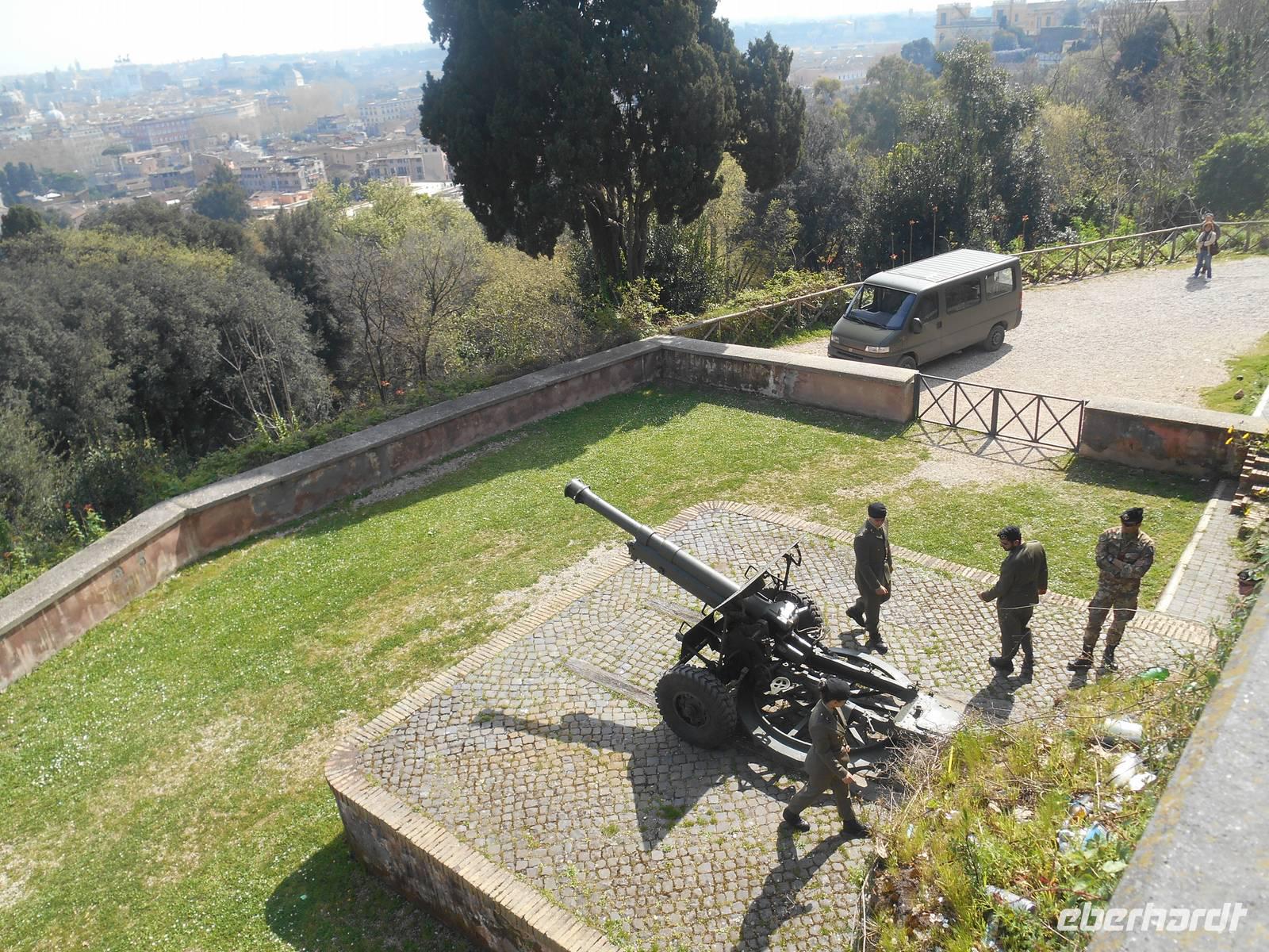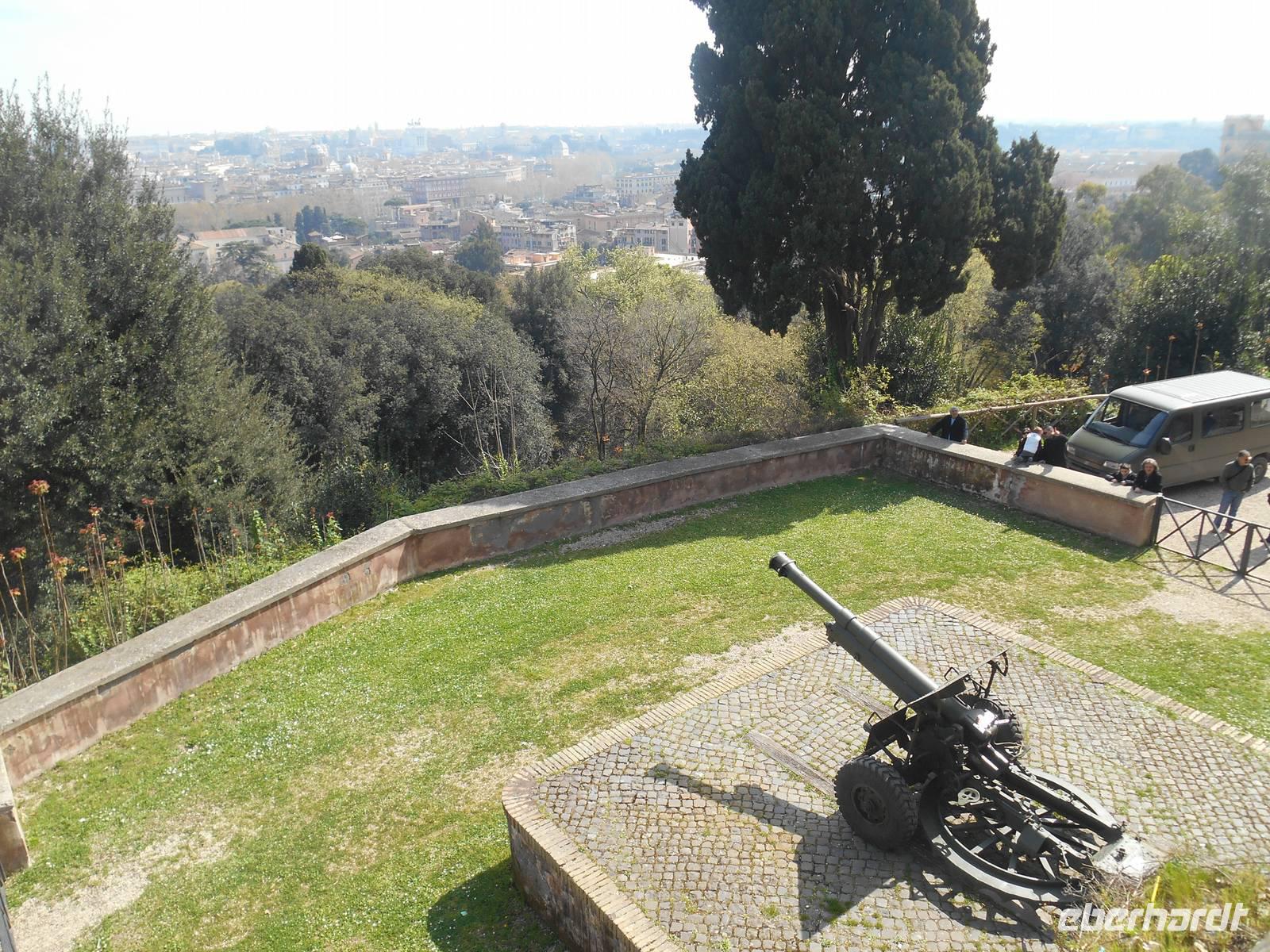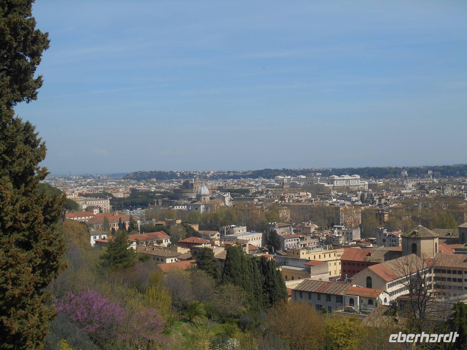 Unser Flugzeug in Richtung Heimat startete glücklicherweise erst am frühen Abend und somit hatten wir noch ein paar Stunden Zeit, um uns auf die ein oder andere individuelle Entdeckungstour in Rom zu begeben. Ich spazierte mit einem Teil unserer Gruppe in Richtung Gianicolo-Hügel, der Piazza Garibaldi war unser Ziel - von hier aus bot sich uns ein herrlicher Blick auf die Dächer Roms und so konnten wir zum Abschluss unserer Reise nochmals ein Bild auf diese faszinierende Stadt werfen! Das Wetter war toll und wir genossen hier oben ebenso die angenehme Ruhe abseits der großen Touristenströme. Des Weiteren erlebten wir hier den Frühling besonders intensiv - sattes Grün und vor allem wunderbar rosa blühende Judasbäume begegneten uns. Pünktlich um 12 Uhr wurde dann, wie übrigens jeden Tag, vom Gianicolo aus eine alte Kanone abgeschossen. An Tagen, an denen der Verkehrslärm nicht besonders stark ist, vor allem im Sommer, kann man den Schuss sogar am Esquilin gut hören.
