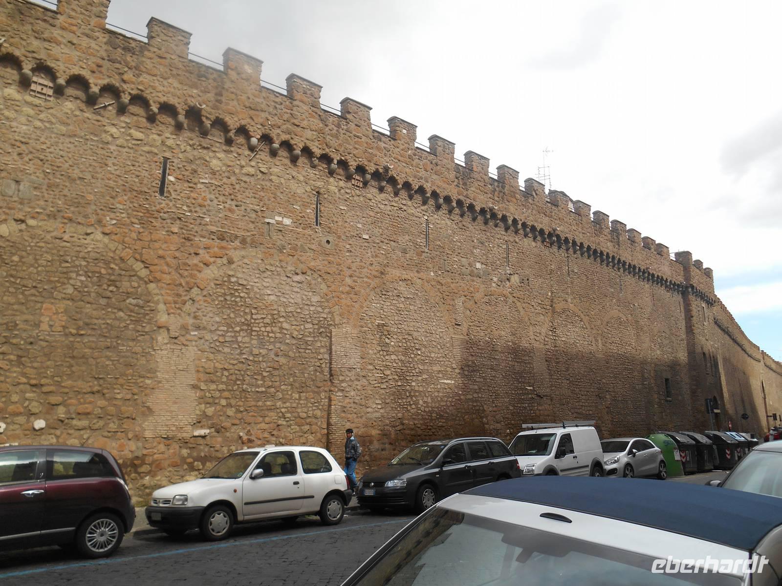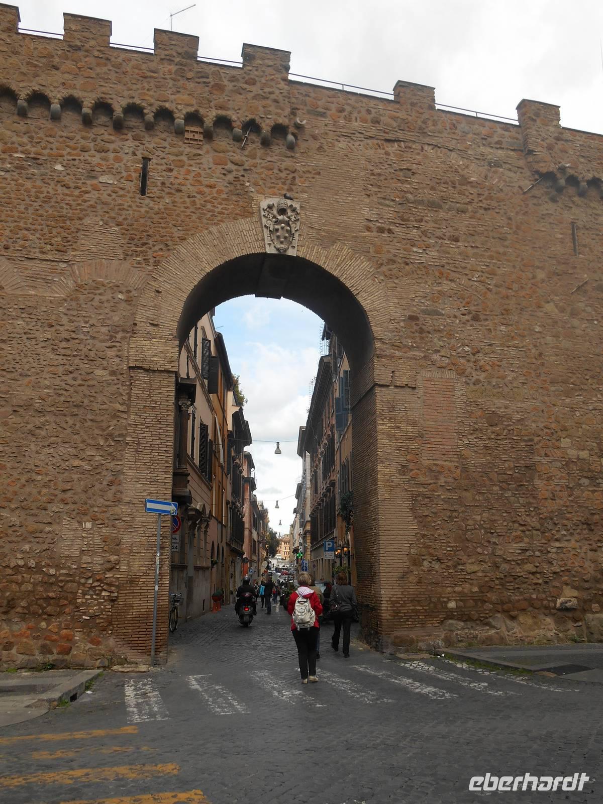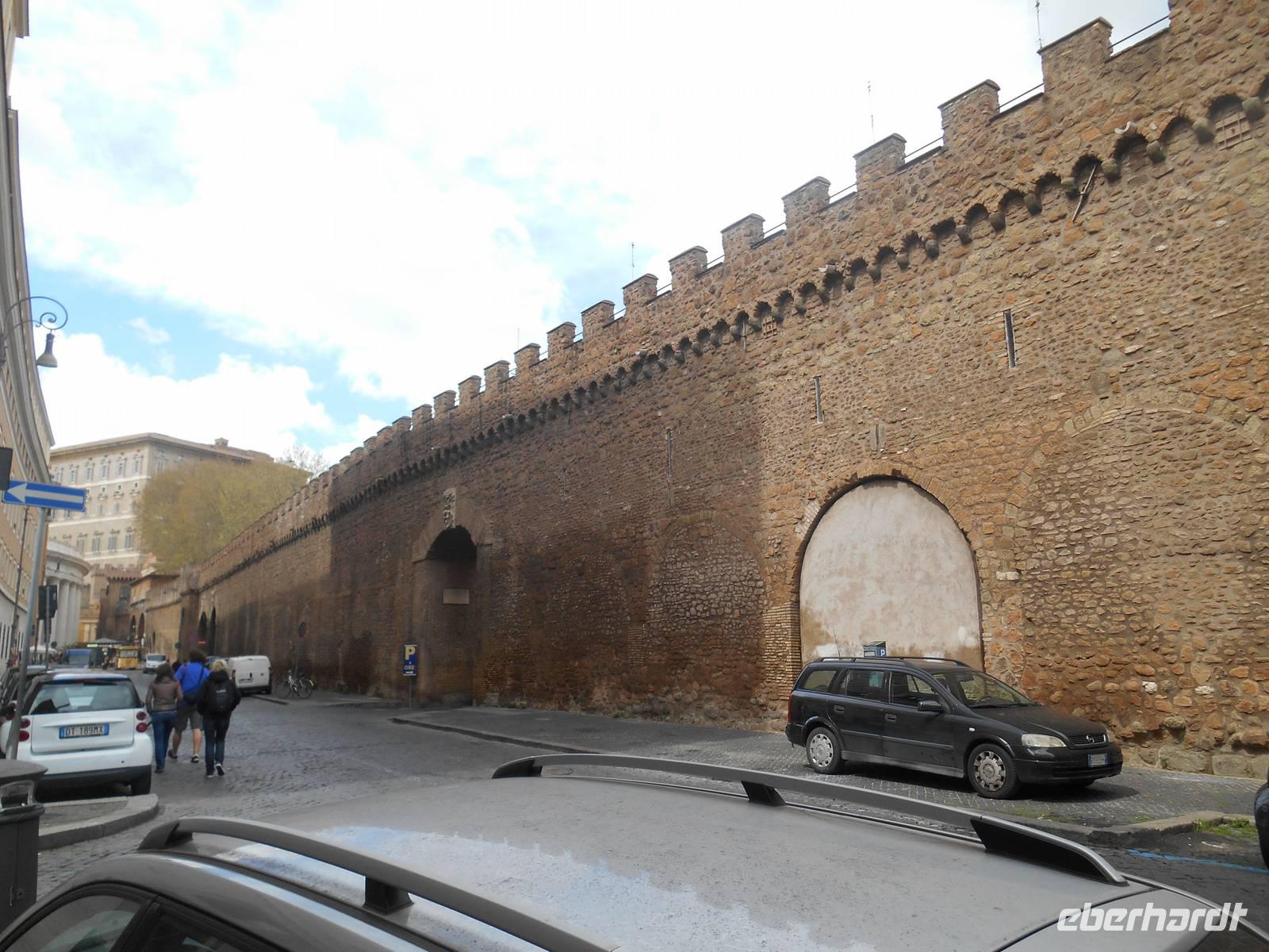 Im Anschluss an die hervorragende Führung in der Peterskirche durch unsere Stadtführerin Agnieszka flanierten wir unterhalb des Passetto di Borgo in Richtung Engelsburg. Passetto bedeutet so viel wie "Kleiner Gang". Er bezeichnet die Stadtmauer, die vom Vatikan zur Engelsburg führt. Er wurde im Mittelalter angelegt und diente als gedeckter Fluchtweg auf der zinnen-bewehrten Mauer. Gleichzeitig konnte vom Passetto aus der Stadtteil Borgo kontrolliert werden, sowohl optisch als auch durch das Abfeuern von Geschossen auf die darunter liegenden Häuser und Straßen. Zweimal war der Passetto ein wichtiger Fluchtweg für die Päpste: 1494 floh der Borgia-Papst Alexander VI. in das uneinnehmbare Hadrians-Mausoleum, als Truppen König Karls VIII. von Frankreich in Rom einfielen und 1527 gelang über den Passetto Papst Clemens VII. die Flucht vor den marodierenden Söldnertruppen Kaiser Karls V. Kurze Zeit später erreichten wir die Engelsburg, ursprünglich ein Grab-Bau für Kaiser Hadrian (117-138 n. Chr.). Den heutigen Namen erhielt das ehemalige Hadrianeum, als im Jahre 590 Papst Gregor der Große eine göttliche Vision hatte: ein Engel erschien ihm über dem Mausoleum und kündigte das Ende der damals herrschenden Pest an, indem er sein Schwert in die Scheide steckte - heute so dargestellt in der bronzenen Engelsstatue aus dem Jahre 1753 auf der Spitze des Kastells.