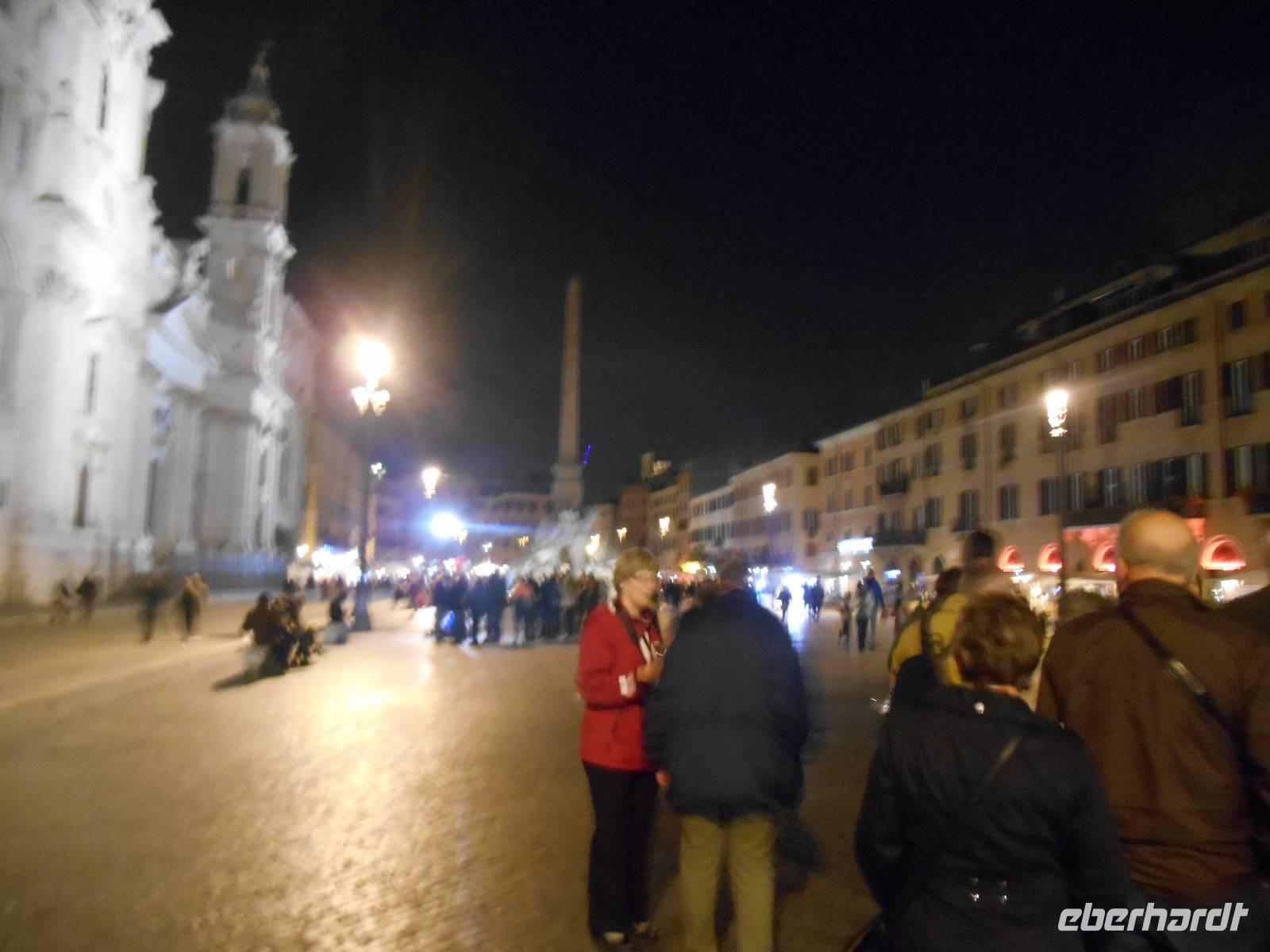 Am Abend trafen wir uns alle wieder und fuhren gemeinsam mit dem Linienbus in das römischste aller römischen Stadtviertel - nach Trastevere. Dieses romantische Viertel liegt am Südufer des Tibers (Tevere) und bedeutet so viel wie "jenseits des Tibers". Hier nahmen wir heute gemeinsam unser letztes Abendessen im Restaurant "Vizi Capitali" ein - einfach lecker! Wir genossen den Abend im Lokal und bemerkten kaum, wie schnell doch die Zeit verging... Wir hatten heute nämlich noch einiges vor - einen Spaziergang durch das romantisch beleuchtete Rom! Agnieszka holte uns im Restaurant ab und zeigte uns zu Beginn dieses abendlichen Ausfluges die Kirche "Santa Maria in Trastevere", eine der ältesten Kirchen Roms und die erste der über 80 Marienkirchen in Rom, die der Madonna geweiht wurde. Durch die Gassen von Trastevere führte uns unser Rundgang weiter über eine der Tiber-Brücken, die Ponte Sisto, in Richtung Campo dei Fiori - überall herrschte noch ein reges Treiben. Weiter ging es über die Piazza Navona zur Engelsbrücke und schließlich endete die abendliche Führung an der Engelsburg - hier mussten wir uns dann auch leider endgültig von unserer sympathischen und absolut kompetenten Stadtführerin Agnieszka verabschieden! Das abendliche Rom war die Krönung - einfach einzigartig, viele Gebäude der Stadt herrlich beleuchtet und ein gelungener Abschluss dieser Städtereise. Kurz vor Mitternacht kamen wir schließlich im Hotel an und ein wiederum langer Tag mit vielen schönen Eindrücken neigte sich dem Ende entgegen.