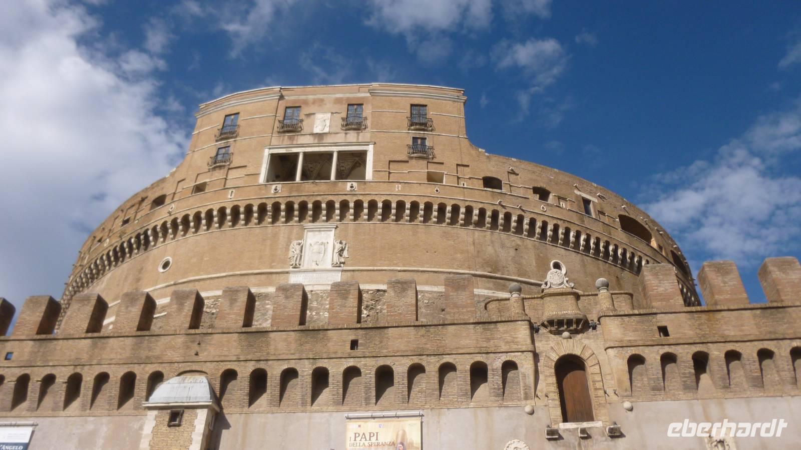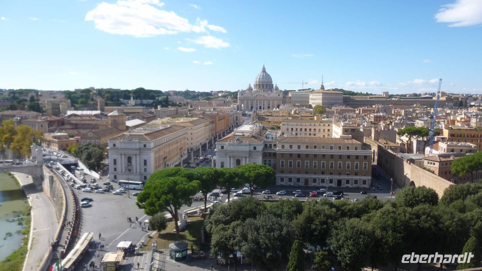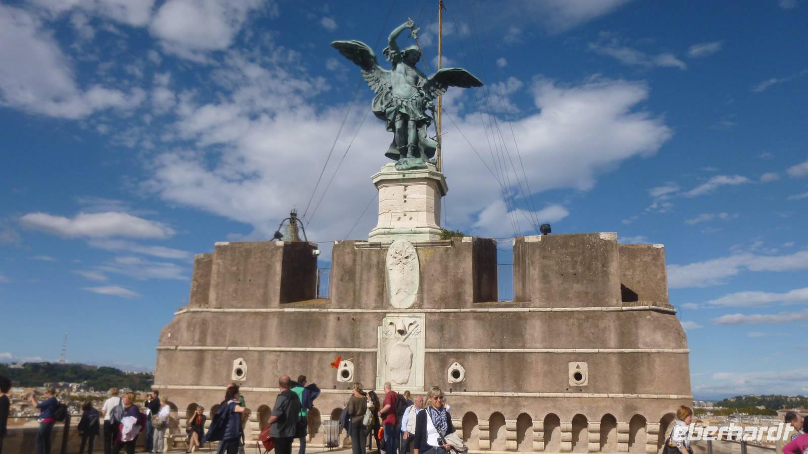 Über den Petersplatz liefen wir zur Via della Conciliazione und ruhten uns bei einer Mittagspause etwas aus. Weiter ging es entlang der Mauer, welche den Päpsten als Fluchtweg diente, zur Engelsburg. Einige original erhaltene, möblierte Räume bieten einen Einblick auf das damalige Leben in diesen Gemäuern. Von der Dachterrasse aus hatten wir einen fantastischen Ausblick auf die ganze Stadt, vom Vatikan bis hin zur Schreibmaschine. Über die Engelsbrücke liefen wir weiter bis zum Piazza Navona mit seinen drei Brunnen. Der Vierströmebrunnen zeigte die vier Flüsse Nil, Donau, Ganges und Rio de la Plata, wobei der Kopf Nil interessanterweise aufgrund seiner unbekannten Quelle verhüllt ist.