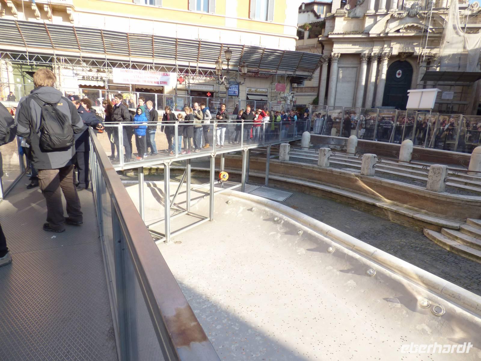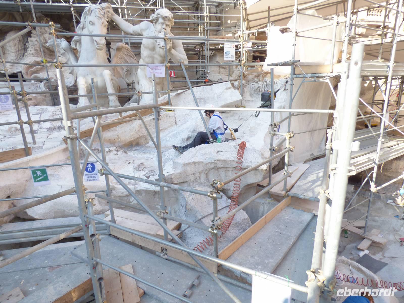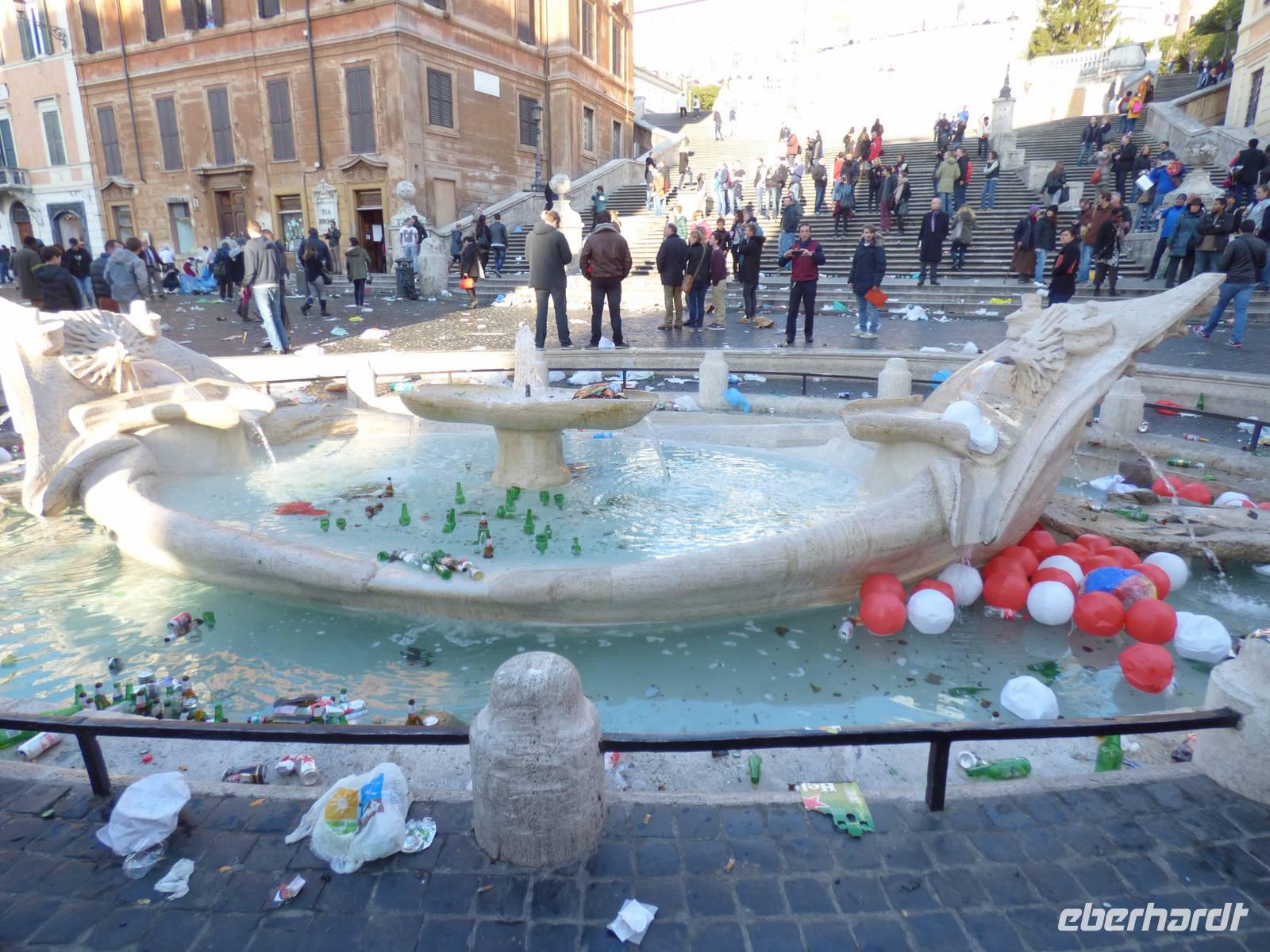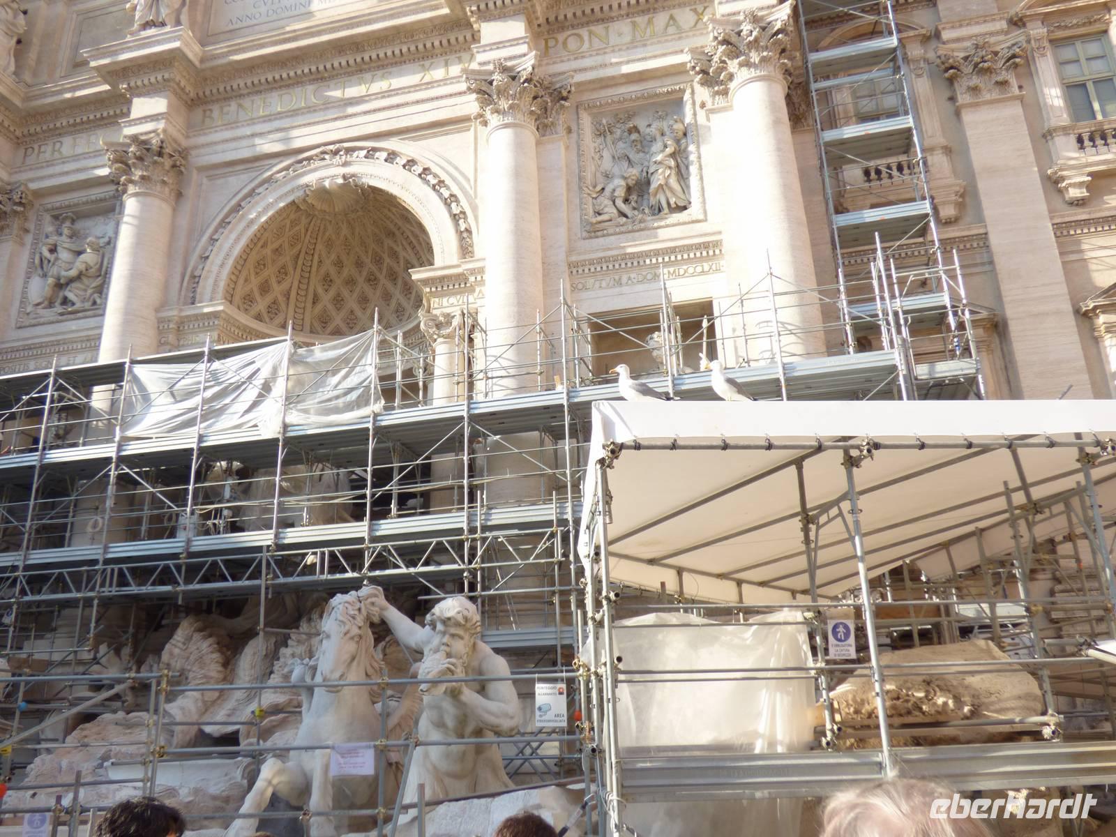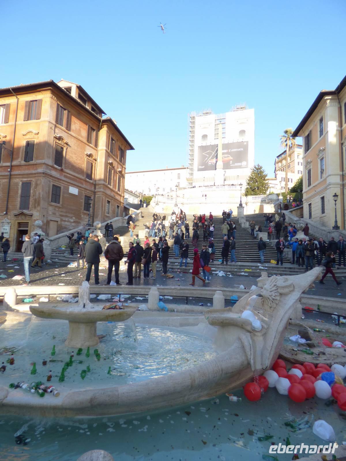 Doch auch hier war unser heutiger Tag noch nicht vorbei, denn wir gingen noch zum Trevi-Brunnen, der zumindest zur Hälfte zu begutachten ging, da er zu Restaurationszwecken teilweise noch abgedeckt war. Aber hey! So nah wie wir werden nicht mehr viele Gäste an die Kunstwerke herankommen! Einige kühlten sich noch mit einem Eis, bevor wir nun zum letzten Punkt des heutigen Tages übergingen. Leider wurde die Vorfreude auf die Spanische Treppe sehr getrübt, da durch ein anstehendes Fußballspiel sowohl der Brunnen als auch der Platz an der Treppe sehr in Mitleidenschaft gezogen wurden und hier heute eine Menge Action zu verzeichnen war.