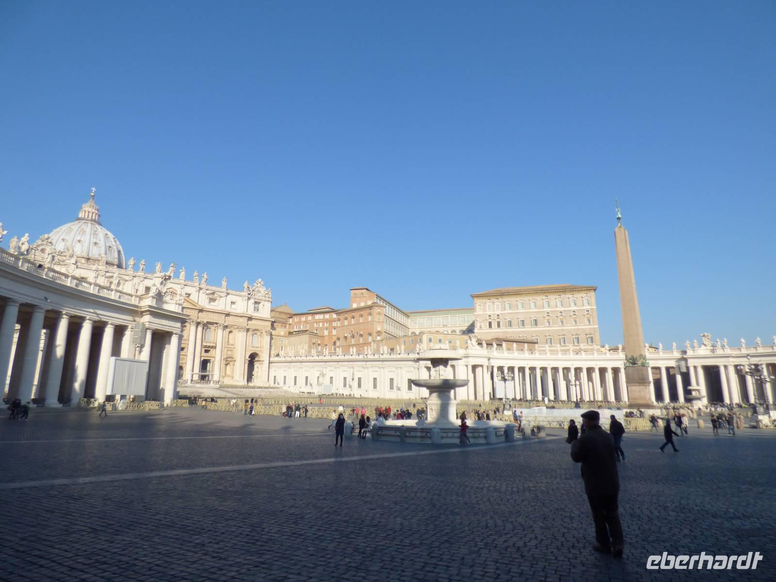 Am heutigen Morgen ging unsere Reise in die Stadt bzw. ins „Ausland" ein wenig später los als am Vortag. Wir fuhren ohne konkrete Buszeiten aber mit einer Route im Kopf gen Vatikan. Die Route hatte leider der Busfahrer der Buslinie offenbar nicht so vor Augen, sodass wir anhand der Reaktionen der mitfahrenden Gäste erkannten, dass der Bus bei den vielen Einbahnstraßen der Stadt in eine falsche Richtung abbog. Da aber auch Agnieszka ein Buserlebnis der anderen Art hatte, trafen wir uns mit einer kleinen Verspätung auf dem Petersplatz und umrundeten diesen im Schatten des weitläufigen Gebäudes. Nach einer ausgiebigen Sicherheitskontrolle, wo man sich ein bisschen wie bei der Ausreise am Flughafen fühlte, konnten wir nach einem kleinen „Happy Stop" in den überdimensionalen Dom des kleinen Landes eintreten und auch die Größten von uns kamen sich plötzlich ganz klein vor.
