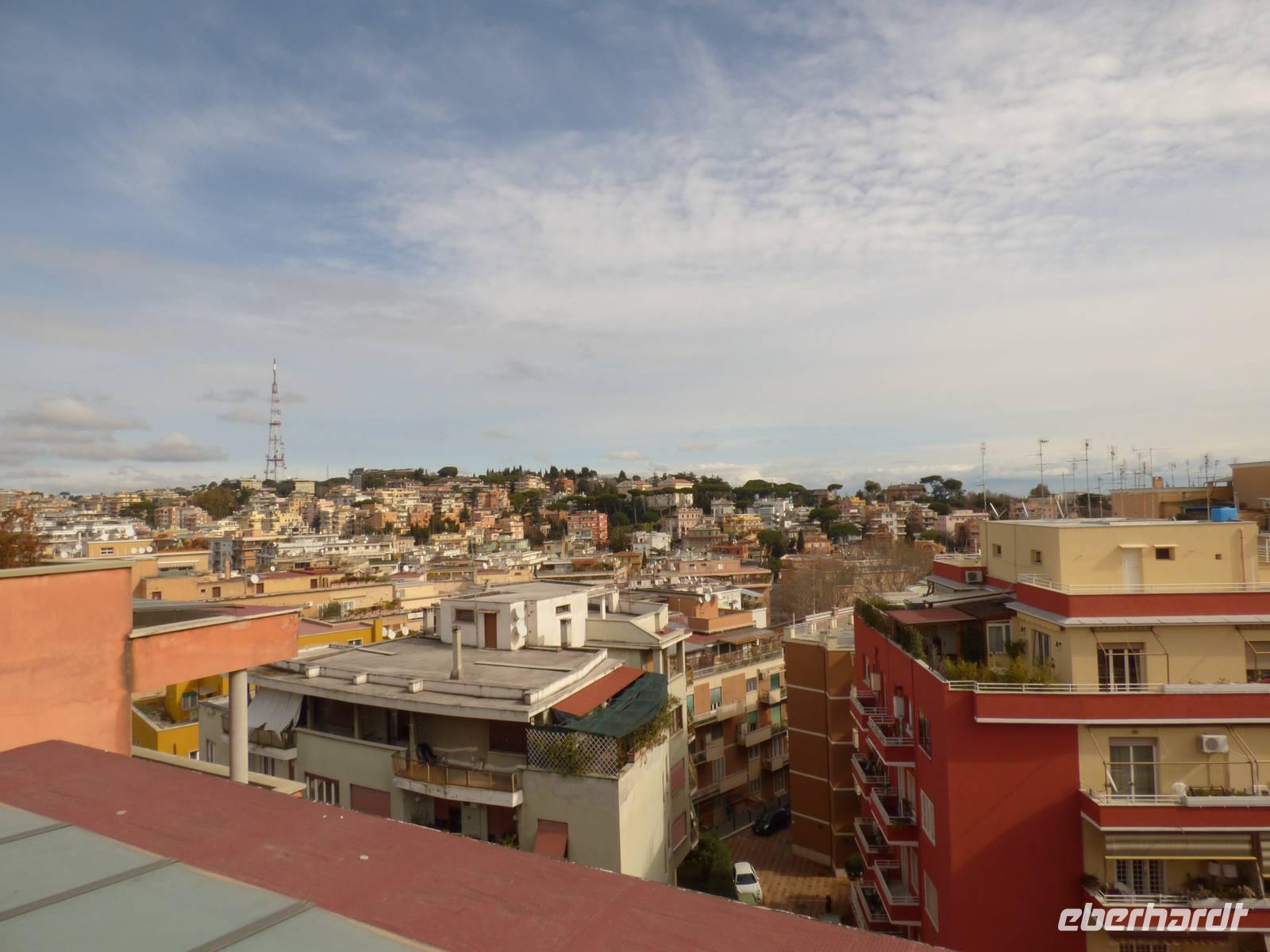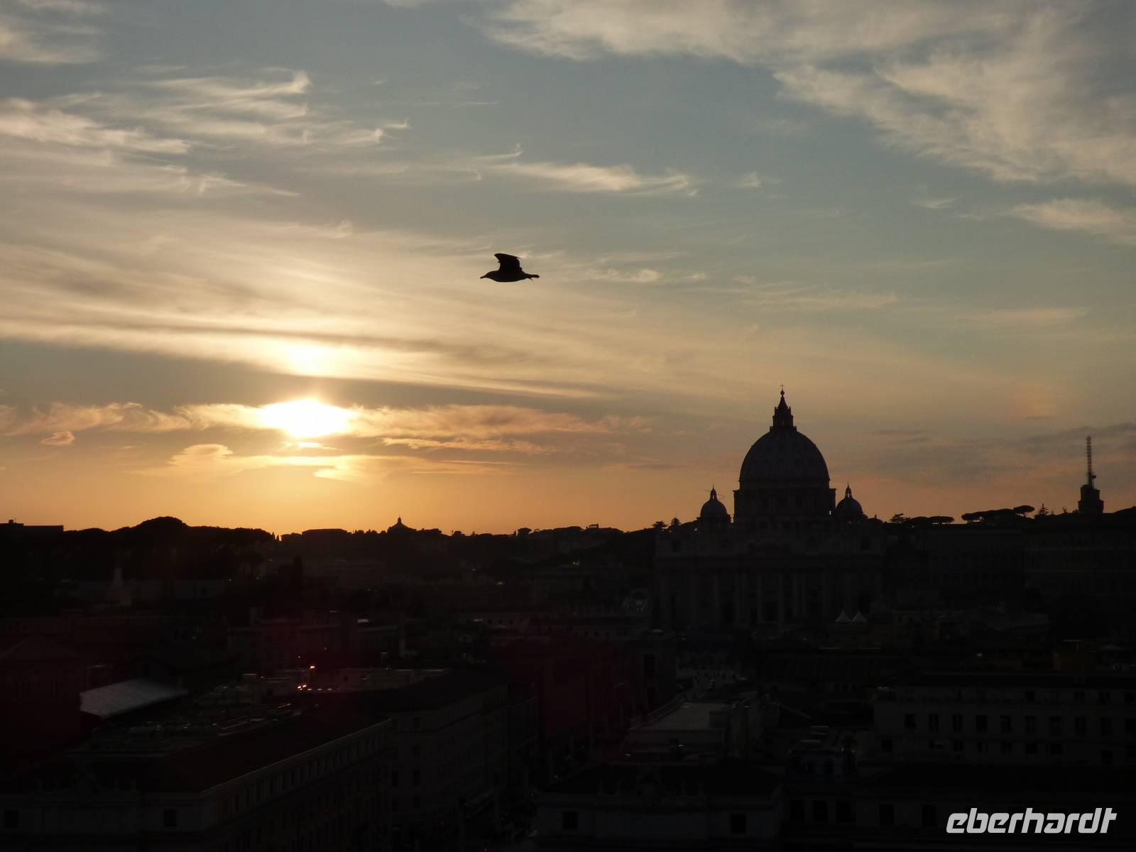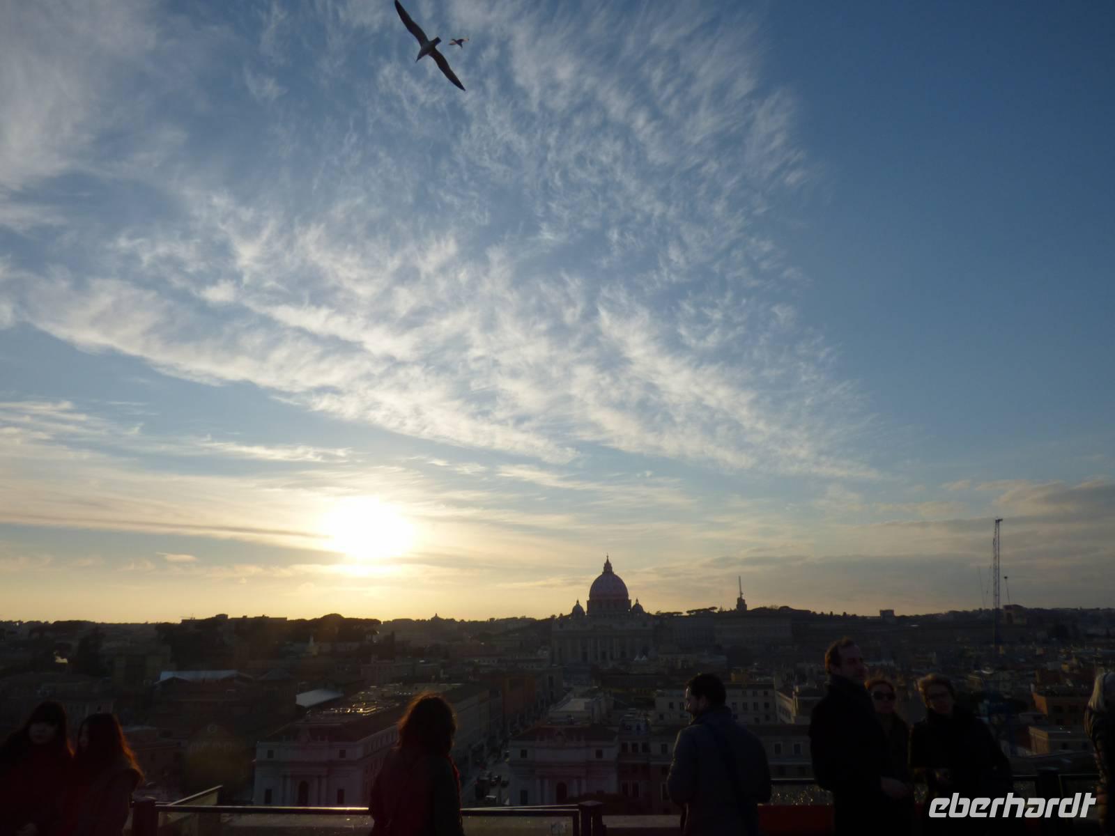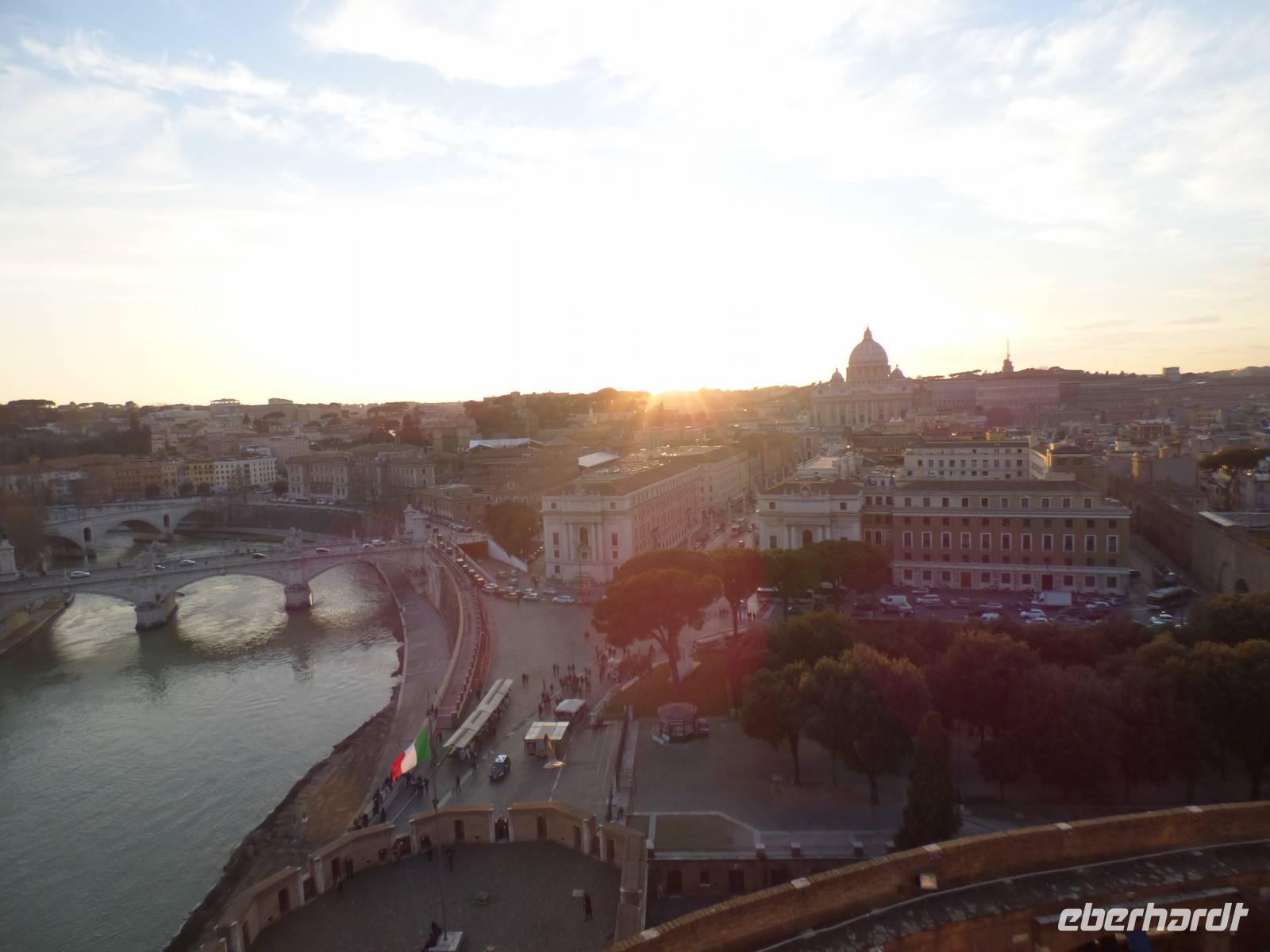 Oben angekommen wurden wir mit einem grandiosen Ausblick über die Dächer Roms belohnt und die Schönheit der Stadt wurde durch die untergehende Sonne noch eindrucksvoller.
