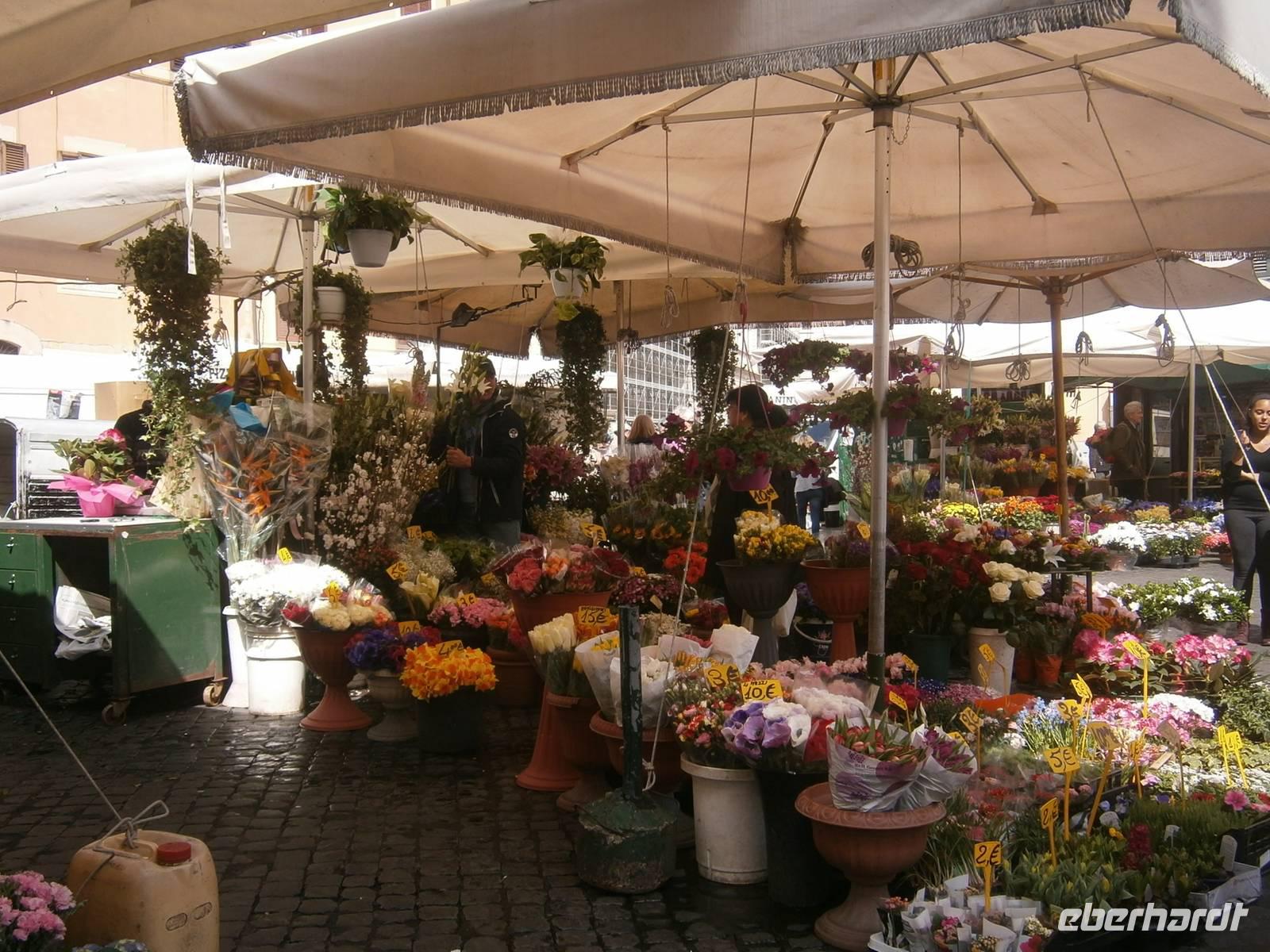 Eine kurze Pause nutzen unsere Gäste um „gesegnete" Postkarten nach Hause zu schicken. Anschließend spazieren wir durch den Borgo, über den Tiber, durch kleine Gassen zum Campo dei Fiori. Ein malerischer Platz - am Morgen ist hier Markt und am Abend Treffpunkt für die Jugend. Hier verbringen wir unsere Mittagspause.