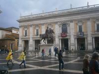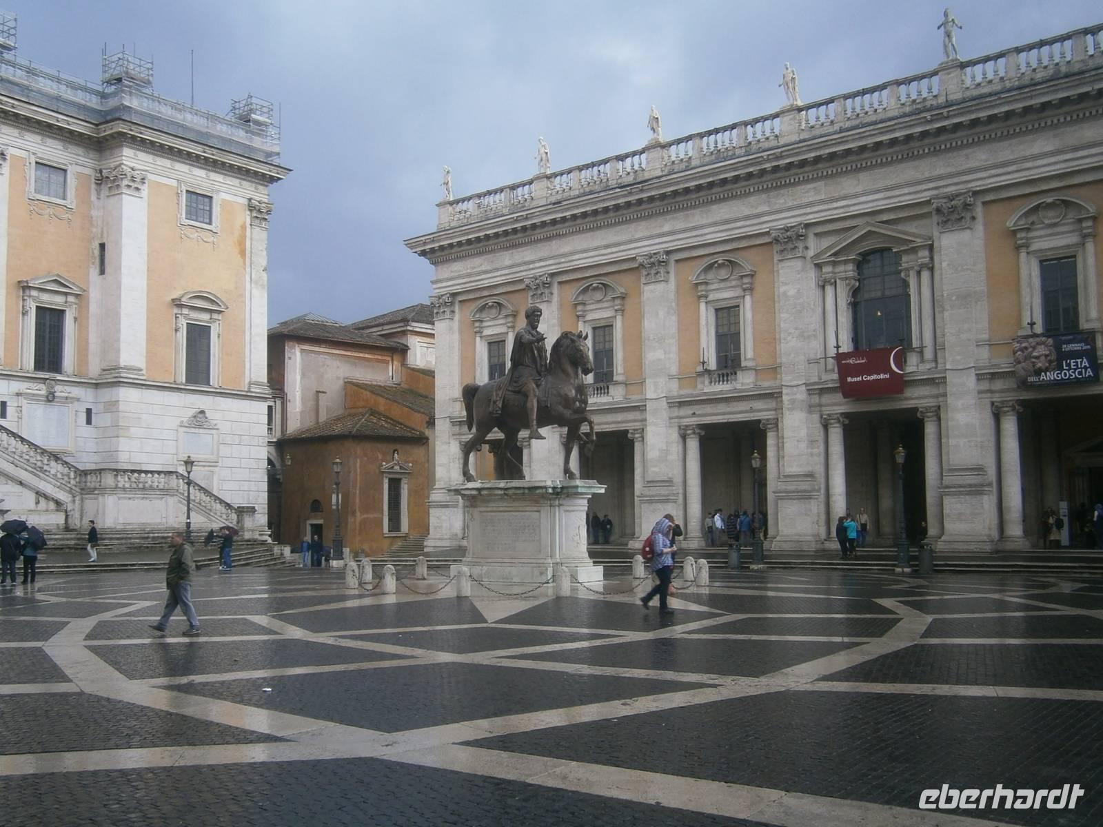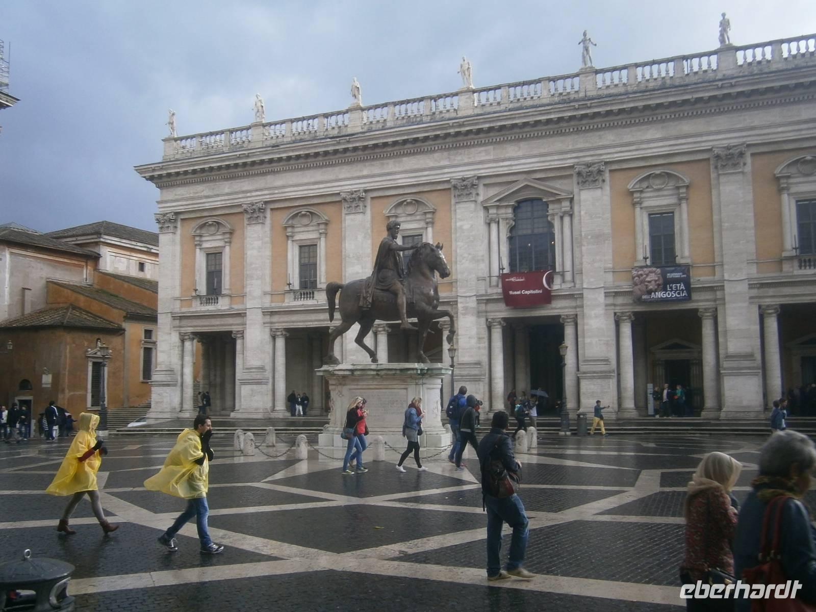 Bei dem Spaziergang durch das Areal stehen wir vor dem Arco di Tito, sind in der Maxentiusbasilika, sehen das Casa delle Vestali. Während wir weiter über die Via Sacra laufen fängt es an zu regnen. Wir schauen noch schnell hinüber zur Curie und zum Triumphbogen von Settimo Severion bevor wir das Forum verlassen. Es geht hinauf zum kleinsten unter den sieben Hügeln auf denen Rom einst erbaut wurde. Der Capitolinushügel, wird flankiert von den Capitolinischen Museen und dem Senatorenpalast (heute Amtssitz des Bürgermeisters. In der Mitte der Piazza del Campidoglio steht die Kopie des Reiterstandbildes von Kaiser Marc Aurel. Der Platz, geschaffen nach Plänen von Michelangelo, ist einer der schönsten und war Grundlage zur Gestaltung der italienischen 50 Cent Münze. Gemeinsam spazieren wir wieder hinunter bis zur Via de Fiori Imperiali. Von hier aus hat man einen guten Blick auf die Marmorsäule von Kaiser Trajan und gleich daneben befinden sich die Trajansmärkte. Das Einkaufszentrum der Antike.