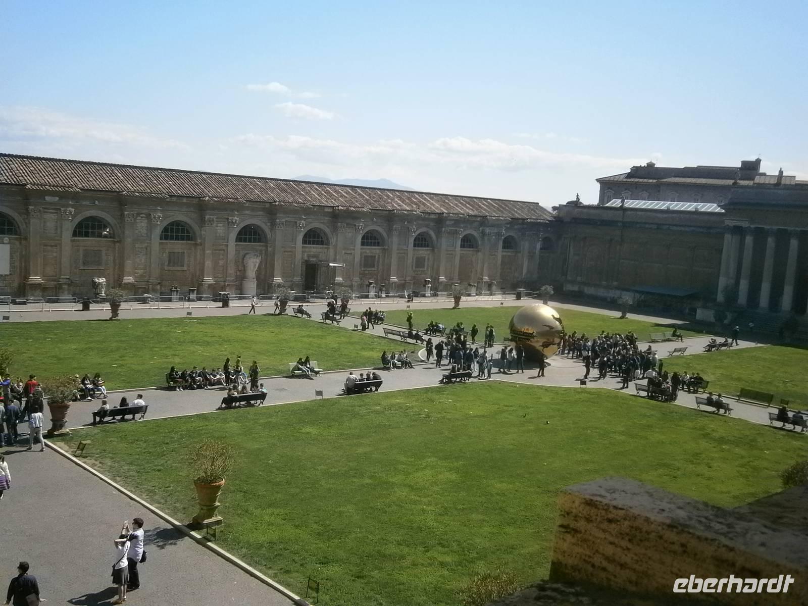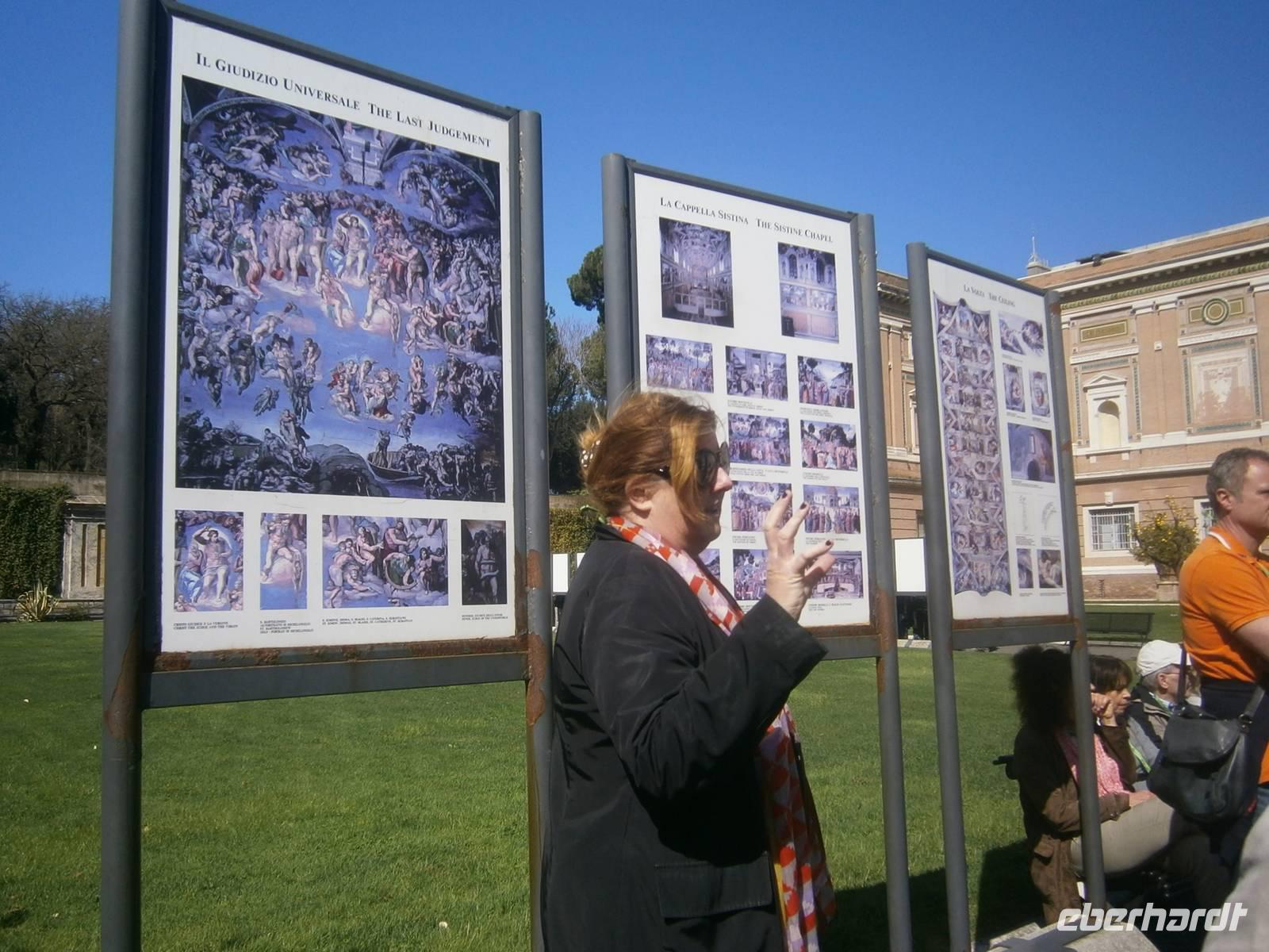 Ein großer Teil unserer Reisegäste hat den Besuch der Vatikanischen Museen mitgebucht. An diesem Tag sehen wir, wie gut es ist, als Reisegruppe schon eine Vorreservierung zu haben. Am Eingang zu den Museen begrüßen wir unsere Gästeführerin Susanne. Die Vatikanischen Museen sind die größten Museen der Welt und beherbergen Kunstwerke in 1400 Räumen, mit 50 000 Objekten. Um alle Kunstwerke sehen zu können müssten wir eine Wegstrecke von ca. 7 Kilometern zurücklegen. Wieder sind wir den anderen wartenden Gästen im Vorteil. Mit den Reservierungen in der Hand schlängeln wir uns vorbei und gelangen so recht zügig in den Eingangsbereich der Museen. Hier bekommen wir erstmal die gesegneten Audiogeräte und spazieren in einen der zahlreichen Innenhöfe. Hier stehen Schautafeln und so kann uns Susanne schon mal einen Einblick geben, was uns dann am Ende der Führung in der Sixtinischen Kapelle erwartet. Der Weg dorthin führt uns durch das Museum. Als erstes schauen wir in Padiglione delle Carrozze, hier stehen die päpstlichen Fahrzeuge der letzten Jahrhunderte. Über den Cortile delle Pigna - hier dreht sich die Kugel in der Kugel, über den Cortile Ottogano - hier steht die Statue des Apollo und die Laakoongruppe führt uns unser Weg weiter durch den Sala delle Muse, in den Sala Rotonda durch die Galleria dei Candelabri in die Galleria delle Carte Geografiche. Die Galerie ist 175 m lang und enthält 40 riesige Landkarten. Diese wurden zwischen 1580 und 1583 von Papst Gregor XIII in Auftrag gegeben und zeigen die gemalten Landkarten Italiens und seiner Provinzen.