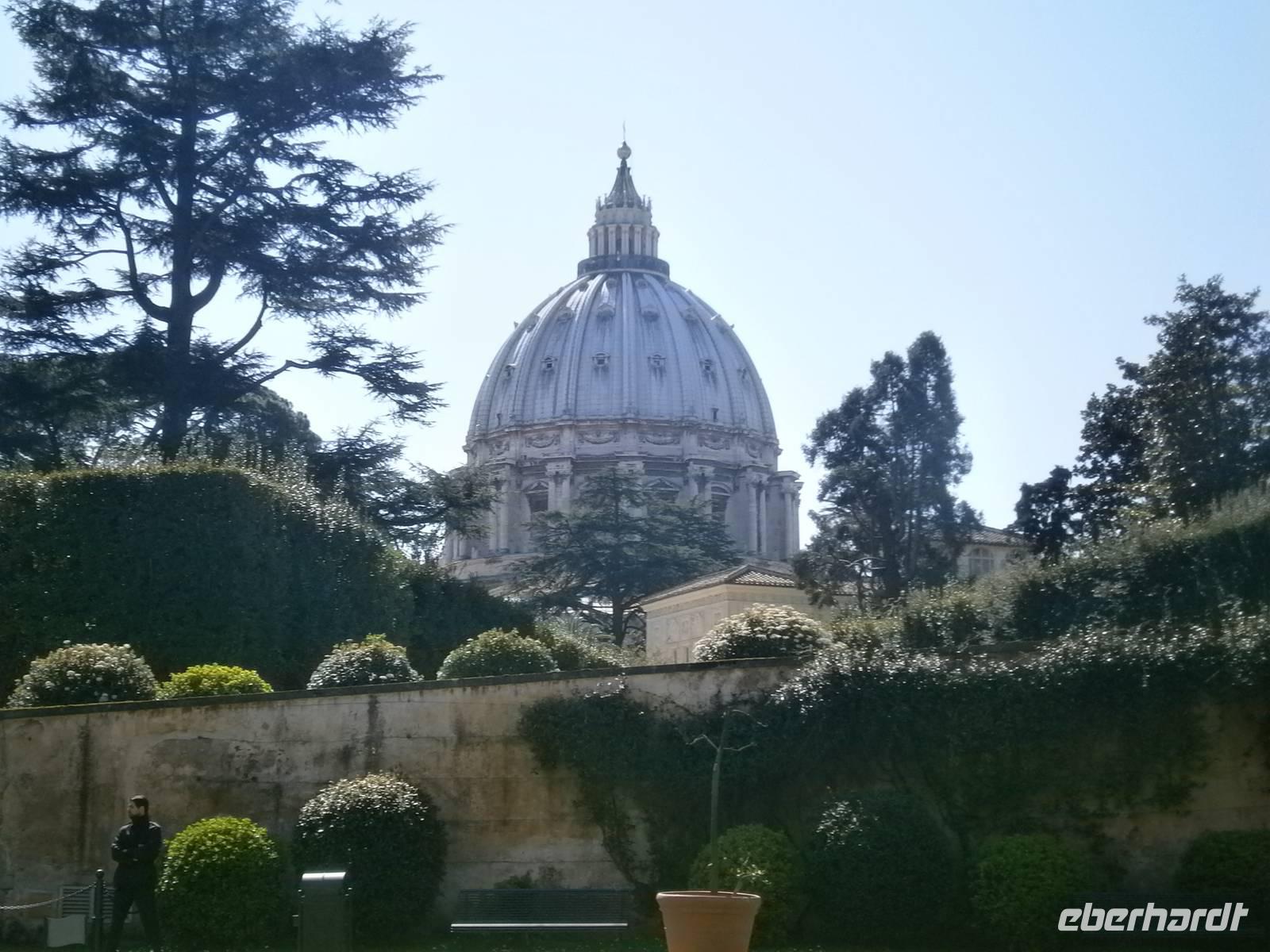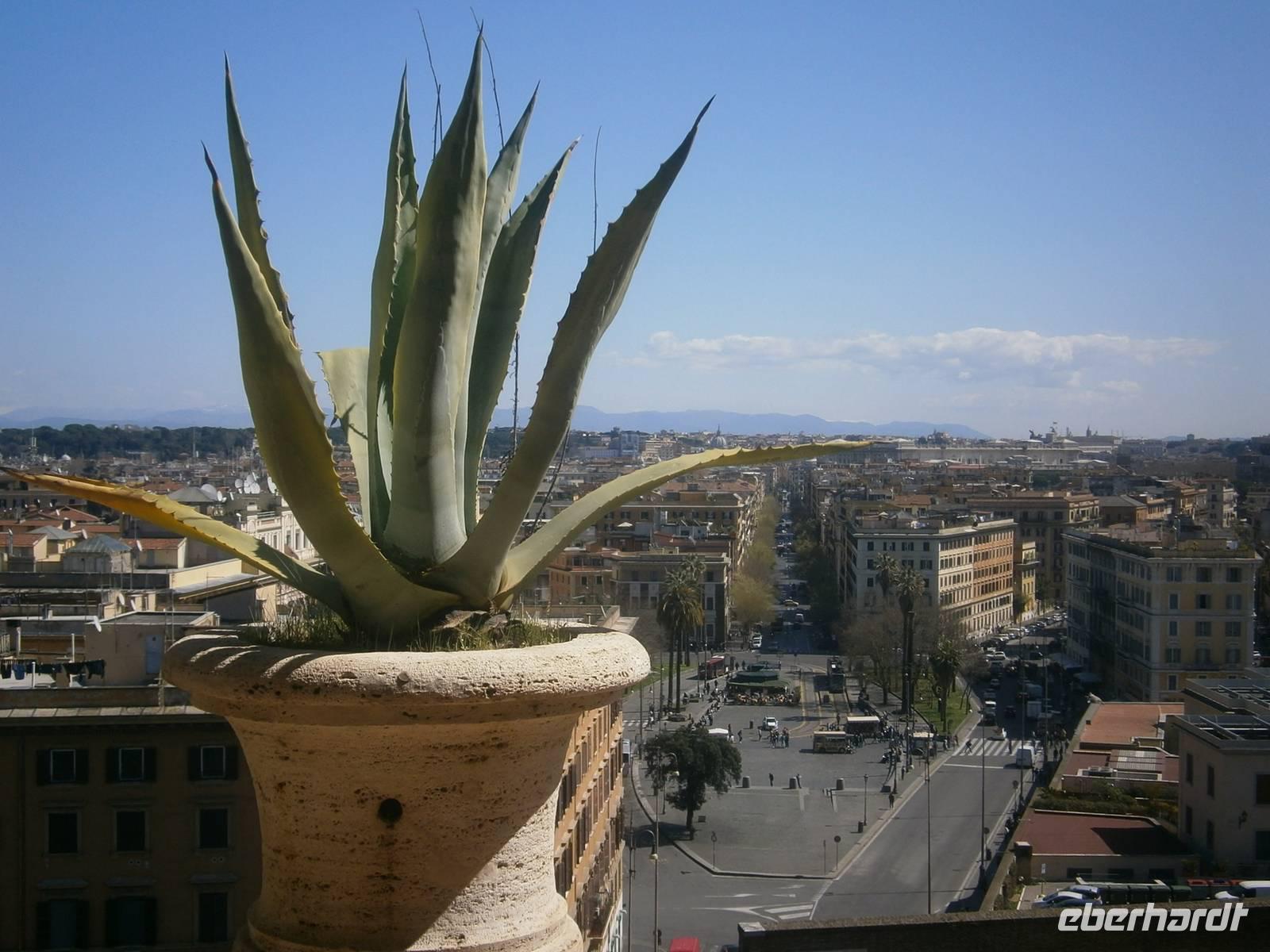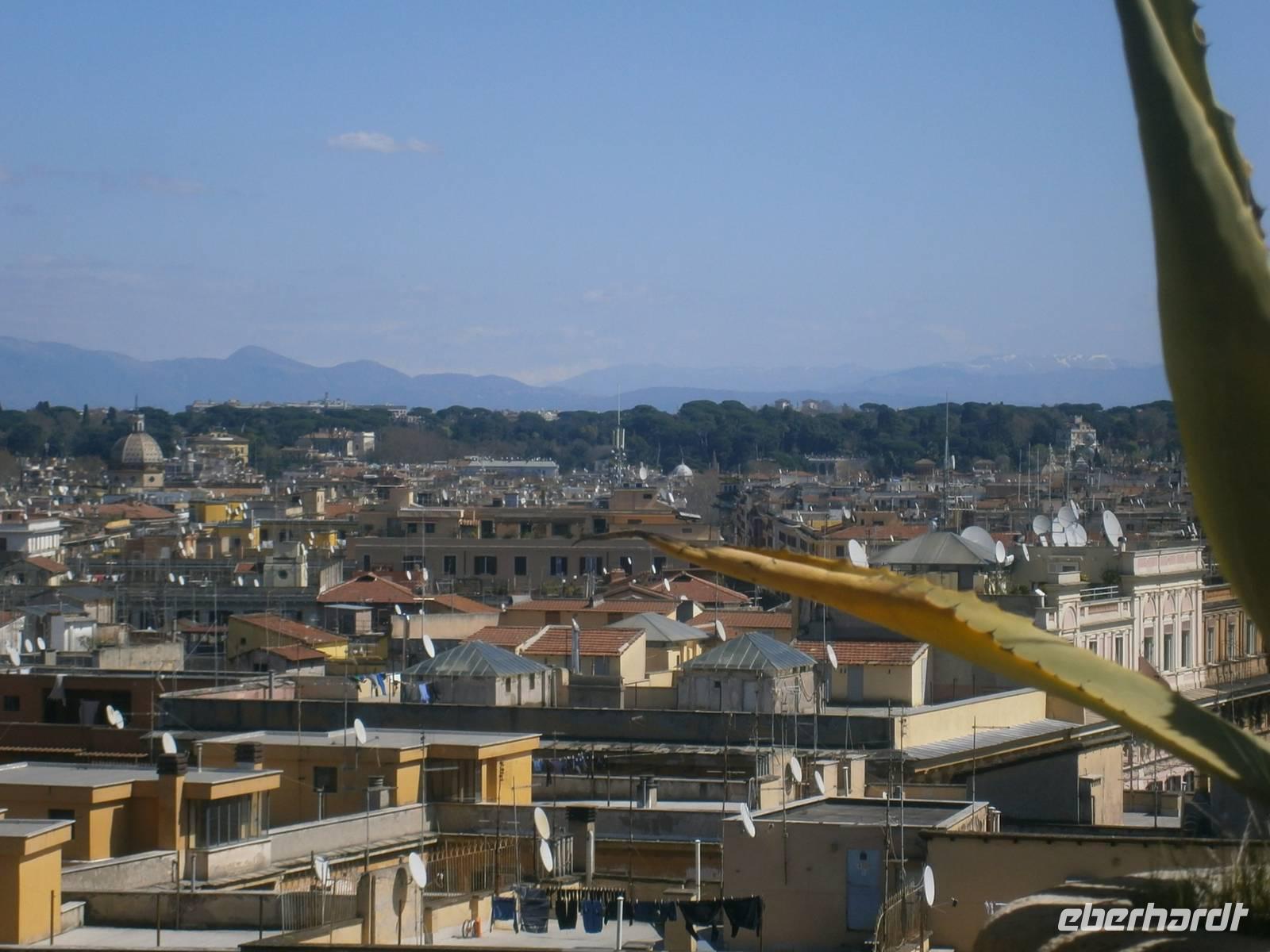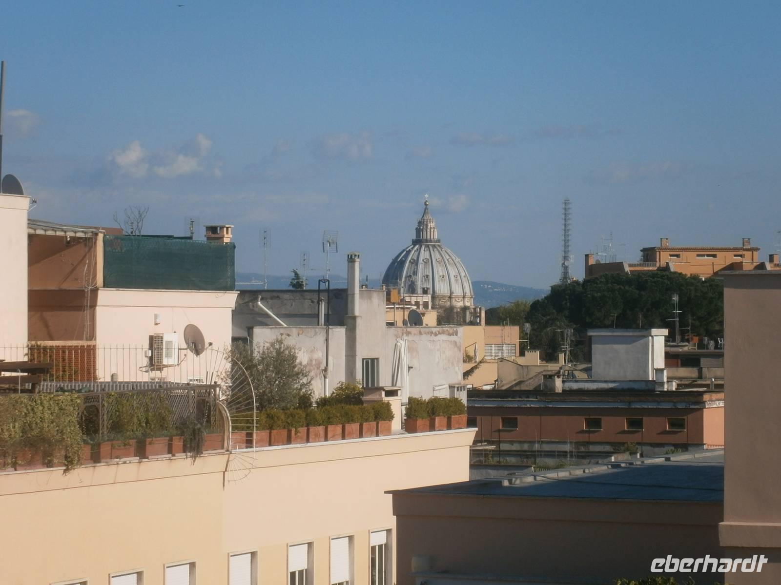Der erste Blick am Morgen geht hinaus zum Fenster. In der Nacht hat es weiter geregnet, doch am morgen sieht die Welt in Rom schon wieder besser aus. So können wir, ausgerüstet mit dem Eberhardt - Reiseleiterfunk, unsere Stadtführung wie geplant beginnen. Mit dem Bus der Linie 990 fahren wir bis zur Via Ottaviano, spazieren über die Piazza Risorgimento, die Via di Porta Angelica und gelangen schließlich auf den Petersplatz. Hier treffen wir auch Susanne, unsere Gästeführerin in Rom. Gemeinsam mit ihr werden wir die nächsten Tage in Rom verbringen.