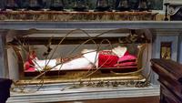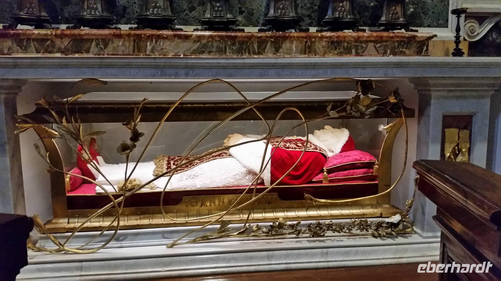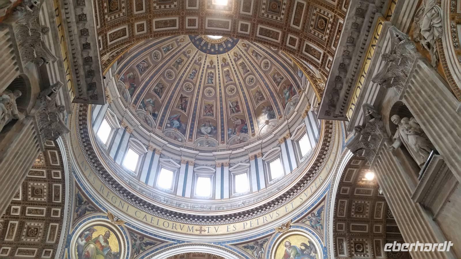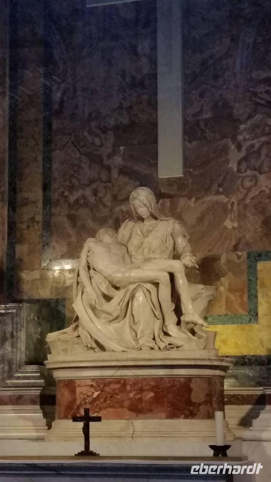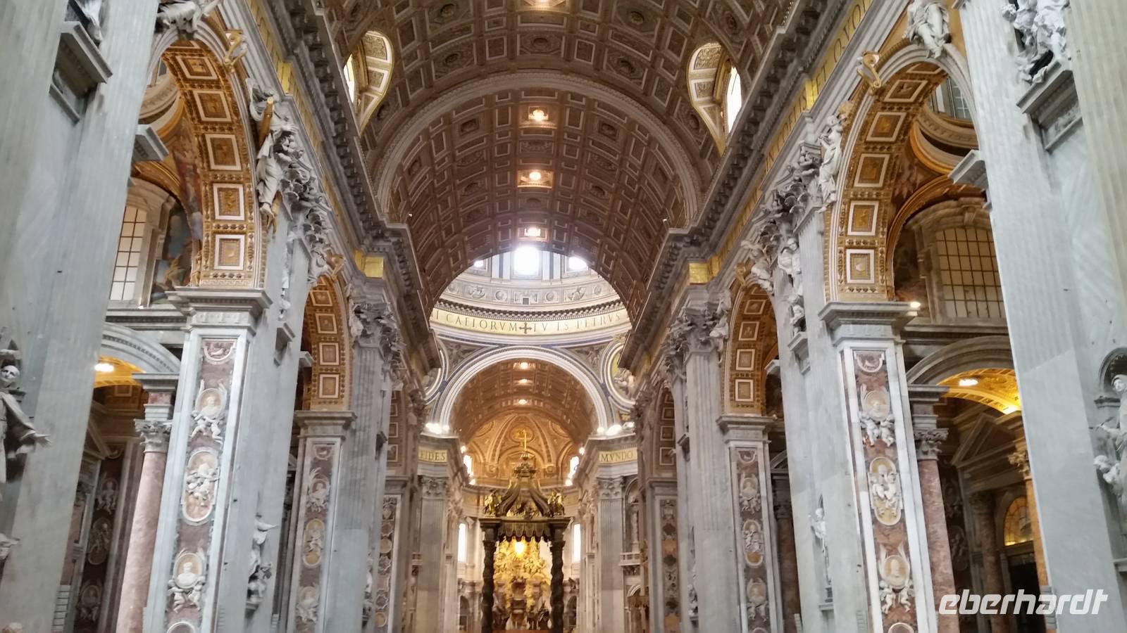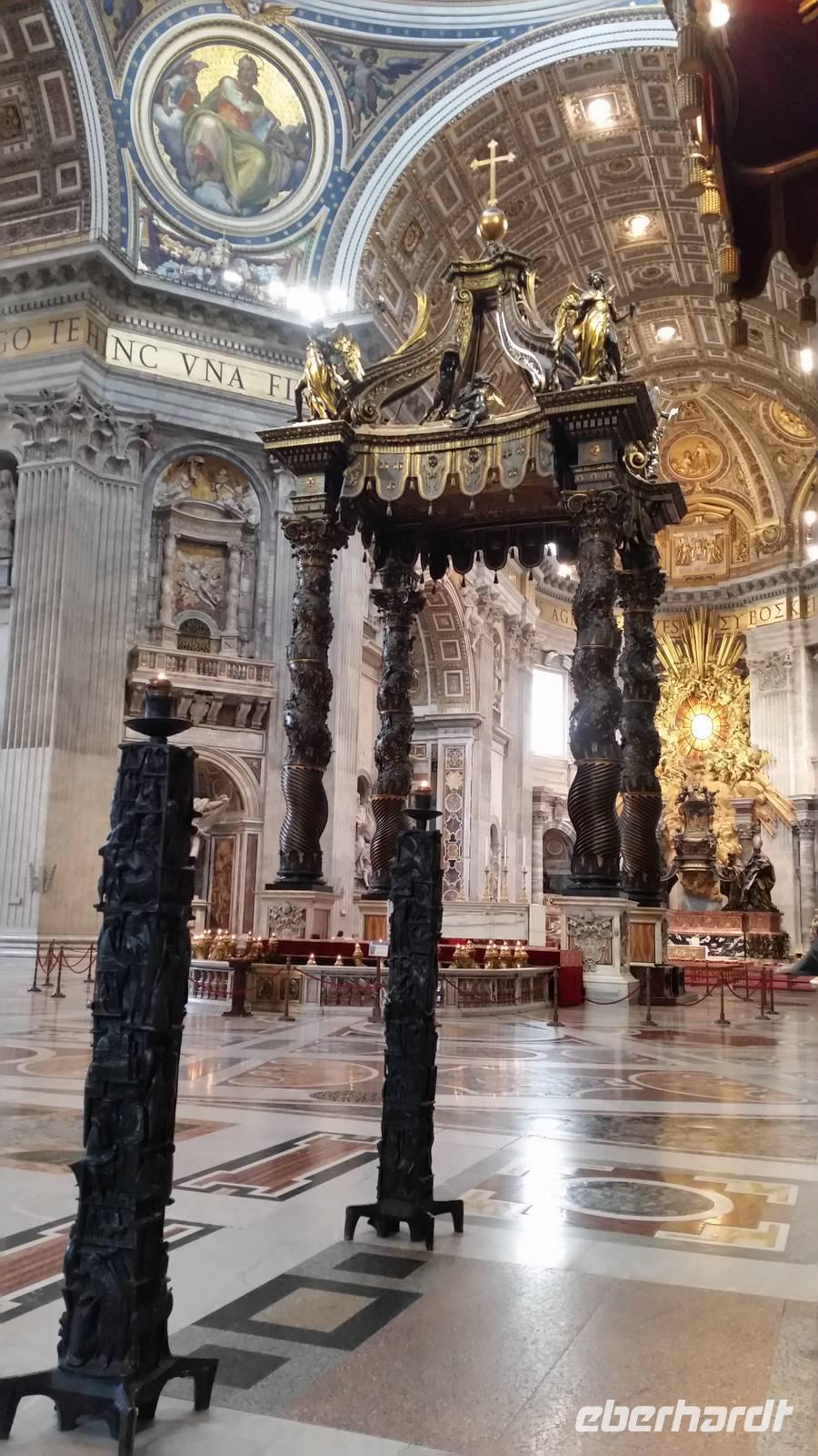 In der Basilica angekommen, kommen wir aus dem Staunen nicht mehr heraus. Unvorstellbar, dass dieser Bau über 200 Meter lang ist. Vor dem Altar des Petersdoms ragt ein gewaltiger Baldachin, eines der unzähligen Werke von Gian Lorenzo Bernini. Neben dem Baldachin bestaunen wir die Bronzestatue des Heiligen Petrus, welcher vermutlich in der Vatikanischen Nekropole unterhalb des Petersdoms begraben sein soll. Wir bemerken, dass der rechte Fuß der Statue etwas abgenutzt ist. Die Berührung der Statue soll wohl Segen bringen. Wir sehen viele Kunstwerke Michelangelos, unter anderem sein weltberühmtes Werk „Pietà".