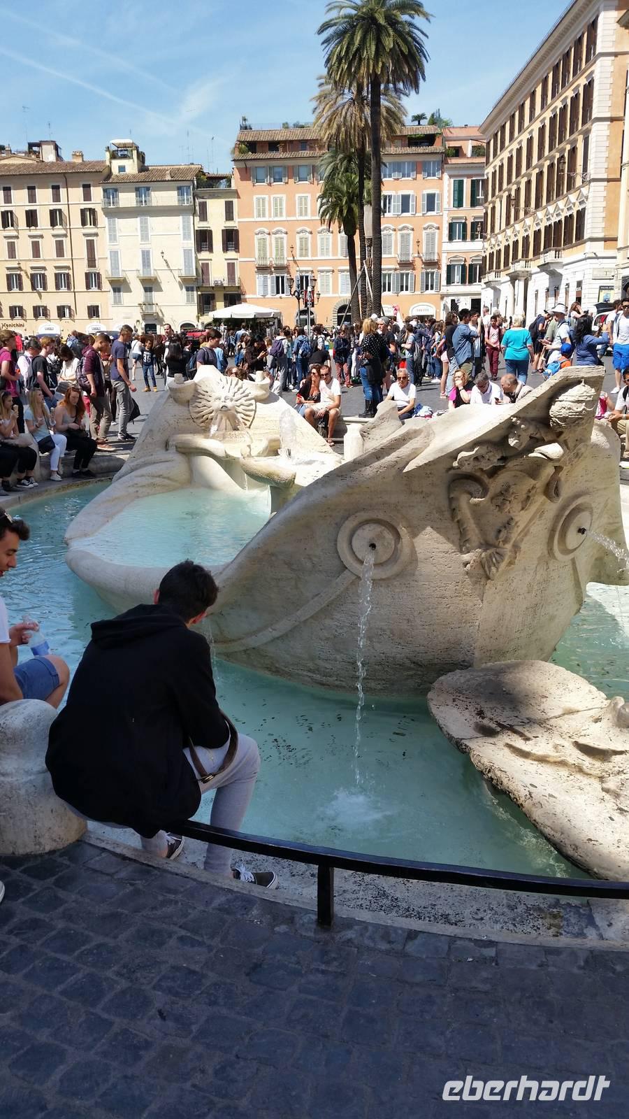 Leider sehen wir nicht allzuviel vom Brunnen, da dieser seit Juni 2014 restauriert wird. Dennoch lassen es sich einige nicht nehmen, eine Münze über die linke Schulter in den Brunnen zu werfen. Dem Volksglaube nach beschert der Münzwurf in den Brunnen eine sichere Rückkehr nach Rom.