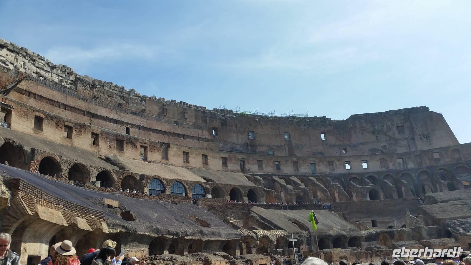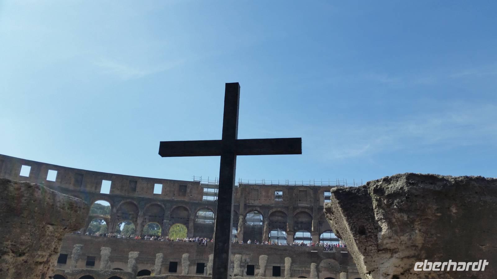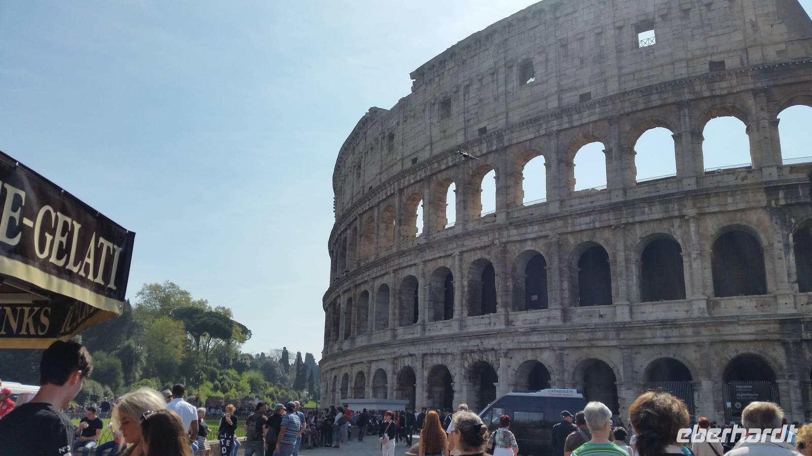 Anschließend verlassen wir das Forum und gehen weiter, um gemeinsam das Kolosseum zu besichtigen. Ein über 2000 Jahre alter Schauplatz grausamer Spektakel. Skuril - denn heute ist das Wahrzeichen der Stadt ein Monument gegen die Todestrafe. 48 Stunden lang erstrahlt das Kolosseum in bunten Farben, wenn in einem Land der Welt die Todestrafe abgeschafft wird.