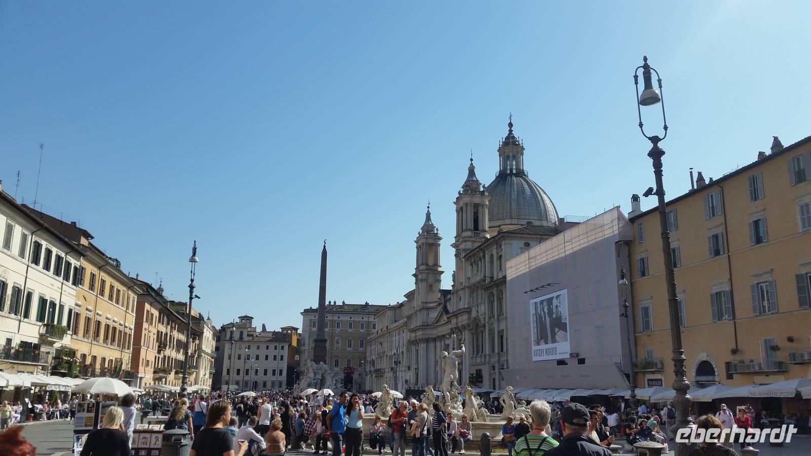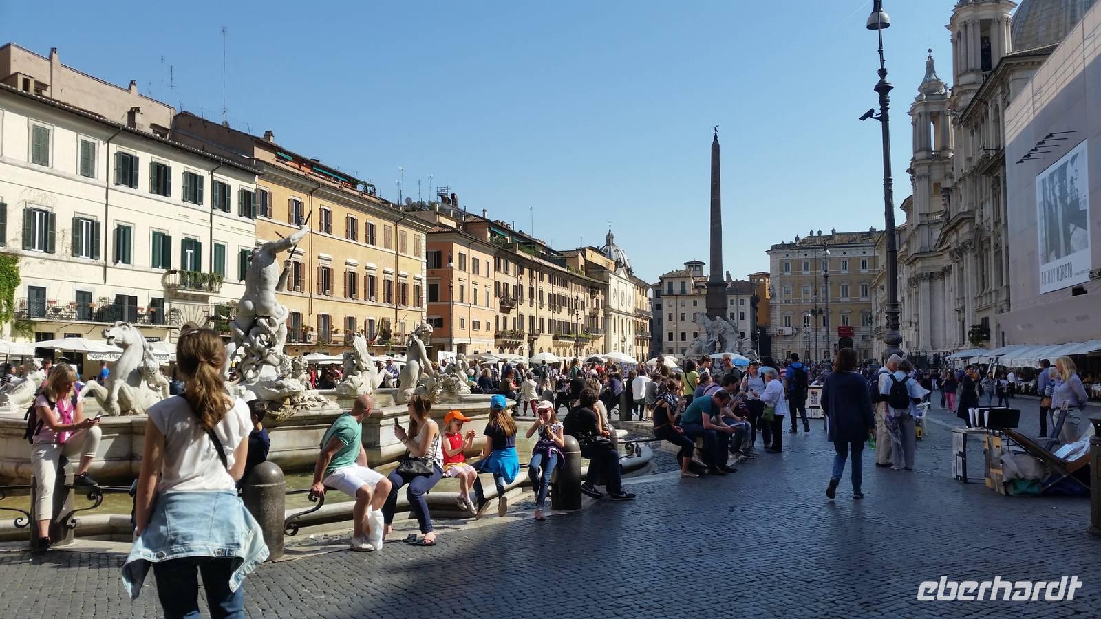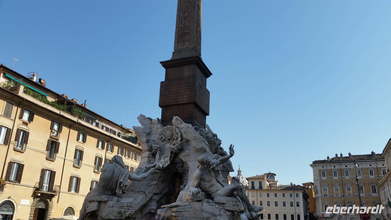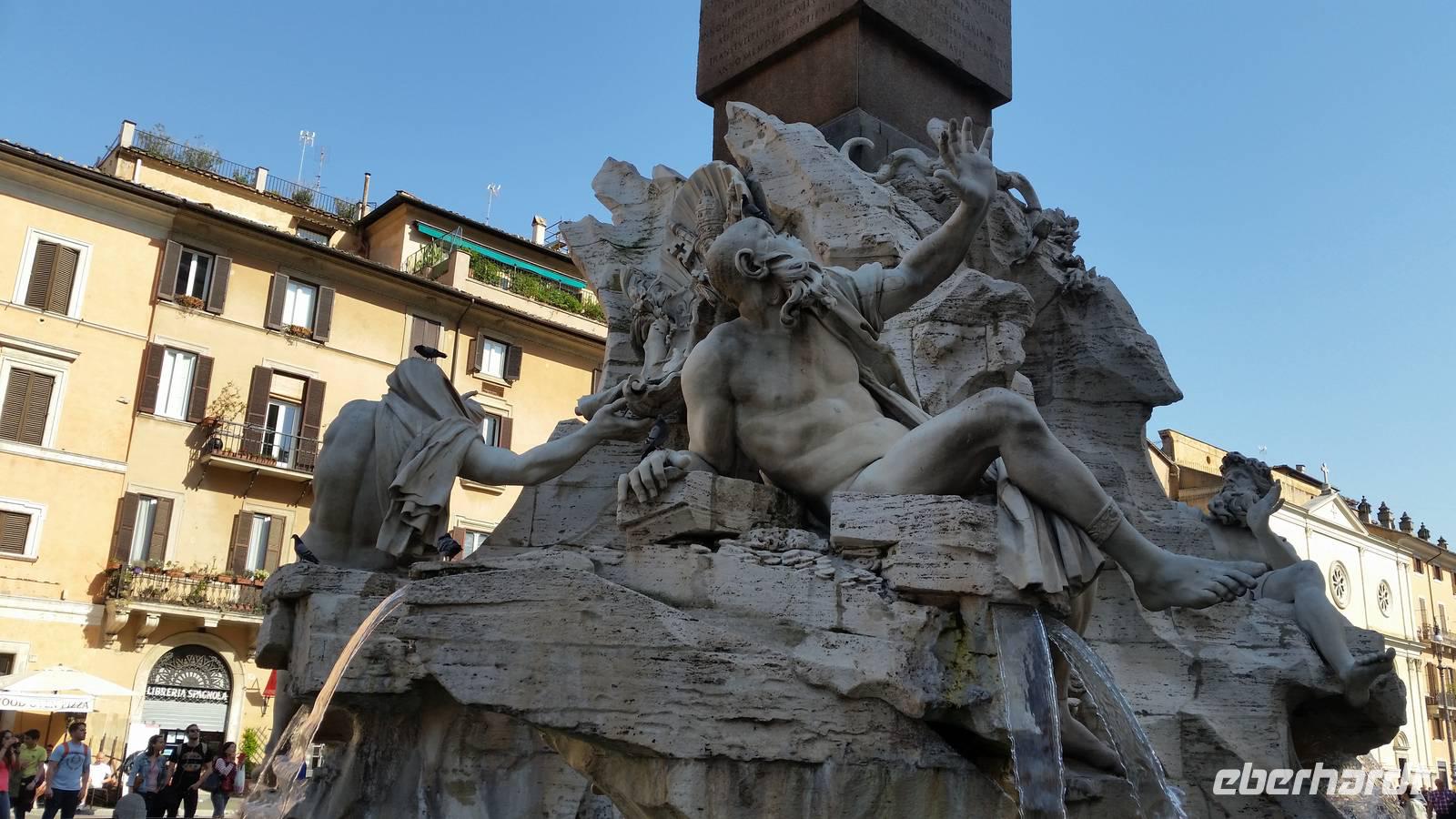 Mitten auf dem Piazza Navona ragt ein barockes Meisterwerk Berninis: Der Vierströmebrunnen. Er versinnbildlicht die größten Flüsse der damals 4 bekannten Kontinente Asien, Europa, Afrika und Amerika. Ganges, Donau, Nil und Rio de la Plata.
