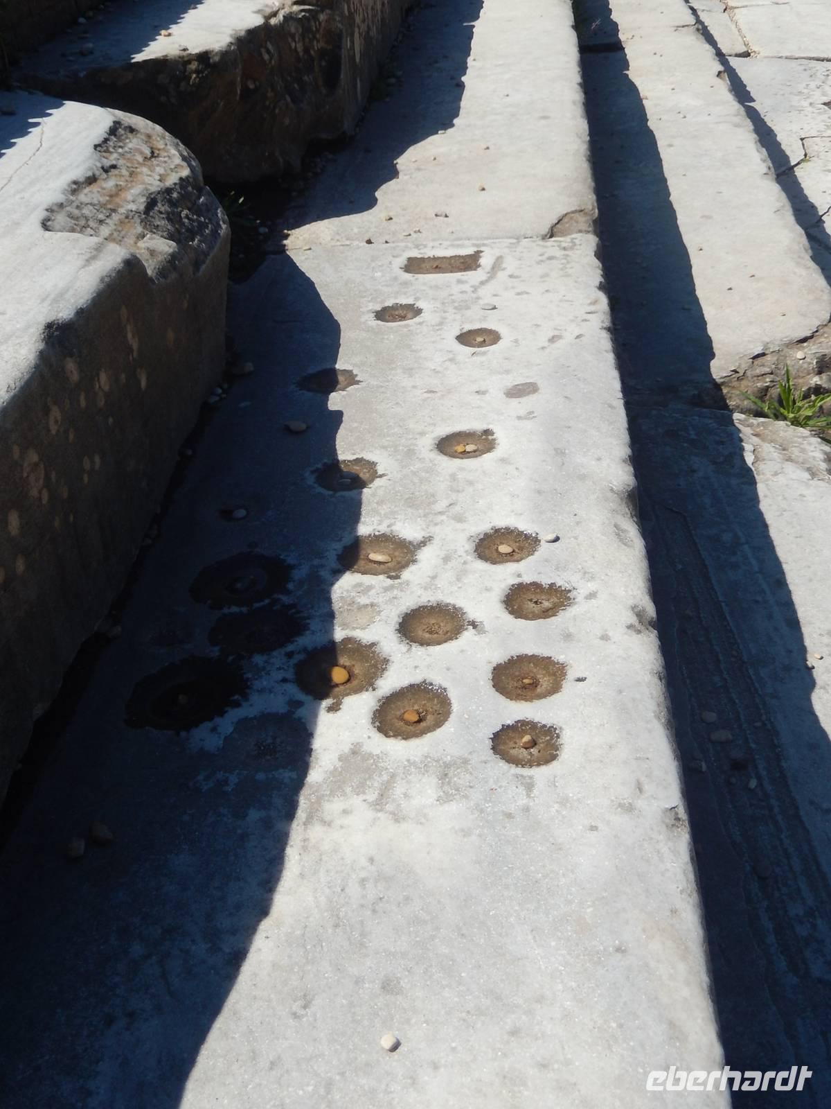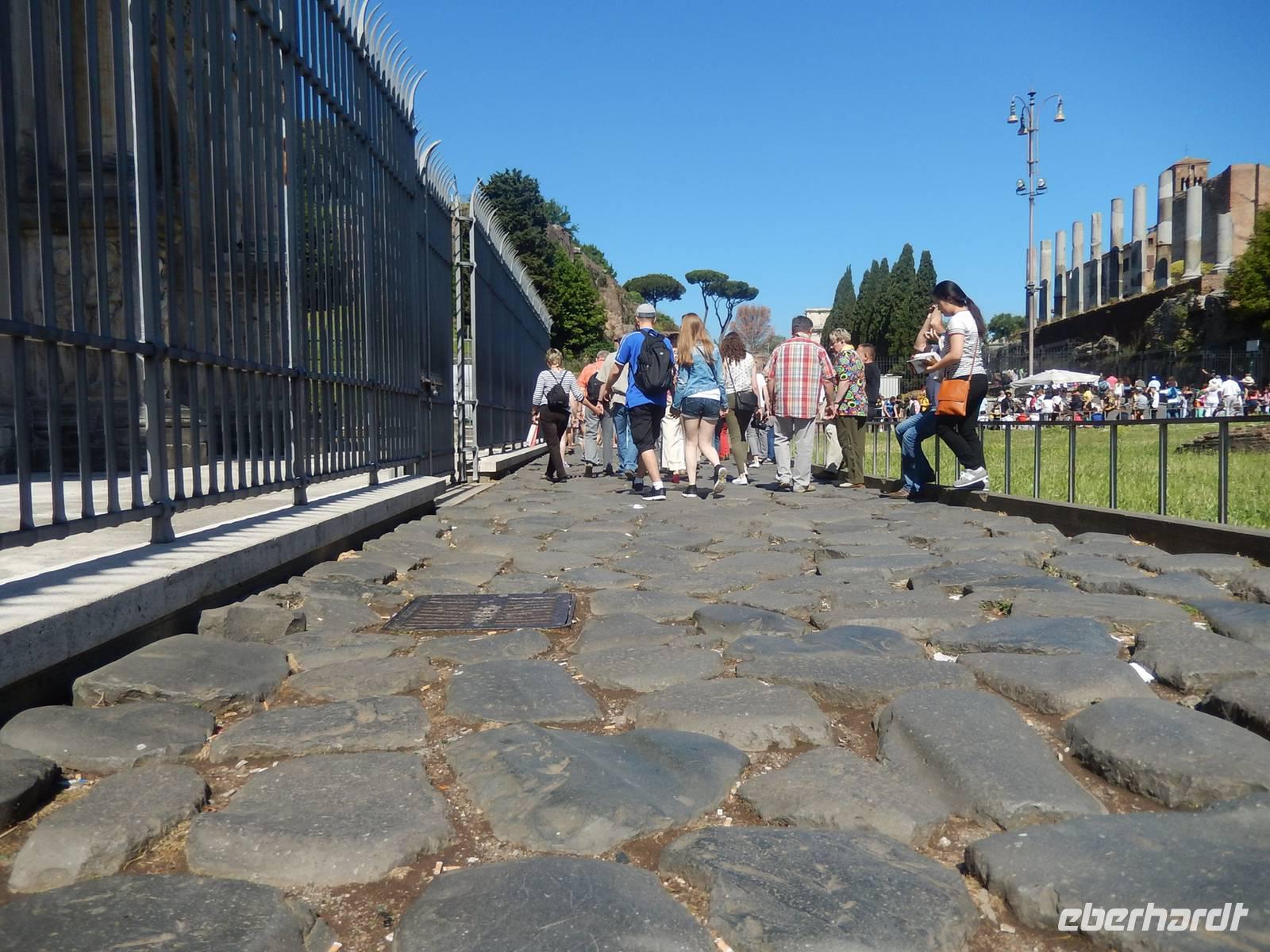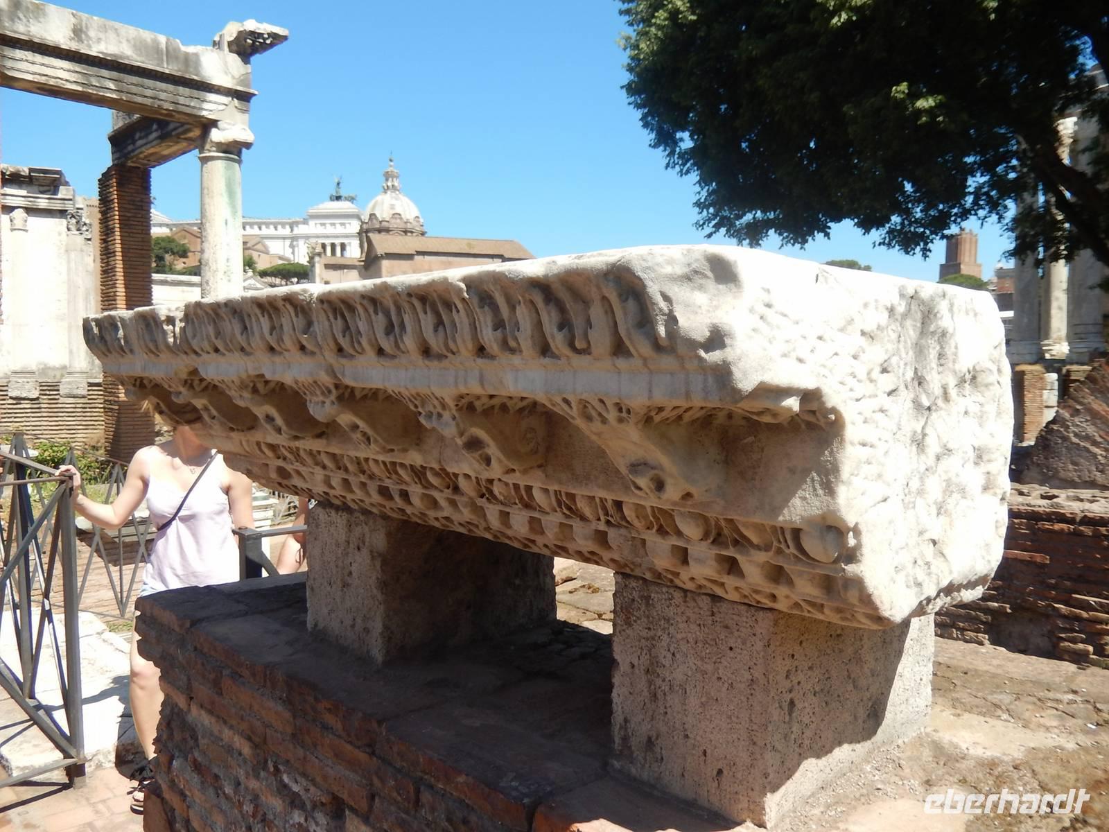 Weil die Sonne mittlerweile zu Höchstform auflief, füllten wir zunächst unsere Flaschen an einem der zahlreichen römischen Brunnen und durchquerten dann begleitet von Marilisas ausführlichen Erklärungen das Forum Romanum. Wir lernten, dass das Forum damals das Zentrum des gesellschaftlichen und politischen Lebens war, sahen antike Spiele, mit denen sich die Tagelöhner damals die Zeit vertrieben hatten und bestaunten ein Gebäude nach dem anderem.