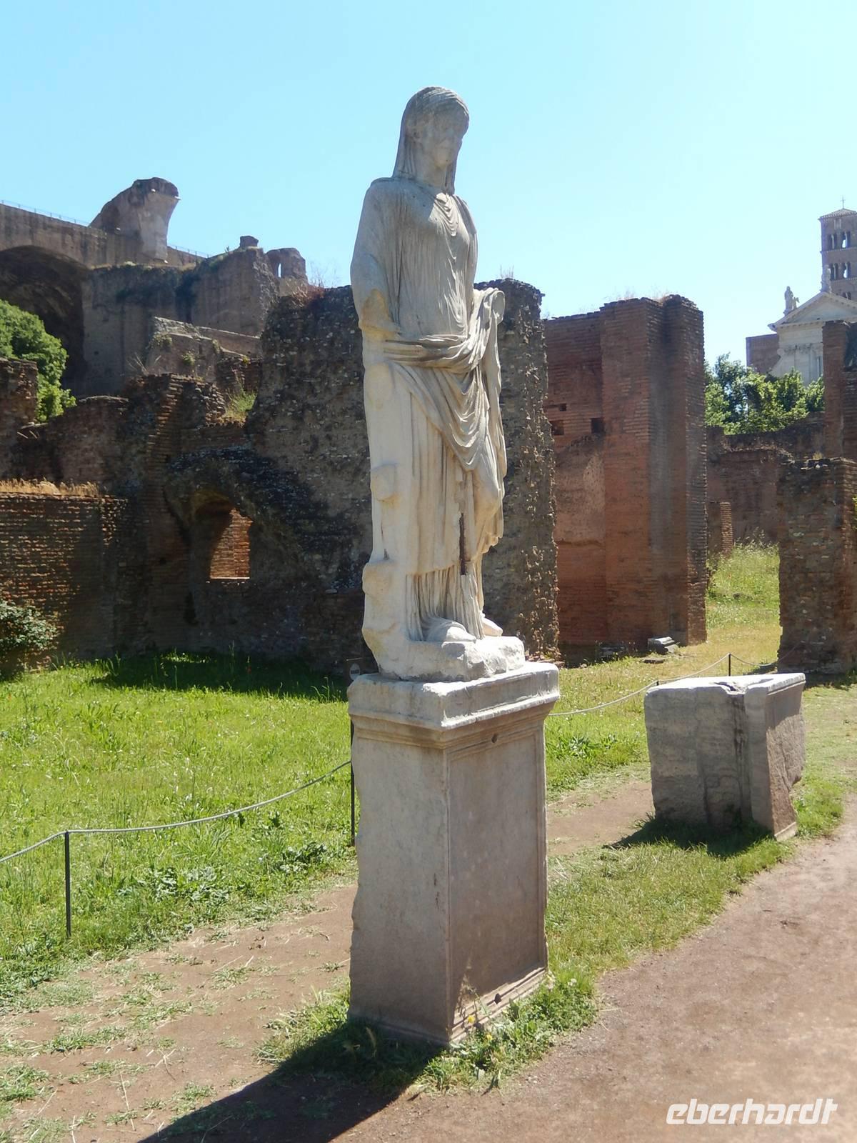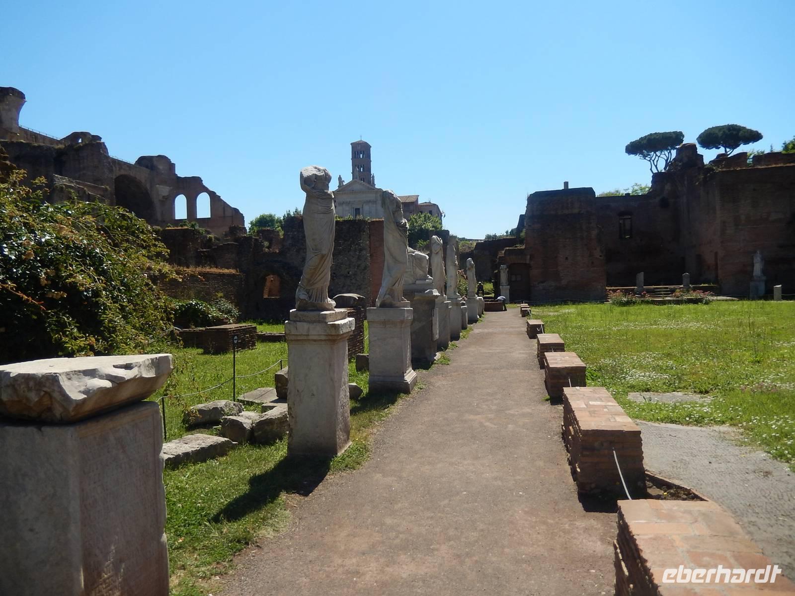 Unter anderem sahen wir die größte römische Basilika, die Maxentiusbasilika, besuchten den Romulustempel und betraten das Haus der Vestalinnen. Hier hatten damals die für alle Römer heiligen Frauen gewohnt, die im Vestalinnentempel gleich nebenan das heilige, ewig brennende Feuer bewacht hatten. Wir staunten über die Tempelanlagen, die von der katholischen Kirche in Kirchen umgewandelt worden und so erhalten geblieben waren und legten am Tempel des Divus Iulius ein. Hier wurde nach seiner Ermordung niemand anderes verehrt, als der Imperator Iulius Caesar, der an dieser Stelle verbrannt worden war. Noch heute werden regelmäßig Blumen in den schmucklosen Überresten abgelegt.