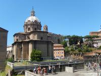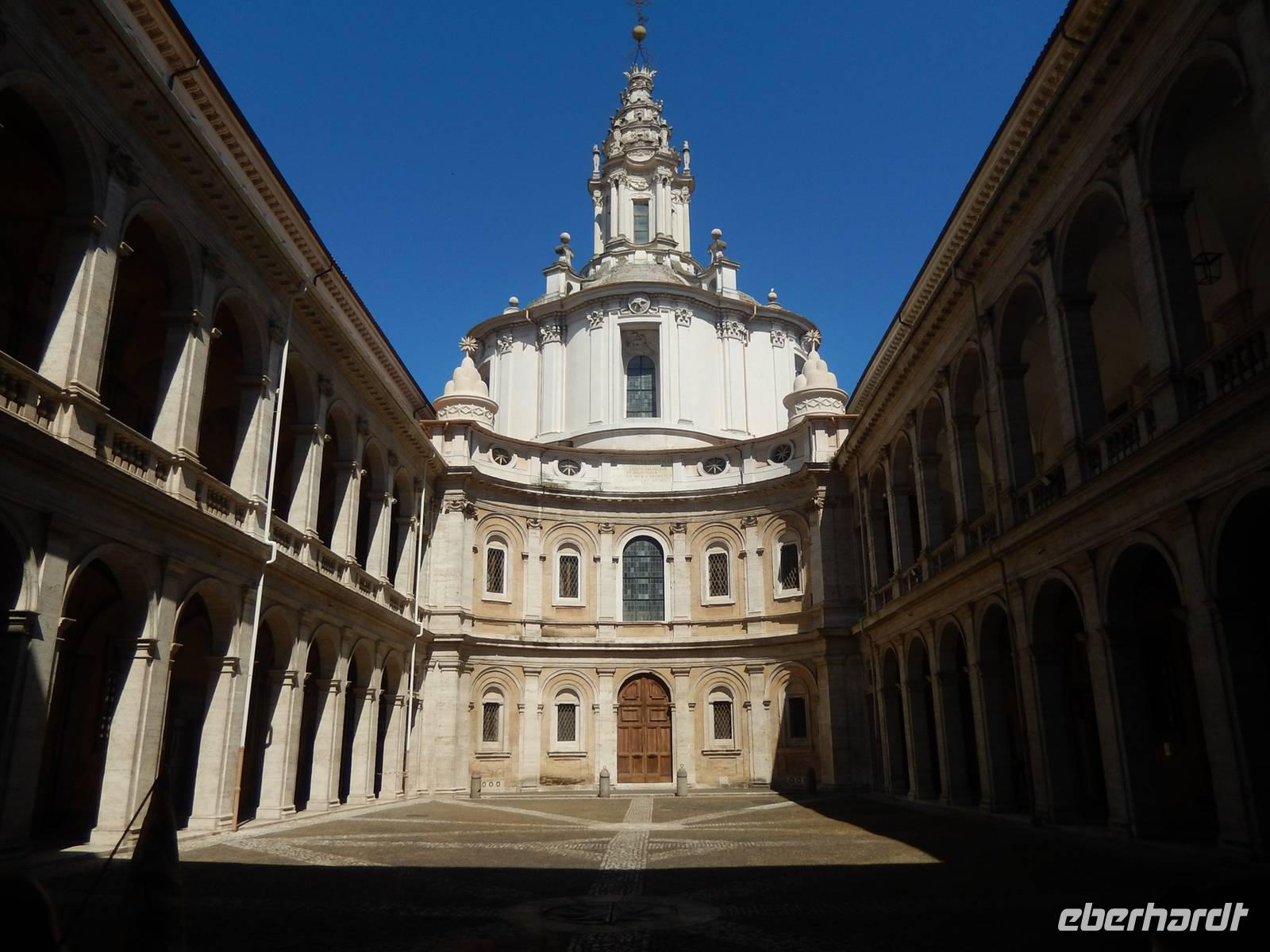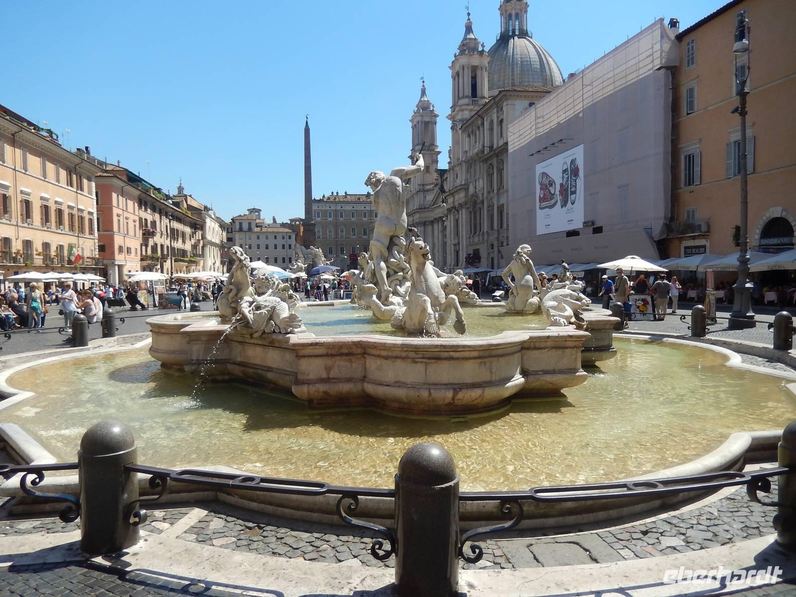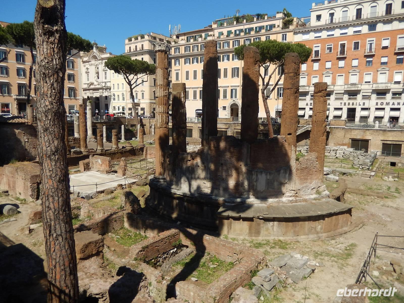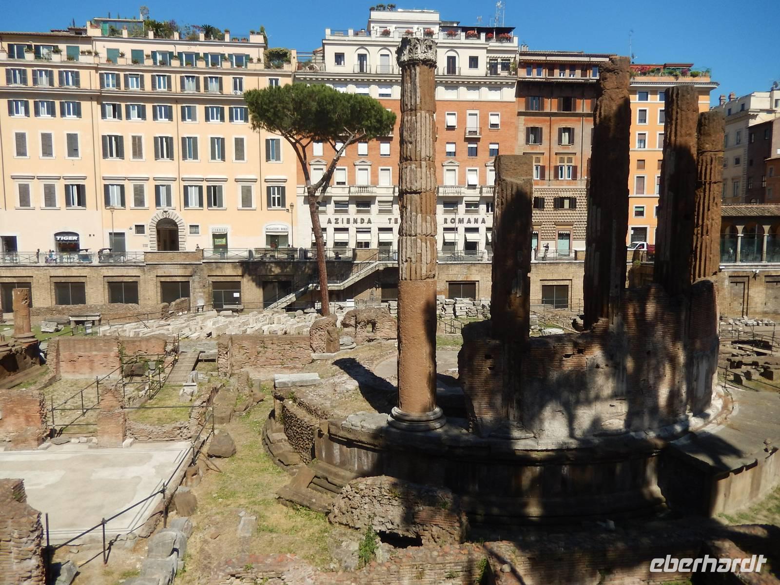Natürlich überschritten wir auch die Engelsbrücke über den Tiber und gelangten so wieder ins Stadtzentrum von Rom. Wir liefen bis zum Piazza Navona, wo wir uns mit einem leckeren italienischen Eis ein wenig von der brennenden Sonne erholten und dabei den gewaltigen Vierströmebrunnen bestaunten. Eine kleine Überraschung erlebten wir, als wir durch eine Pforte in das heutige Staatsarchiv schritten. Vor uns türmte sich plötzlich eine hübsche barocke Kirche mit einem herrlichen Glockenturm auf, die Sant Ivo alla Sapienza. Das Staatsarchiv war früher auch Sitz der römischen Universität gewsen. Von hier gingen wir weiter bis zum Largo di Torre Argentina, einer Ausgrabungsstätte einer römischen antiken Tempelanlage.