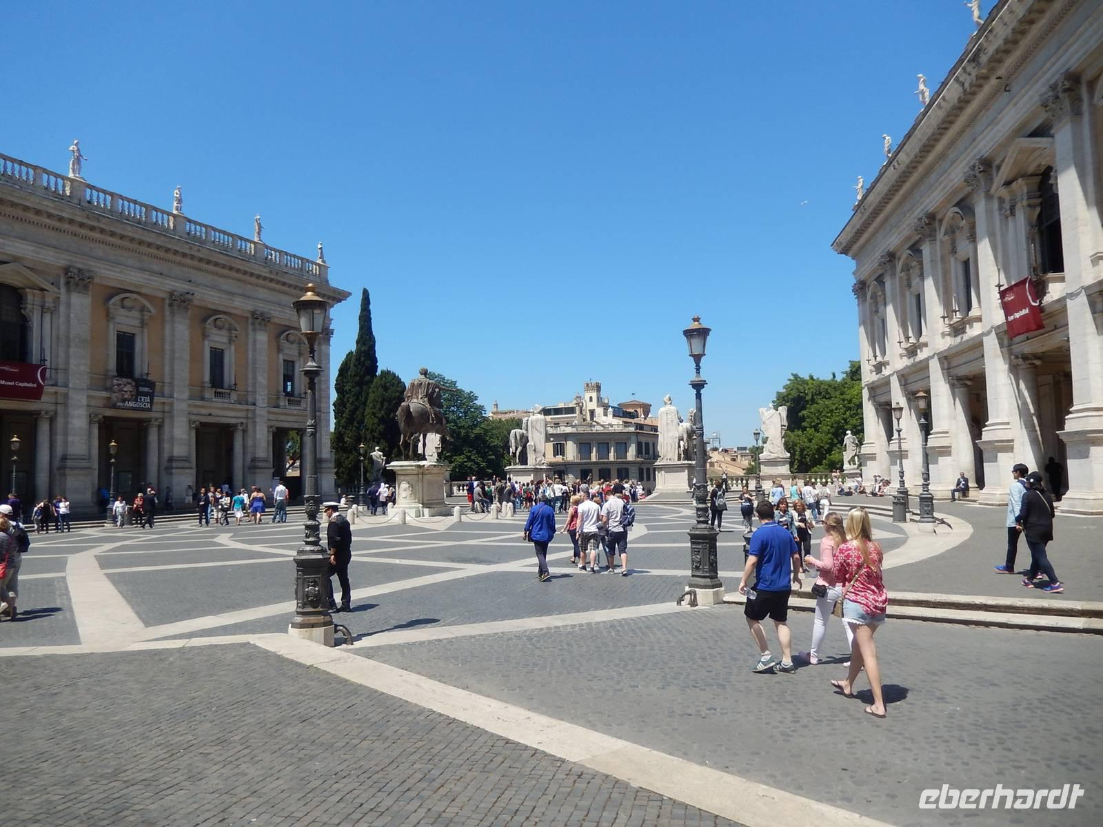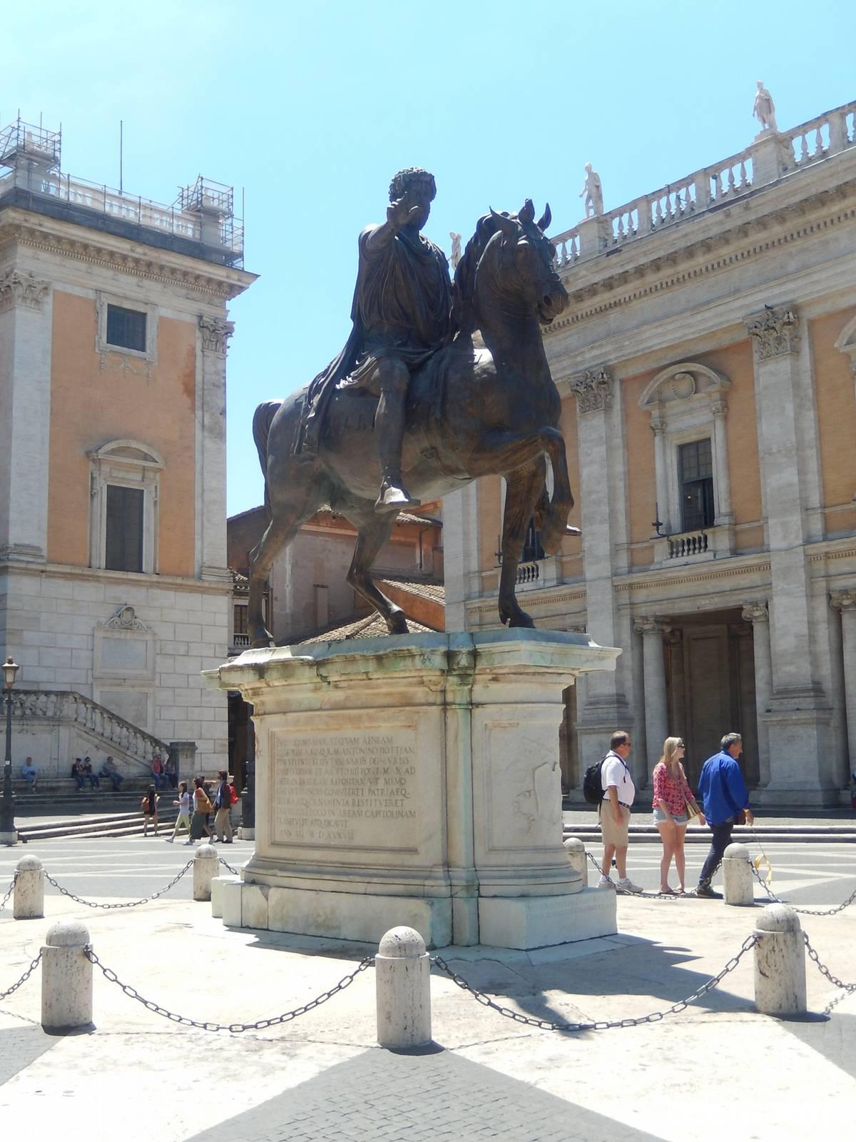 Nach dem Besuch des Forums konnten wir es nicht erwarten, auch die übrigen erhaltenen Gebäude der römischen Antike im Stadtzentrum Roms zu besichtigen. Vorbei an den Kaiserforen, die das damls zu klein gewordene Forum entlasten sollten gingen wir gemeinsam bis zur Trajanssäule und folgten von hier aus dem Weg auf den Kapitolshügel hinauf. Wir bestaunten den von Michelangelo neu gestalteten Platz und die Kopie der einzigen aus der römischen Zeit erhaltene bronzene Reiterstatue - Glücklicherweise hatte man lange Zeit den abgebildeten Marc Aurel für den Kaiser Konstantin den Großen gehalten, den ersten römischen Kaiser, der das Christentum akzeptiert hatte.