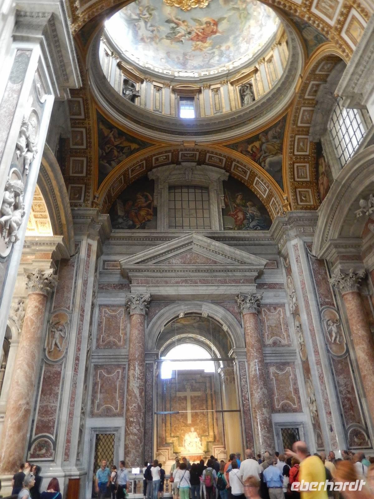 Die Schlange vor dem Dom war bereits sehr lang, auch wenn sie später noch länger werden sollte und so reihten wir uns sofort ein. Da für den Petersdom kein Eintritt verlangt wird, ging das Warten jedoch sehr schnell voran, nach etwa einer Viertelstunde hatten wir die Sicherheitskontrolle hinter uns gelassen. Nach kurzen Formalitäten konnten wir dann endlich eine der größten Kirchen der Welt betreten und waren alle überwältigt von dem Anblick. Auf über 200 Metern Länge reihte sich ein Kunstwerk an das andere, wir sahen kunstvolle Gemälde, Mosaike und natürlich Michelangelos berühmte Pieta.