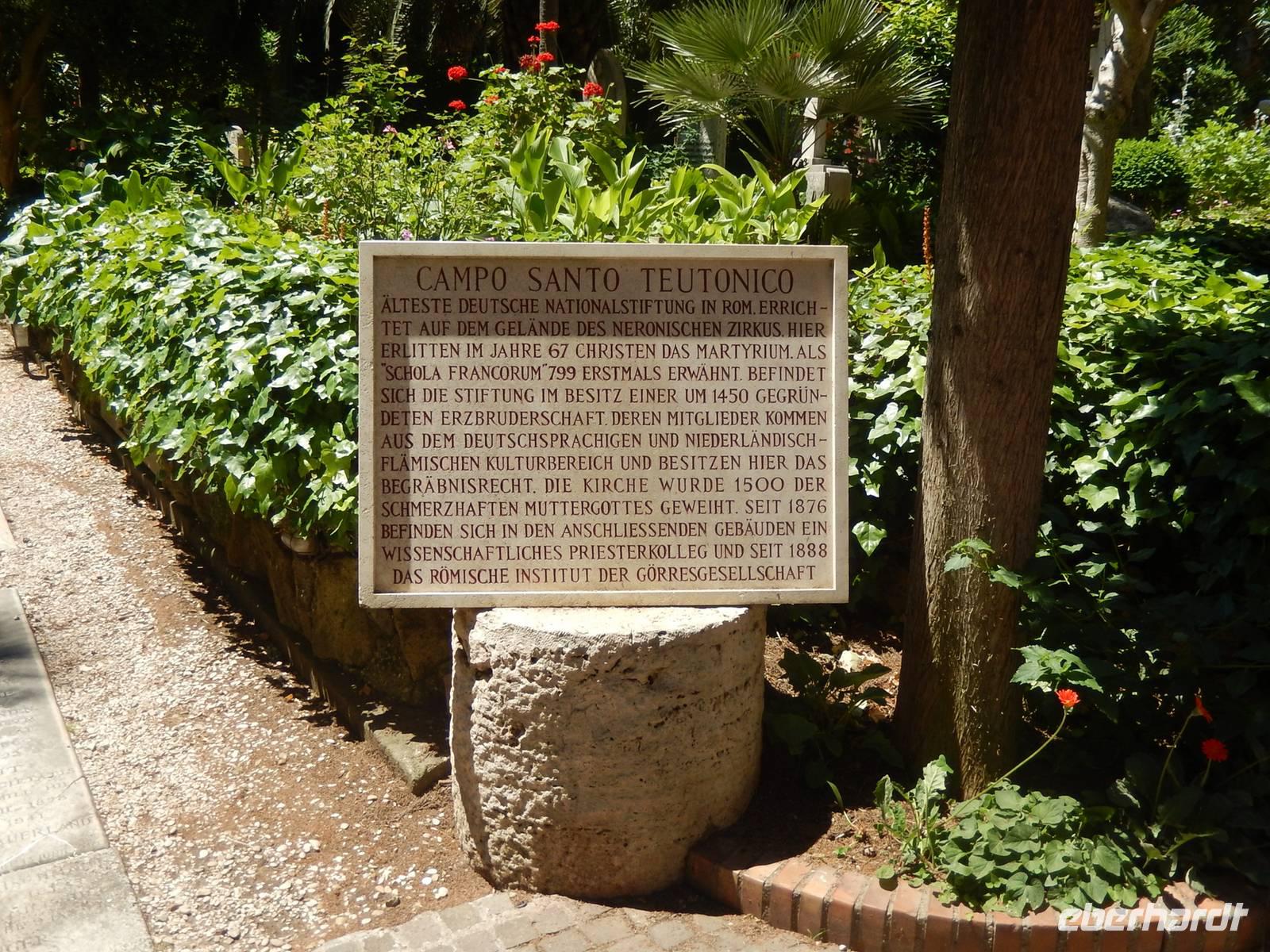 Nach dem Besuch des Petersdoms hatten wir noch etwas ganz Besonderes im Vatikan vor: Wir wollten den Campo Santo Teutonico besuchen, den Friedhof der Deutschen und Flamen. Dieser kleine Friedhof mitten im Vatikan wird von einer deutschen Bruderschaft gepflegt. Zugang erhält nur, wer bei den Schweizer Gardisten am Tor südöstlich des Petersdoms zwischen 9 und 12 Uhr auf deutsch Zugang zum Friedhof begehrt.