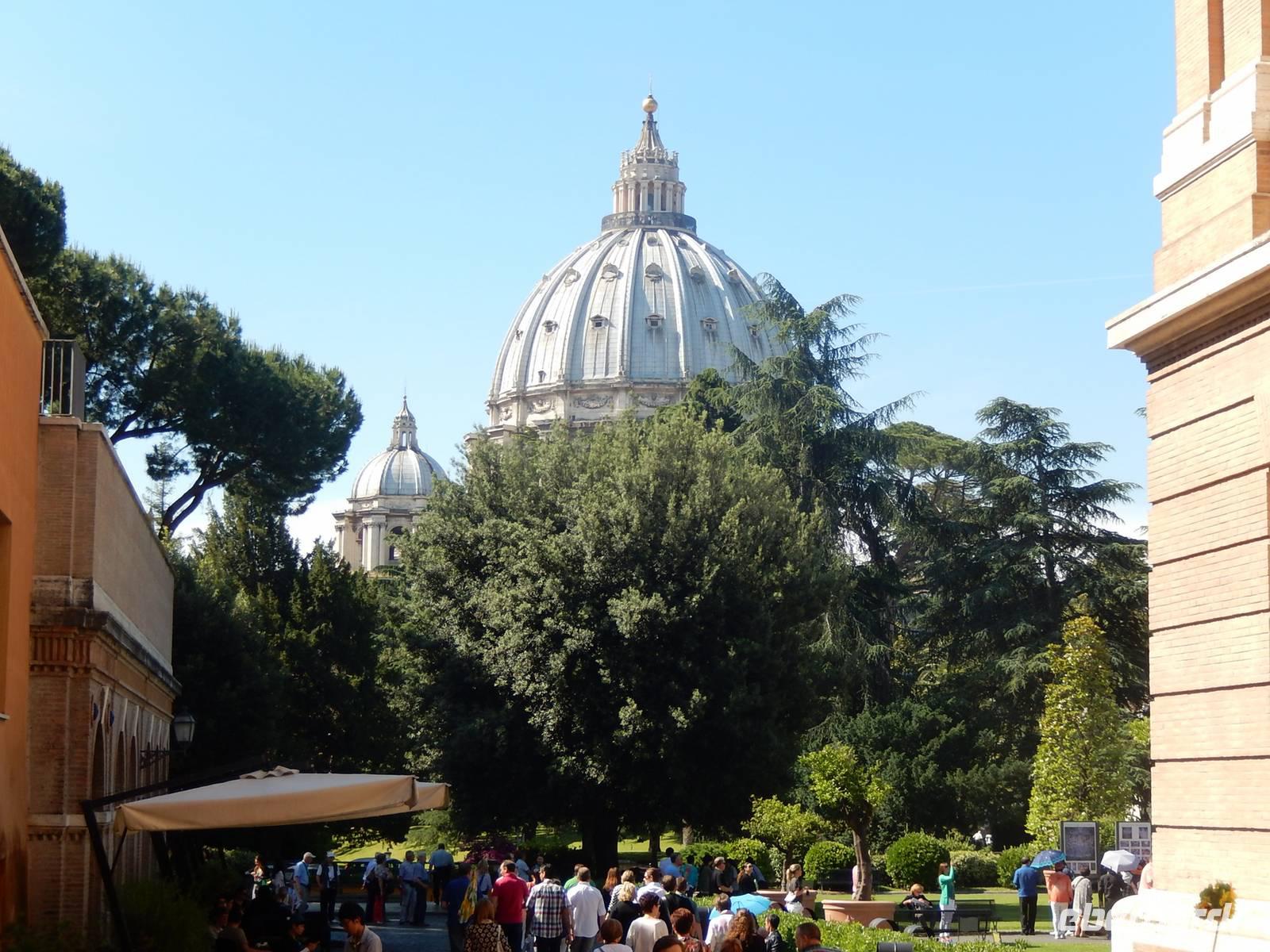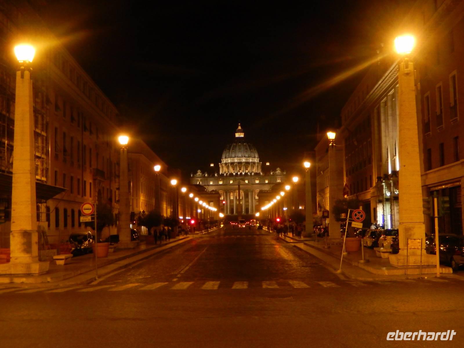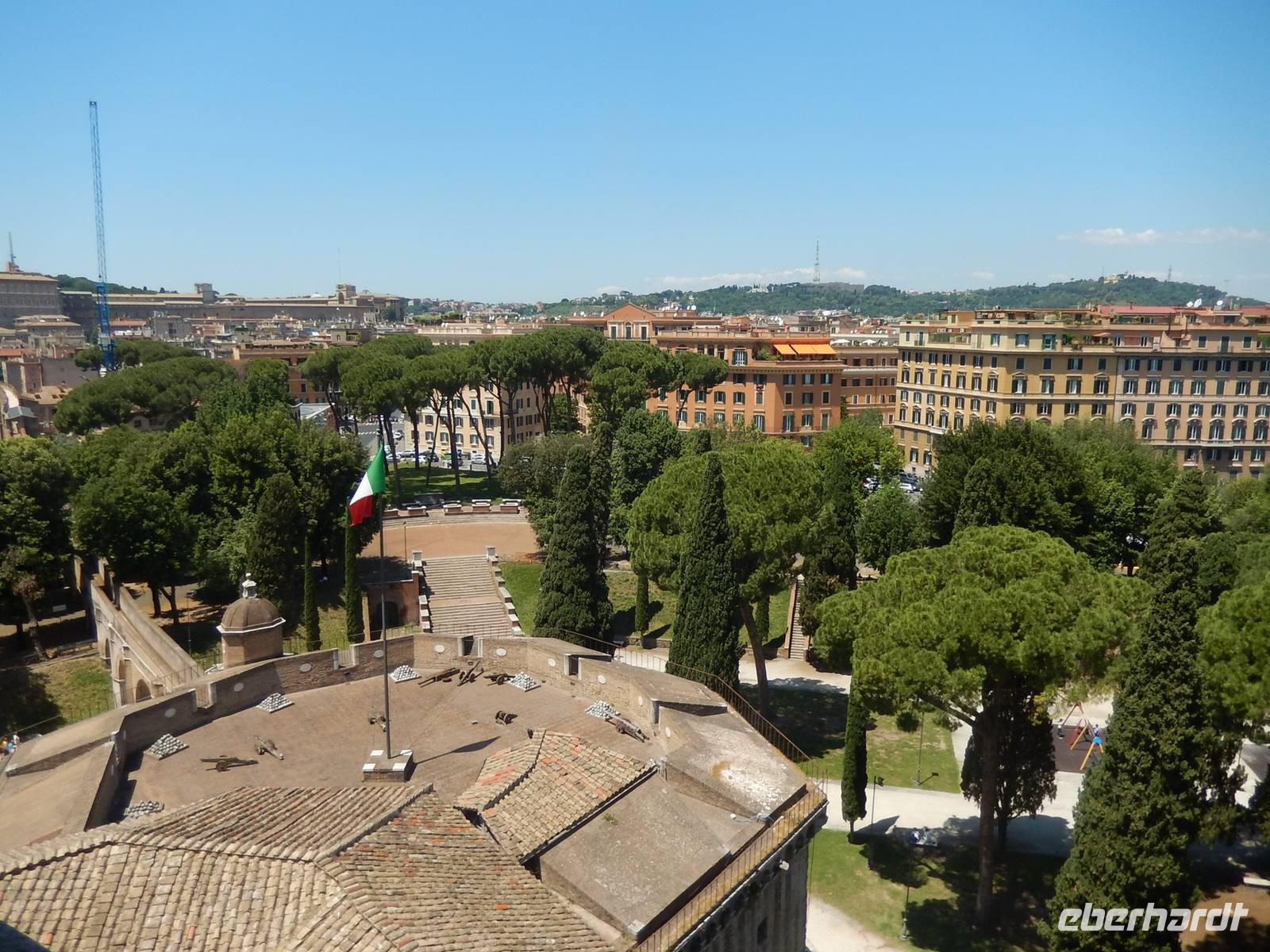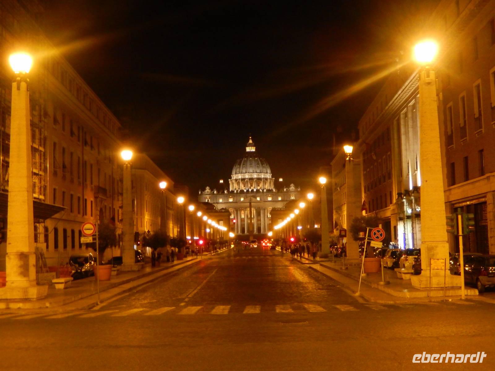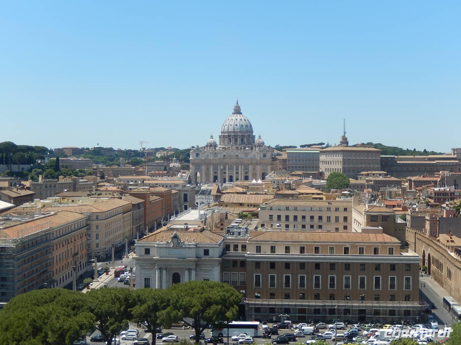 Eine perfekte Gelegenheit, um nachzusehen, wo sich Banken, Supermärkte und Restaurants befanden. Von allem gab es in der Gegend genügend. Wir gingen vorbei an der Metrostation, die sich etwa 15 Minuten vom Hotel entfernt befand und entschlossen uns, auch den Weg zum Petersplatz schon mal zu erkunden. Der Vatikan lag vom Hotel nur etwa 25 Minuten entfernt, um zum Petersplatz zu gelangen, mussten wir allerdings die hohen Mauern des kleinsten Staats der Welt zur Hälfte umrunden, lag der Petersplatz doch auf der anderen Seite. Alles in allem betrug der Fußweg zum Petersplatz etwa 40 Minuten. Als wir an der Mauer des Vatikans ankamen, hörte sogar der Regen auf und sollte auch für den Rest der Reise nicht wieder einsetzen.