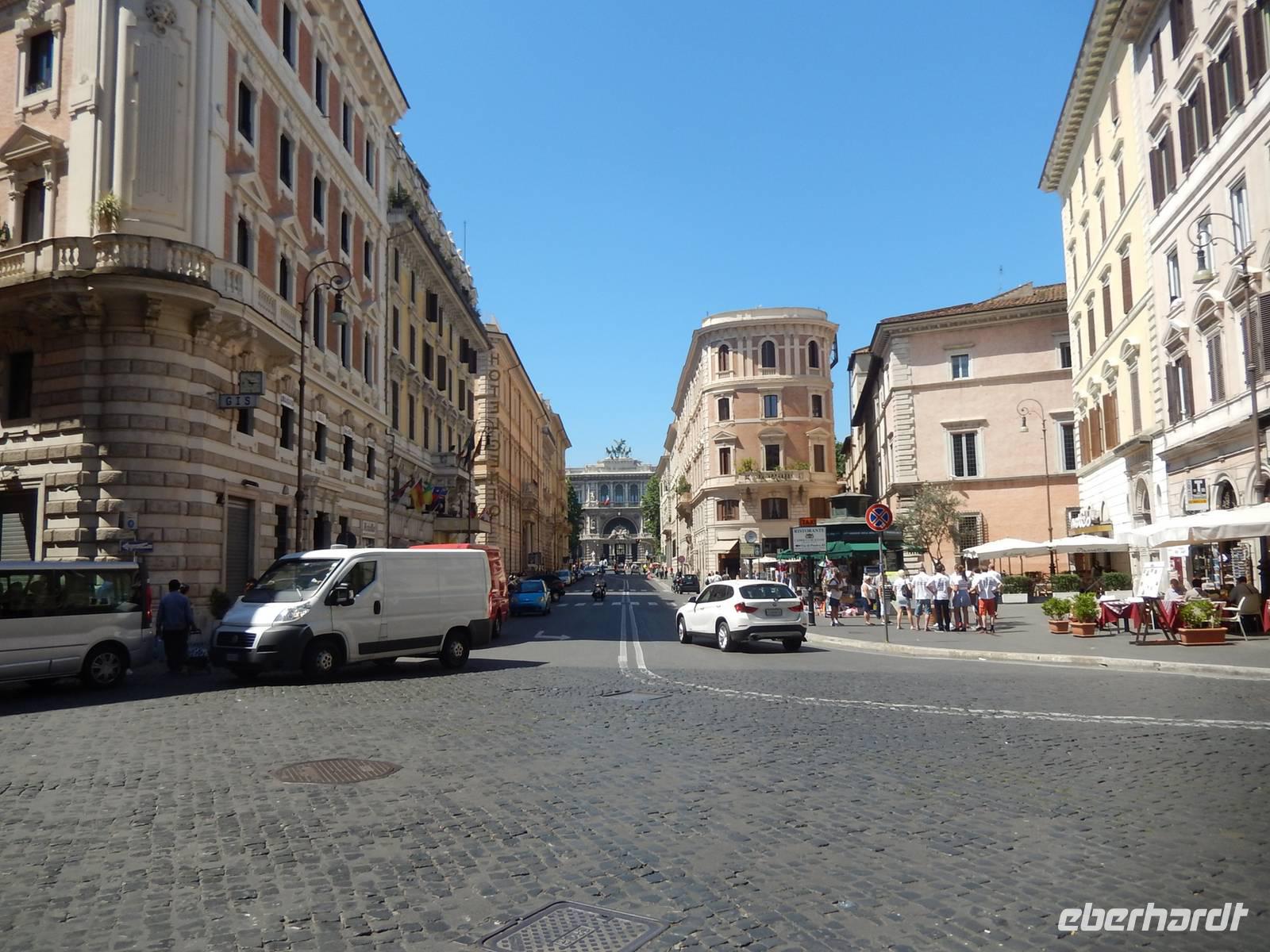 Während der 30km-Fahrt konnten wir einen ersten Eindruck von Roms Außenbezirken bekommen und war der Himmel bei unserer Ankunft schon stark bewölk gewesen, so zog er sich immer mehr zu, je näher wir unserem Ziel kamen. Einige Kilometer vor dem Hotel dann empfing uns Rom mit einem wahren Wolkenbruch, ein extremer Starkregen setzte ein, der uns bis zum Hotel begleitete. Unser Fahrer fuhr mit dem Busausgang so nah an die rettende Hoteltür wie möglich, so dass wir fast trocken in das Grand Hotel Tiberio, unserem zuhause für die folgenden Tage, eintraten. Wir verabredeten uns für den frühen Abend um eine erste Erkundungstour zu starten und hofften, dass der Regen bis dahin nachlassen würde.