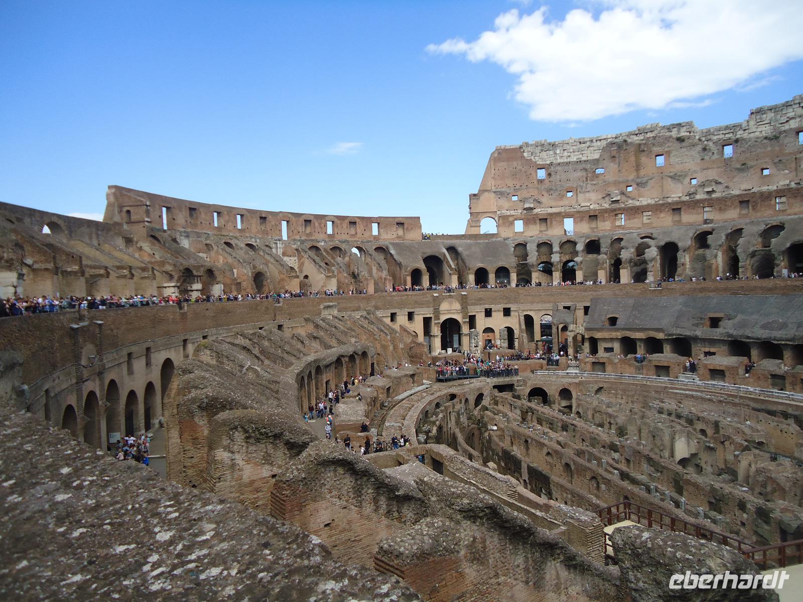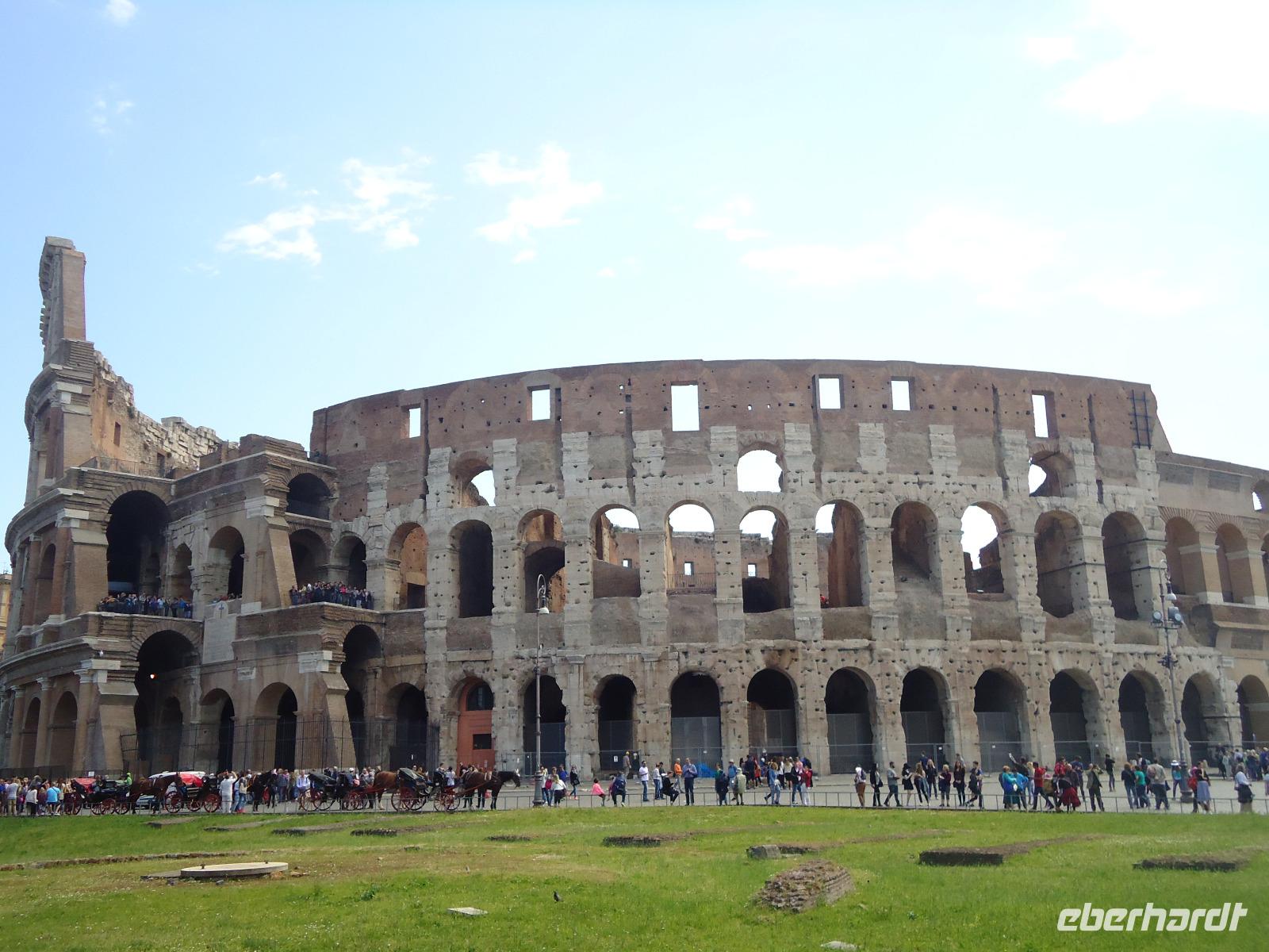 Mit der Metro geht es dann zum Kolosseum, dem größten Amphitheater der Römerzeit (die Zuschauerangaben schwanken zwischen 50.000 und 80.000), errichtet in nur acht Jahren, in der Zeit der flavischen Dynastie (72-80).Wir können es kaum glauben, nur acht Jahre Bauzeit für diesen Koloss! Dafür aber dauerte die Einweihungsfeier auch ein klein wenig länger - nämlich ganze 100 Tage!